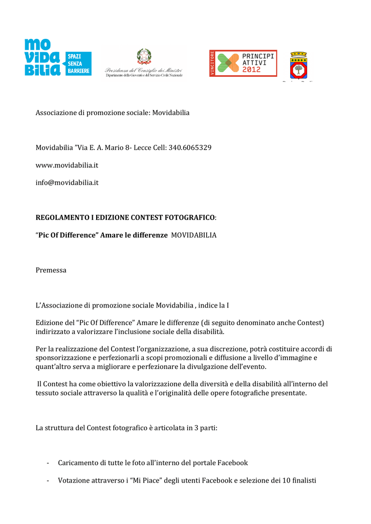 Associazione di promozione sociale: Movidabilia Movidabilia ”Via E. A. Mario 8-‐ Lecce Cell: 340.6065329 www.movidabilia.it [email protected] REGOLAMENTO I EDIZIONE CONTEST FOTOGRAFICO: “Pic Of Difference” Amare le differenze MOVIDABILIA Premessa L’Associazione di promozione sociale Movidabilia , indice la I Edizione del “Pic Of Difference” Amare le differenze (di seguito denominato anche Contest) indirizzato a valorizzare l’inclusione sociale della disabilità. Per la realizzazione del Contest l’organizzazione, a sua discrezione, potrà costituire accordi di sponsorizzazione e perfezionarli a scopi promozionali e diffusione a livello d’immagine e quant’altro serva a migliorare e perfezionare la divulgazione dell’evento. Il Contest ha come obiettivo la valorizzazione della diversità e della disabilità all’interno del tessuto sociale attraverso la qualità e l’originalità delle opere fotografiche presentate. La struttura del Contest fotografico è articolata in 3 parti: -‐ Caricamento di tutte le foto all’interno del portale Facebook -‐ Votazione attraverso i “Mi Piace” degli utenti Facebook e selezione dei 10 finalisti -‐ Votazione della giuria tecnica che selezionerà i tre finalisti e il vincitore REGOLAMENTO GENERALE Art. 1-‐ PREROGATIVE DI PARTECIPAZIONE Al Contest fotografico possono partecipare fotografi, professionisti del settore dell’immagine o amanti della fotografia che abbiano un’età minima di 18 anni utilizzando qualunque strumento fotografico e che abbiano regolarmente inviato tramite messaggio privato la loro opera fotografica sul portale facebook dell’Associazione (www.facebook.com/movidabilia) o mandando l’opera via mail a [email protected] Le opere fotografiche saranno valutate, in prima fase, dal numero dei “Mi Piace” dati da tutti gli utenti di facebook. Ai concorrenti spetta il compito di divulgare la propria opera all’interno della rete social per poter avere il maggior numero di “Mi Piace” e passare così alla fase successiva del contest. Le opere fotografiche dovranno essere libere da edizioni o brand pubblicitari. I concorrenti si assumono ogni responsabilità sulla paternità della propria opera L’iscrizione al contest avverrà tramite la pubblicazione dell’opera fotografica sul portale facebook dell’associazione: www.facebook.com/movidabilia Le iscrizioni al Concorso sono aperte a tutte le opere fotografiche che abbiano come tema “La diversità come risorsa” Non sono ammessi a partecipare coloro che sono vincolati da contratto editoriale. Art. 2 – TERMINI D’ISCRIZIONE Le opere fotografiche dovranno pervenire entro e non oltre: 20 Novembre 2014 Il concorso è libero da ogni onere economico ed è completamente gratuito per i concorrenti Art. 3 – MODALITA’ DI INVIO OPERA FOTOGRAFICA Al momento dell’ invio dell’opera (n. 1 opera fotografica) tramite messaggio privato sul portale facebook (www.facebook.com/movidabilia) , o via mail ([email protected]) pena l’esclusione, dovrà pervenire all’associazione i seguenti dati: -‐ Nome e cognome del titolare dell’opera da presentare al contest fotografico. -‐ Indirizzo mail e numero di cellulare del partecipante (tali dati NON verranno pubblicati o resi noti e verranno utilizzati solo ai fini del contest fotografico) -‐ Opera fotografica in un formato massimo di 6 MB -‐ La foto dovrà possedere un titolo (parola, frase, periodo) -‐ La foto può contenere una breve descrizione (facoltativa) L’opera fotografica inviata non potrà essere poi cambiata. Art. 3-‐Bis – MODALITA’ INSERIMENTO FOTO Al momento dell’inserimento dell’opera fotografica da parte dell’associazione sul portale facebook (www.facebook.com/movidabilia) , pena l’esclusione, il concorrente: -‐ Prende visione e accetta ogni parte del Regolamento del contest . -‐ Si assume la responsabilità civile e penale in caso di false dichiarazioni sulla paternità dell’opera Tutto il materiale inviato sarà preso in considerazione per l’organizzazione di una mostra fotoigrafica. Tutti i concorrenti verranno contattati per partecipare a tale evento Art. 4 – SPECIFICA DELLE OPERE FOTOGRAFICHE Per partecipare al contest il concorrente dovrà partecipare con 1 opera fotografica. L’opera fotografica dovrà rispondere alle caratteristiche sotto elencate: -‐ Avere attinenza con il tema “Amare le differenze” e in particolare valorizzare l’inclusione sociale dei ragazzi disabili -‐ Avere un peso massimo di 6 MB. -‐ Essere a colori o in b/n e possedere qualunque effetto fotografico -‐ Non contenere messaggi pubblicitari né parole o messaggi che offendano il comune senso del pudore, le persone, lo Stato, le Confessioni Religiose e le Pubbliche Istituzioni. Art. 5 – GIORNATE PER INVIARE LE OPERE FOTOGRAFICHE Le opere fotografiche dovranno pervenire tramite messaggio privato sul portale facebook dell’associazione (www.facebook.com/movidabilia ) oppure tramite e mail: [email protected] entro e non oltre il 20/11/2013 I concorrenti avranno 3 settimane di tempo dal 27/10/2014 al 20/11/2014 per far votare le proprie fotografie a gli utenti facebook attraverso i “Mi Piace”. Verranno selezionate le 5 foto che riceveranno il maggior numero di “Mi Piace”. Il giorno 20/11/2014 alle ore 24:00 Le votazioni si chiuderanno e la giuria tecnica avrà 5 giorni di tempo per selezionare i tre finalisti e decretare il vincitore Il punteggio dato ai 5 finalisti sarà la somma dei “Mi Piace” ottenuti più il punteggio della giuria tecnica. (Art. 6) Art. 6 – PUNTEGGIO -‐ Alle opere fotografiche verrà attribuito tale punteggio: 1 a 100 Mi Piace…………5 punti 200 a 300 Mi piace………8 punti 400 a 500 Mi piace………10 punti Oltre 600 Mi piace……….12 punti A tale punteggio si sommerà quello della giuria tecnica che sarà espresso in trentesimi /30 e verrà dato a discrezione della giuria tecnica. La giuria sarà composta da esperti 