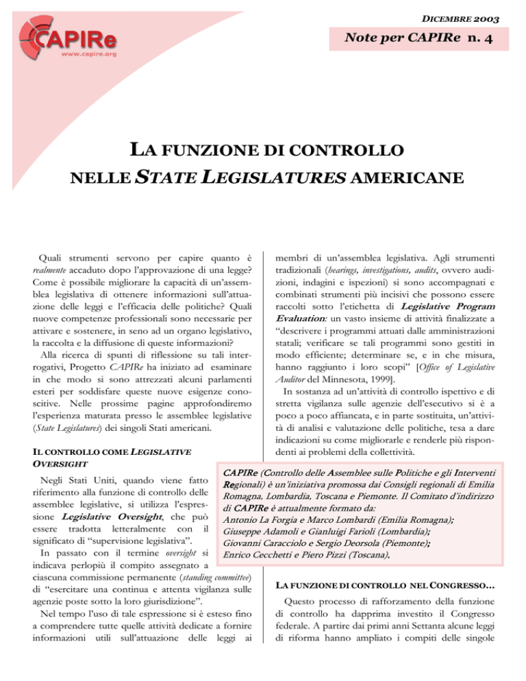 DICEMBRE 2003 Note per CAPIRe n. 4 LA FUNZIONE DI CONTROLLO NELLE STATE LEGISLATURES AMERICANE Quali strumenti servono per capire quanto è realmente accaduto dopo l’approvazione di una legge? Come è possibile migliorare la capacità di un’assemblea legislativa di ottenere informazioni sull’attuazione delle leggi e l’efficacia delle politiche? Quali nuove competenze professionali sono necessarie per attivare e sostenere, in seno ad un organo legislativo, la raccolta e la diffusione di queste informazioni? Alla ricerca di spunti di riflessione su tali interrogativi, Progetto CAPIRe ha iniziato ad esaminare in che modo si sono attrezzati alcuni parlamenti esteri per soddisfare queste nuove esigenze conoscitive. Nelle prossime pagine approfondiremo l’esperienza maturata presso le assemblee legislative (State Legislatures) dei singoli Stati americani. IL CONTROLLO COME LEGISLATIVE OVERSIGHT membri di un’assemblea legislativa. Agli strumenti tradizionali (hearings, investigations, audits, ovvero audizioni, indagini e ispezioni) si sono accompagnati e combinati strumenti più incisivi che possono essere raccolti sotto l’etichetta di Legislative Program Evaluation: un vasto insieme di attività finalizzate a “descrivere i programmi attuati dalle amministrazioni statali; verificare se tali programmi sono gestiti in modo efficiente; determinare se, e in che misura, hanno raggiunto i loro scopi” [Office of Legislative Auditor del Minnesota, 1999]. In sostanza ad un’attività di controllo ispettivo e di stretta vigilanza sulle agenzie dell’esecutivo si è a poco a poco affiancata, e in parte sostituita, un’attività di analisi e valutazione delle politiche, tesa a dare indicazioni su come migliorarle e renderle più rispondenti ai problemi della collettività. CAPIRe (C Controllo delle Assemblee sulle Politiche e gli Interventi Negli Stati Uniti, quando viene fatto Re Regionali) è un’iniziativa promossa dai Consigli regionali di Emilia riferimento alla funzione di controllo delle Romagna, Lombardia, Toscana e Piemonte. Il Comitato d’indirizzo assemblee legislative, si utilizza l’espres- di CAPIRe è attualmente formato da: sione Legislative Oversight, che può Antonio La Forgia e Marco Lombardi (Emilia Romagna);; essere tradotta letteralmente con il Giuseppe Adamoli e Gianluigi Farioli (Lombardia);; significato di “supervisione legislativa”. Giovanni Caracciolo e Sergio Deorsola (Piemonte);; In passato con il termine oversight si Enrico Cecchetti e Piero Pizzi (Toscana).. indicava perlopiù il compito assegnato a ciascuna commissione permanente (standing committee) LA FUNZIONE DI CONTROLLO NEL CONGRESSO… di “esercitare una continua e attenta vigilanza sulle agenzie poste sotto la loro giurisdizione”. Questo processo di rafforzamento della funzione Nel tempo l’uso di tale espressione si è esteso fino di controllo ha dapprima investito il Congresso a comprendere tutte quelle attività dedicate a fornire federale. A partire dai primi anni Settanta alcune leggi informazioni utili sull’attuazione delle leggi ai di riforma hanno ampliato i compiti delle singole La funzione di controllo nelle State Legislatures americane commissioni permanenti, aumentando fortemente l’attività di oversight svolta da ciascuna di esse e, nel contempo, hanno rinnovato il ruolo di alcune strutture che già operavano a supporto dell’assemblea. Ad esempio il General Accounting Office (GAO), creato nel 1921 come organo di revisione e controllo contabile, inizia fin dagli anni Sessanta a dedicare buona parte delle proprie risorse interne ad attività di valutazione di politiche. La composizione del personale del GAO cambia col tempo in modo radicale: si riducono nettamente gli assunti con una formazione giuridico-contabile e viene fatto massiccio ricorso a persone con specializzazione postlaurea in economia, statistica e analisi delle politiche. I cambiamenti avvenuti nella struttura del GAO, e il passaggio da una funzione di controllo contabile ad una di valutazione sull’attuazione e i risultati delle politiche, inducono anche ad un nuovo e più stretto rapporto con la committenza, cioè il Congresso. Mentre originariamente la quasi totalità del lavoro del GAO consisteva nell’esaminare “a tappeto” tutti i mandati di pagamento, oggi per oltre l’80% della sua attività il GAO agisce su richiesta diretta di singoli membri del Congresso o di commissioni parlamentari. Più o meno nello stesso periodo, il Congressional Research Service (CRS), istituito nel 1914 come servizio di documentazione e ricerca bibliografica a disposizione esclusiva dei membri del Congresso, cambia pelle e diviene una vera e propria “fabbrica di informazioni” a servizio dei singoli deputati e senatori. Oggi circa il 70% delle risorse interne del CRS vengono dedicate a funzioni che possono essere ascritte alla policy analysis e che vanno molto al di là della semplice attività di documentazione. Un esempio del prodotto tipico del CRS sono gli Issue Brief, documenti di 10/15 pagine destinati a mettere in luce gli aspetti principali di un certo tema di politica pubblica, le principali posizioni emerse in passato sul quel tema tra le forze politiche e le opinioni dominanti tra gli esperti in materia sulle questioni più tecniche [Martini, 1996]. di produrre, su richiesta di deputati e senatori locali, informazioni sulle politiche attuate a livello statale. La creazione delle strutture a supporto della funzione di controllo è stata una delle tappe qualificanti di un processo di rinnovamento nel modo di essere e di agire delle State Legislatures, avvenuto a partire dagli anni Settanta. Dopo un periodo di riflessioni sul ruolo degli organi legislativi statali, stimolate dalle critiche di alcuni studiosi che ne sottolineavano la debolezza istituzionale e ne rilevavano la sterilità decisionale [Burns, 1971], si sono cercate soluzioni di natura “strutturale”. Si è tentato di migliorare la qualit