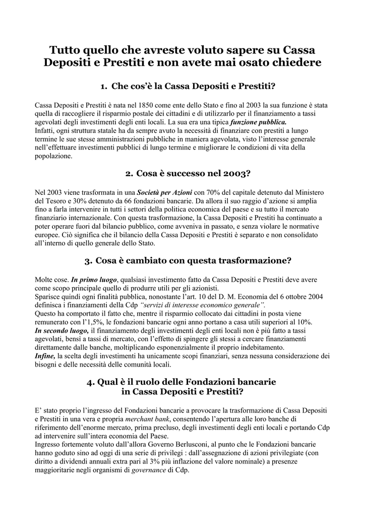 Tutto quello che avreste voluto sapere su Cassa Depositi e Prestiti e non avete mai osato chiedere 1. Che cos’è la Cassa Depositi e Prestiti? Cassa Depositi e Prestiti è nata nel 1850 come ente dello Stato e fino al 2003 la sua funzione è stata quella di raccogliere il risparmio postale dei cittadini e di utilizzarlo per il finanziamento a tassi agevolati degli investimenti degli enti locali. La sua era una tipica funzione pubblica. Infatti, ogni struttura statale ha da sempre avuto la necessità di finanziare con prestiti a lungo termine le sue stesse amministrazioni pubbliche in maniera agevolata, visto l’interesse generale nell’effettuare investimenti pubblici di lungo termine e migliorare le condizioni di vita della popolazione. 2. Cosa è successo nel 2003? Nel 2003 viene trasformata in una Società per Azioni con 70% del capitale detenuto dal Ministero del Tesoro e 30% detenuto da 66 fondazioni bancarie. Da allora il suo raggio d’azione si amplia fino a farla intervenire in tutti i settori della politica economica del paese e su tutto il mercato finanziario internazionale. Con questa trasformazione, la Cassa Depositi e Prestiti ha continuato a poter operare fuori dal bilancio pubblico, come avveniva in passato, e senza violare le normative europee. Ciò significa che il bilancio della Cassa Depositi e Prestiti è separato e non consolidato all’interno di quello generale dello Stato. 3. Cosa è cambiato con questa trasformazione? Molte cose. In primo luogo, qualsiasi investimento fatto da Cassa Depositi e Prestiti deve avere come scopo principale quello di produrre utili per gli azionisti. Sparisce quindi ogni finalità pubblica, nonostante l’art. 10 del D. M. Economia del 6 ottobre 2004 definisca i finanziamenti della Cdp “servizi di interesse economico generale”. Questo ha comportato il fatto che, mentre il risparmio collocato dai cittadini in posta viene remunerato con l’1,5%, le fondazioni bancarie ogni anno portano a casa utili superiori al 10%. In secondo luogo, il finanziamento degli investimenti degli enti locali non è più fatto a tassi agevolati, bensì a tassi di mercato, con l’effetto di spingere gli stessi a cercare finanziamenti direttamente dalle banche, moltiplicando esponenzialmente il proprio indebitamento. Infine, la scelta degli investimenti ha unicamente scopi finanziari, senza nessuna considerazione dei bisogni e delle necessità delle comunità locali. 4. Qual è il ruolo delle Fondazioni bancarie in Cassa Depositi e Prestiti? E’ stato proprio l’ingresso del Fondazioni bancarie a provocare la trasformazione di Cassa Depositi e Prestiti in una vera e propria merchant bank, consentendo l’apertura alle loro banche di riferimento dell’enorme mercato, prima precluso, degli investimenti degli enti locali e portando Cdp ad intervenire sull’intera economia del Paese. Ingresso fortemente voluto dall’allora Governo Berlusconi, al punto che le Fondazioni bancarie hanno goduto sino ad oggi di una serie di privilegi : dall’assegnazione di azioni privilegiate (con diritto a dividendi annuali extra pari al 3% più inflazione del valore nominale) a presenze maggioritarie negli organismi di governance di Cdp. 5. Ma non si era aperto un contenzioso tra Governo e Fondazioni bancarie? Dopo una prima proroga nel 2009, entro dicembre 2012 le Fondazioni bancarie avrebbero dovuto convertire le proprie azioni privilegiate in azioni ordinarie, versando la quota pari al valore attuale del 30% del capitale azionario in loro possesso. Il Governo, dopo aver valutato tale quota pari 4,4 miliardi, ha invece consentito –grazie anche ad un “parere” del Consiglio di Stato del 14 novembre scorso- alle Fondazioni bancarie di non pagare alcunché ora, scendendo al 16,7% e di acquistare successivamente azioni ordinarie fino a risalire al 20%, versando 750 milioni in quattro anni. Non solo : ha concesso loro di restituire solo il 50% degli extradividendi (240 invece di 480 milioni) e, dulcis in fundo, nella seduta di Consiglio di Amministrazione di Cdp del 19 dicembre 2012, ha modificato lo statuto di Cdp, stabilendo che il Presidente venga deciso dalle Fondazioni bancarie. Come si vede, si è trattato di un significativo danno erariale e di una resa incondizionata delle ragioni del pubblico alle pretese delle Fondazioni bancarie. 6. Quanti soldi gestisce la Cassa Depositi e Prestiti? Moltissimi. Infatti raccoglie il risparmio postale di oltre 12 milioni di famiglie di cittadini e lavoratori, che ammonta a 225 miliardi di euro. Per capirne la dimensione, basti pensare che il valore dell’insieme di tutte le banche private del nostro Paese non supera i 60 miliardi di euro. Si aggiunga poi che la Cassa si finanzia per altri 25 miliardi di euro direttamente sui mercati finanziari nella cosiddetta “gestione ordinaria”. 7. La Cassa Depositi e Prestiti partecipa a società? Alcune delle partecipazioni azionarie di Cassa Depositi e Prestiti sono dettate da una sorta di ruolo di “operatore per conto del Governo”. In questo senso, Cdp possiede il 26,4% di Eni, il 29,9% di Terna, il 30% di Snam Rete Gas e ha recentemente acquisito il 76% di Simest e il 100% di Fintecna e di Sace. Un insieme di partecipazioni del valore di oltre 30 miliardi, più del doppio del patrimonio netto di Cdp, tanto da comportare il richiamo da parte di Banca d’Italia. 8. Come opera la Cassa Depositi e Prestiti? Cassa Depositi e Prestiti opera attraverso diversi fondi di investimento, al punto da avere costruito una rete tentacolare di attività. I principali di questi sono : il Fondo Italiano per le infrastrutture (F2i); Cassa Depositi e Prestiti Investimenti Sgr; il Fondo Italiano d’investimento Sgr e il Fondo Strategico Italiano. 9. Cos’è il Fondo Italiano per le infrastrutture (F2i)? Il Fondo Italiano per le infrastrutture (F2i) nasce da un connubio tra Cdp (che possiede il 15,99%), Banca Infrastrutture Innovazione e Sviluppo (Biis) del Gruppo Intesa SanPaolo, Merril Lync