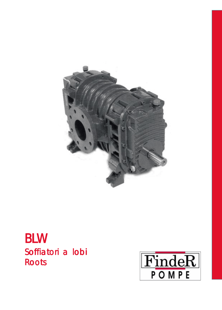 BLW Soffiatori a lobi Roots Generalità Description I compressori della serie BLW appartengono alla famiglia delle soffianti volumetriche, meglio conosciute nel campo applicativo come ROOTS, nome derivato dallo scopritore del principio di funzionamento. La caratteristica più saliente è quella di poter erogare una portata di gas praticamente costante al variare della pressione. Questa peculiarità, sommata al fatto che il gas pompato è esente da contaminazioni di qualsiasi natura, in quanto non c’e’ presenza di lubrificanti nella zona operativa dove avviene la compressione, ne fanno una macchina incontrastata nel campo di lavoro definito da rapporti di compressione fino a 2. Questa macchina è composta principalmente da un corpo in ghisa dentro il quale ruotano, senza attrito reciproco tra di loro e con il corpo, due rotori con profilo coniugato, sincronizzati tramite una coppia di ruote dentate elicoidali. Il corpo è chiuso alle sue estremità da due fianchi nei quali sono alloggiati i cuscinetti di sopportazione degli alberi porta rotori e i sistemi di tenuta del gas nelle zone di passaggio degli alberi. I cuscinetti e la coppia di ingranaggi sono lubrificati ad olio. La rumorosità di questi compressori e l’effetto pulsante della pressione sono particolarmente ridotti rispetto a quelli di macchine analoghe, in quanto i BLW sono dotati di rotori con profilo a tre cuspidi per aumentare la frequenza sonora di emissione e di un dispositivo interno che gradua lo scarico dei gas, riducendo drasticamente l’effetto backflow presente in macchine convenzionali con rotori a due cuspidi. La serie BLW prevede una gamma di 12 macchine, con bocche da 65 a 250 mm di diametro (2.1/2” – 10”) tutte previste per poter funzionare indifferentemente con l’asse delle bocche orizzontale o verticale, con senso di rotazione destro o sinistro. The BLW compressors belong to the famili of the volumetric (known also as Roots) blowers. Their main characteristic is to produce a constant flow of gas at different pressure, up to a compression ratio of 2. Another important feature is that the pumped gas does not get contaminated because there are no lubricants in the area in which the compression occurs. The blowers consist of a cast-iron casing in which two rotors with conjugate shape rotate and are synchronized by a set of helicoidal gears: during the rotation, there is no contact either between the two rotors or between the rotors and the casing. Two outboard and inboard sides close each casing: the bearings of the shaft and the sealing devices to avoid gas leakage are located there. The ball bearings and the gears are oil-lubricated. The noise and the pulsations are greatly limited because the BLW series have a three-lobe design which allows the increase of the noise frequency of the output of the gas, which reduces the back-flow in a remarkable way. The BLW series consist of 12 sizes with nozzles from 65 to 250 mm (2.1/2” to 10”) in diameter. All can operate, in relation to the axis of the nozzles, vertically or horizontally, indifferently. They can rotate clockwise or anticlockwise. Accessori Accessories Al fine di ottenere la minima rumorosità ed il massimo abbattimento delle pulsazioni di pressione, i soffiatori BLW possono essere corredati di appropriati smorzatori del tipo ad assorbimento diretto o del tipo reattivo, da installare a monte e a valle. Inoltre, su richiesta sono fornibili accessori quali misuratori di pressione e di temperatura, raccorderia varia, valvole di non ritorno, filtri e sistemi di insonorizzazione. As accessories to these machines, we supply different models of dampers; they are installed at both suction and discharge to reduce the noise and the pulsations. On request, we can supply indicators of pressure and temperature, various fittings, check valves, filters and noise protection devices, etc. Materiali Materials Particolare Part Materiale Materials Corpo Rotori Fianchi Coperchi Piedi Albero Sede tenuta Segmenti Ruote dentate Casing Rotors In-Outboard sides Covers Feet Shaft Seal seat bushing Snap rings Gears Ghisa grigia Ghisa grigia Ghisa grigia Ghisa grigia Ghisa grigia Acciaio al cromo Ghisa grigia Ghisa antiusura Acciaio al cromo cementato e temperato Cast iron Cast iron Cast iron Cast iron Cast iron Chrome steel Cast iron Antiwear cast iron Hardened and tempered chrome steel ASTM A278 cl. 275 (DIN GG25) ASTM A278 cl. 275 (DIN GG25) ASTM A278 cl. 275 (DIN GG25) ASTM A278 cl. 275 (DIN GG25) ASTM A278 cl. 275 (DIN GG25) ASTM A276 type 420 (DIN 1,4122) ASTM A278 cl. 275 (DIN GG25) GS3 Principio di funzionamento Operating principle Due rotori a tre lobi ruotano all’interno del corpo con senso di rotazione contraria; il loro movimento è sincronizzato da due ruote dentate con loro solidali. La configurazione geometrica coniugata del profilo dei due rotori permette di avere in ogni istante una generatrice in comune, lungo la quale gli stessi fanno tenuta reciproca grazie ad un gioco molto ridotto (punto C). I rotori utilizzati sui BLW sono a tre cuspidi per ridurre al minimo le pulsazioni di pressione. Alternativamente, durante la rotazione, una o due cuspidi di ciascun rotore viene teoricamente a contatto con la superficie interna del corpo, venendo così a delimitare una camera dove viene intrappolato il gas (camera V). Con il procedere della rotazione, il gas intrappolato tra due successive cuspidi di ciascun rotore, si sposta fino a convergere verso la posizione dove si apre la bocca di scarico S. The two three-lobe rotors rotate one opposite to the other, their movement is synchronized by a set of gears. The geometric configuration of the rotors allows them to have, at any moment, a generatrix in common; due to very low machining tolerances, this common generatrix acts also as a seal device for both rotors (point C). Instead of the traditional two-lobe design, the BLWs are three-lobes to reduce the pressure pulsations. During the operation, one or two lob