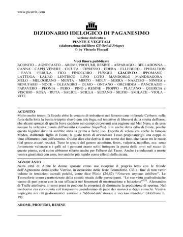 www.picatrix.com * DIZIONARIO IDELOGICO DI PAGANESIMO sezione dedicata a PIANTE E VEGETALI (elaborazione dal libro Gli Orti di Priapo) © by Vittorio Fincati Voci finora pubblicate ACONITO – AGNOCASTO – AROMI, PROFUMI, RESINE – ASPARAGO – BELLADONNA – CANNA – CAPELVENERE – CICUTA – CIPRESSO – EDERA – ELLEBORO – EPHIALTION – FAVA – FERULA – FICO – FINOCCHIO – FUNGHI – GIACINTO – IPPOMANE – LATTUGA – LAURO – LENTISCO – LINO – LOTO – MANDORLO – MANDRAGORA – MELO – MELOGRANO – MENTA – MIRTO – MOLY – MIRRA – NARCISO – NINFEA e NENUFARO – NOCE – OLEANDRO – OLMO – ONTANO – ORCHIDEA – PANCRAZIO – PAPAVERO – PEONIA – PERO – PINO e RESINE – PIOPPO – PLATANO – QUERCIA e VISCHIO – ROSA – RUTA – SALICE – SCILLA – SEDANO – SILFIO – SMILACE – VIOLA – VITE ACONITO Molto molto tempo fa Ercole ebbe la ventura di imbattersi nel famoso cane infernale Cerbero; nella furia della lotta la bestia tricipite sbavò con tale foga, nel tentativo di liberarsi dalla stretta dell'eroe, che alcuni spruzzi di quella bava caddero nei campi circostanti una regione sul Mar Nero, e da essa nacque la velenosa pianta dell'aconito (Aconitus Napellus). Era anche detta erba di Ecate, poiché questa lugubre divinità sarebbe stata la prima a farne uso. Esperta di veleni era anche la famosa Medea, d'altronde figlia di Ecate, la quale tentò di avvelenare Teseo propinandogli una coppa di vino affatturato con dell'aconito. Ovidio dice che deriva il suo nome dal fatto che nasce tra le rocce (dal greco aconè, roccia). Tutte le specie del genere aconitum, ferox, vulparia, napellus, ecc. sono fortemente velenose e i galli ed i germani erano soliti intingere la punta delle armi nel succo di queste piante, così come abbiamo riferito anche per l'albero del Tasso. Anche i condannati a morte veniva giustiziati con esso, trovandolo più rapido come effetto della cicuta. AGNOCASTO Nella città di Atene le donne sposate erano use ricoprire il proprio letto con le fronde dell’Agnocasto detto anche Vetrice, in occasione delle feste Tesmoforie. Ciò al fine di non venir indotte in tentazioni carnali poiché, come dice Plinio (24,62) “Venerem impetus inhibent”. Le Tesmoforie erano caratterizzate dalla castità rituale delle partecipanti. “Le sue virtù anafrodisiache vanno di pari passo con la sua efficacia nei fenomeni di mestruazione e lattazione”1[1]. Alessandro di Tralle attribuiva ai semi presi in pozione la proprietà di diminuire la produzione di sperma. Nel medioevo era conosciuta col trasparente pseudonimo di pepe dei monaci o degli eunuchi. Veniva impiegato nei riti gastromantici assieme a “abbondante storace e incenso maschio” (Alcifrone L. 19). AROMI, PROFUMI, RESINE www.picatrix.com Per Bachofen “la goccia di resina trasparente e viscosa, così odorosa nel fuoco, mostrava all’uomo la forza della potenza solare che si congiungeva con l’acqua”. L’alto significato religioso e l’uso rituale di essa, per Bachofen, sono da ricercasi negli accostamenti analogici che gli antichi facevano con il mondo divino. “Perciò alcuni alberi resinosi, come gli abeti bianchi e quelli rossi, sono particolarmente sacri a Dioniso (…). Per gli antichi, tutti i liquori di pregio con la forza del sole trae dai frutti della terra, sono lacrime della gente divinità della natura (…). Con la resina bella e splendente la natura piange lacrime di lutto sul destino di morte che governa il suo mondo”2[2]. Quest’interpretazione dello scrittore elvetico ci pare molto romantica e poco corrispondente ai principi simbolici che governano le associazioni analogiche degli antichi. Alle resine va attribuito un significato sessuale. D’altronde porsi nell’ottica di una natura che è destinata a morire vuol dire non inquadrare il vero pensiero degli antichi che nella morte vedevano un evento trasformativo, quindi proprio una perenne affermazione della vita. Una vita che si cercava di conservare il più pura possibile. Plutarco, nel suo scritto su ‘Iside e Osiride’ (372 D) riferisce che i sacerdoti egizi “bruciavano tre offerte al Sole: all’alba resina (incenso), a mezzogiorno mirra e al tramonto il cosiddetto ‘Kiphy’ “. tuttavia lo scrittore di Cheronea interpreta solo fisiologicamente il valore di questa triplice fumigazione (383 B): “L’atmosfera della quale e nella quale viviamo non mantiene sempre una composizione costante: di notte si raddensa e grava sul corpo, e porta l’anima alla depressione e all’ansia, rendendola vorrei dire fumosa e pesante. Per questo, non appena si alzano, essi subito bruciano della resina (incenso), e in questo modo migliorano l’aria e la purificano rendendola più leggera: lo spirito vitale che regge il nostro corpo viene così rianimato dal suo appassimento, in quanto l’odore della resina ha in sé qualcosa di intenso e di eccitante. A mezzogiorno poi, quando sentono che il sole aspira dalla terra un’esalazione densa e pesate e la mescola all’atmosfera, essi bruciano della mirra (…). Quello che conta è il potere aromatico della maggior parte degli ingredienti (del Kiphy), che sprigionano un dolce vapore e un’esalazione salutare: in questo modo l’aria si ricambia e il corpo, dolcemente cullato da questo piacevole alito, acquista una disposizione favorevole al sonno, mentre le tristezze e la tensione delle preoccupazioni quotidiane si allentano e si sciolgono come nodi”. Citando un passo perduto di Aristotele, Plutarco afferma che gli aromi, penetrando il cervello, che per sua natura sarebbe freddo e congelato (sic), giovano parimenti alla contemplazione, visto che essi sono di natura calda e dolce. Certo è innegabile l’effetto puramente fisico che gli aromi contro le epidemie ed infezioni oltre quello di modificare gli stati di coscienza e del comportamento. D’altronde gli stessi medici antichi, come Ichesio, sapevano che i profumi di rose, mirra e cotogne 