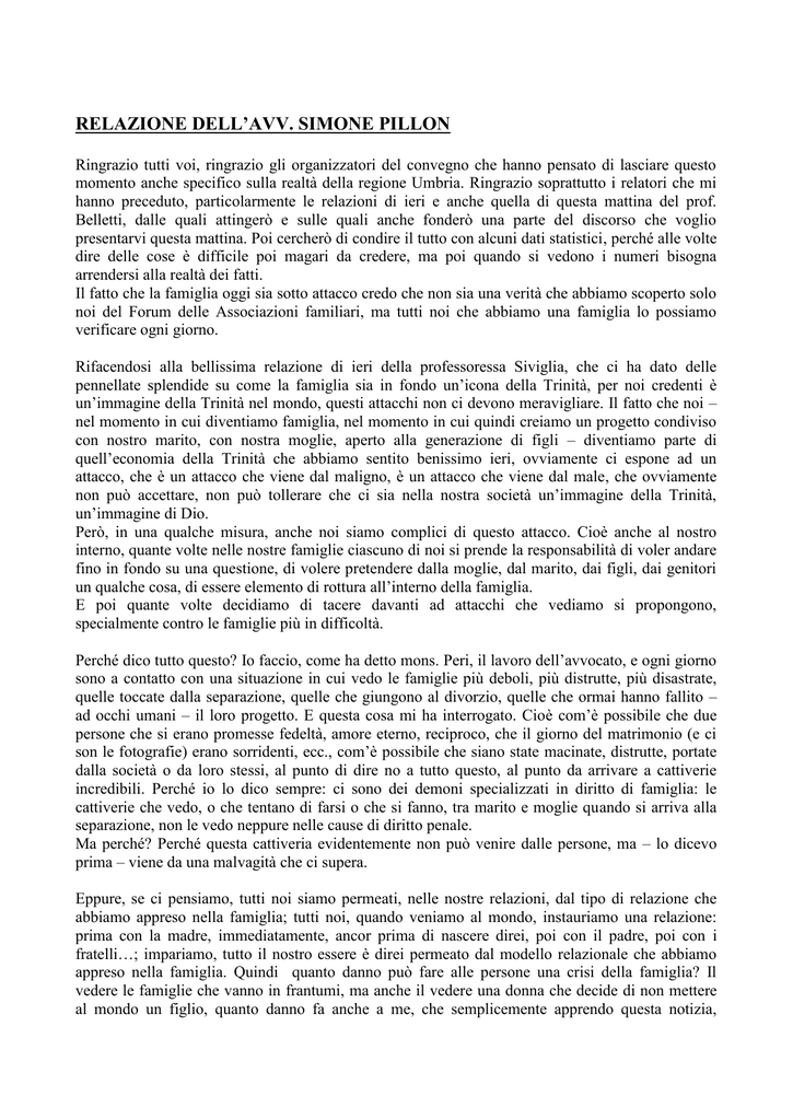 RELAZIONE DELL’AVV. SIMONE PILLON Ringrazio tutti voi, ringrazio gli organizzatori del convegno che hanno pensato di lasciare questo momento anche specifico sulla realtà della regione Umbria. Ringrazio soprattutto i relatori che mi hanno preceduto, particolarmente le relazioni di ieri e anche quella di questa mattina del prof. Belletti, dalle quali attingerò e sulle quali anche fonderò una parte del discorso che voglio presentarvi questa mattina. Poi cercherò di condire il tutto con alcuni dati statistici, perché alle volte dire delle cose è difficile poi magari da credere, ma poi quando si vedono i numeri bisogna arrendersi alla realtà dei fatti. Il fatto che la famiglia oggi sia sotto attacco credo che non sia una verità che abbiamo scoperto solo noi del Forum delle Associazioni familiari, ma tutti noi che abbiamo una famiglia lo possiamo verificare ogni giorno. Rifacendosi alla bellissima relazione di ieri della professoressa Siviglia, che ci ha dato delle pennellate splendide su come la famiglia sia in fondo un‟icona della Trinità, per noi credenti è un‟immagine della Trinità nel mondo, questi attacchi non ci devono meravigliare. Il fatto che noi – nel momento in cui diventiamo famiglia, nel momento in cui quindi creiamo un progetto condiviso con nostro marito, con nostra moglie, aperto alla generazione di figli – diventiamo parte di quell‟economia della Trinità che abbiamo sentito benissimo ieri, ovviamente ci espone ad un attacco, che è un attacco che viene dal maligno, è un attacco che viene dal male, che ovviamente non può accettare, non può tollerare che ci sia nella nostra società un‟immagine della Trinità, un‟immagine di Dio. Però, in una qualche misura, anche noi siamo complici di questo attacco. Cioè anche al nostro interno, quante volte nelle nostre famiglie ciascuno di noi si prende la responsabilità di voler andare fino in fondo su una questione, di volere pretendere dalla moglie, dal marito, dai figli, dai genitori un qualche cosa, di essere elemento di rottura all‟interno della famiglia. E poi quante volte decidiamo di tacere davanti ad attacchi che vediamo si propongono, specialmente contro le famiglie più in difficoltà. Perché dico tutto questo? Io faccio, come ha detto mons. Peri, il lavoro dell‟avvocato, e ogni giorno sono a contatto con una situazione in cui vedo le famiglie più deboli, più distrutte, più disastrate, quelle toccate dalla separazione, quelle che giungono al divorzio, quelle che ormai hanno fallito – ad occhi umani – il loro progetto. E questa cosa mi ha interrogato. Cioè com‟è possibile che due persone che si erano promesse fedeltà, amore eterno, reciproco, che il giorno del matrimonio (e ci son le fotografie) erano sorridenti, ecc., com‟è possibile che siano state macinate, distrutte, portate dalla società o da loro stessi, al punto di dire no a tutto questo, al punto da arrivare a cattiverie incredibili. Perché io lo dico sempre: ci sono dei demoni specializzati in diritto di famiglia: le cattiverie che vedo, o che tentano di farsi o che si fanno, tra marito e moglie quando si arriva alla separazione, non le vedo neppure nelle cause di diritto penale. Ma perché? Perché questa cattiveria evidentemente non può venire dalle persone, ma – lo dicevo prima – viene da una malvagità che ci supera. Eppure, se ci pensiamo, tutti noi siamo permeati, nelle nostre relazioni, dal tipo di relazione che abbiamo appreso nella famiglia; tutti noi, quando veniamo al mondo, instauriamo una relazione: prima con la madre, immediatamente, ancor prima di nascere direi, poi con il padre, poi con i fratelli…; impariamo, tutto il nostro essere è direi permeato dal modello relazionale che abbiamo appreso nella famiglia. Quindi quanto danno può fare alle persone una crisi della famiglia? Il vedere le famiglie che vanno in frantumi, ma anche il vedere una donna che decide di non mettere al mondo un figlio, quanto danno fa anche a me, che semplicemente apprendo questa notizia, quando nel mio interno, nel mio essere profondo sono intessuto, sono permeato – come abbiamo sentito ieri – sono quasi stampigliato come un‟immagine, sul modello della Trinità? Cercherò quindi questa mattina, insieme a voi, una breve disamina di questo attacco, anche per capirlo, per comprenderlo, e poi per metterci in campo e vedere se possiamo fare qualche cosa. Voglio fare una premessa che è fondamentale, vedo qui appunto tanti amici che si occupano di amministrazione, di salute, li ringrazio: quello che io dirò non vuole essere in alcun modo un puntare il dito contro qualcuno o contro qualcosa. Il mio discutere insieme a voi oggi, con i dati che adesso andremo a presentare, vuole essere semplicemente un prendere contatto con la realtà delle cose, e poi, insieme a chi la pensa come noi, almeno in parte, partire per costruire qualche cosa di più. 1) Penso che l‟attacco oggi alla famiglia abbia un primo aspetto, che è quello ideologico, che cerca cioè di colpire la natura della famiglia in quanto tale. Fino a qualche anno fa non ci si poneva neppure il problema su che cosa era la famiglia, su che cosa sia la famiglia. Oggi invece questo attacco profondo e destrutturante, a mio avviso, è anche il più subdolo, perché poi è causa di tutti gli altri, che andremo a vedere dopo, e pone l‟accento sulla natura stessa della famiglia. Tant‟è vero che non si parla più di famiglia ma di famiglie, perché – in base a quello che io ritengo, in base a come io la penso – posso costituire a mio piacimento un modello da gabellare, da far passare come famiglia, che però non è quello della famiglia che ciascuno di noi porta in sé. 2) Un secondo tipo di attacco è, direi, più pratico, è quello che accennavo prima, e cioè è un attacco all‟unità della famiglia. Perché quando io riesco a disgregare l‟unità della famiglia – ci ritorneremo poi su ognuno di questi punti – ho liberato delle energie negative forti