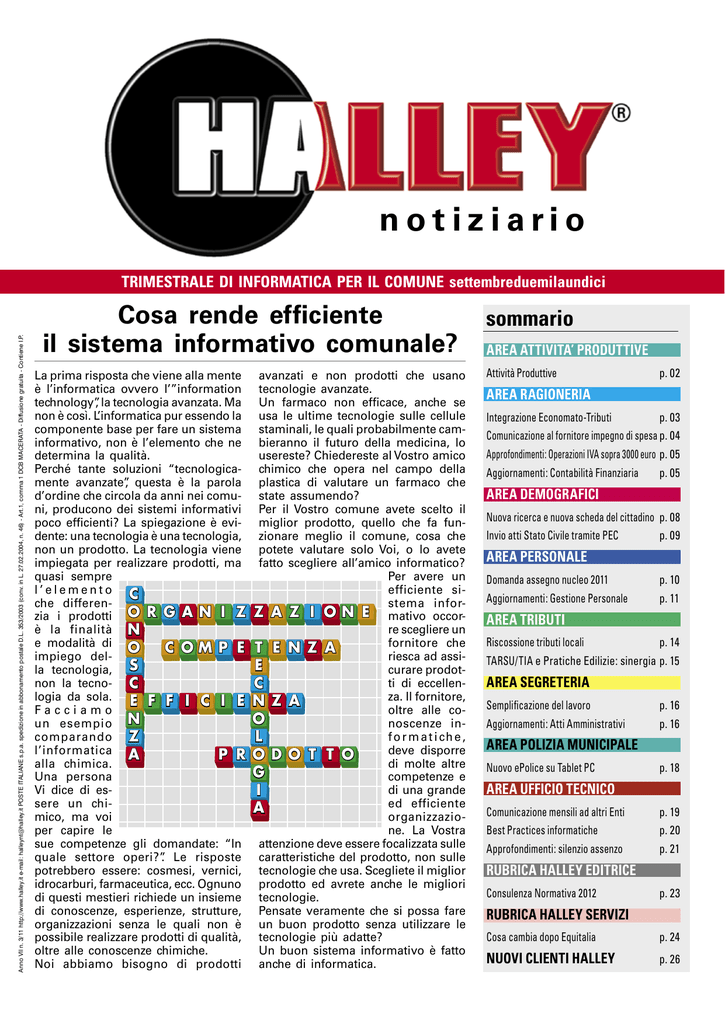 notiziario Anno VII n. 3/11 http://www.halley.it e-mail: [email protected] POSTE ITALIANE s.p.a. spedizione in abbonamento postale D.L. 353/2003 (conv. in L. 27.02.2004, n. 46) - Art.1, comma 1 DCB MACERATA - Diffusione gratuita - Contiene I.P. TRIMESTRALE DI INFORMATICA PER IL COMUNE settembreduemilaundici Cosa rende efficiente il sistema informativo comunale? La prima risposta che viene alla mente è l’informatica ovvero l’”information technology”, la tecnologia avanzata. Ma non è così. L’informatica pur essendo la componente base per fare un sistema informativo, non è l’elemento che ne determina la qualità. Perché tante soluzioni “tecnologicamente avanzate”, questa è la parola d’ordine che circola da anni nei comuni, producono dei sistemi informativi poco efficienti? La spiegazione è evidente: una tecnologia è una tecnologia, non un prodotto. La tecnologia viene impiegata per realizzare prodotti, ma quasi sempre l’elemento C che differenzia i prodotti O R G A N I Z è la finalità N e modalità di O C OM P E impiego delS la tecnologia, non la tecno- C logia da sola. E F F I C I E Facciamo un esempio N comparando Z l’informatica A P R alla chimica. Una persona Vi dice di essere un chimico, ma voi per capire le sue competenze gli domandate: “In quale settore operi?”. Le risposte potrebbero essere: cosmesi, vernici, idrocarburi, farmaceutica, ecc. Ognuno di questi mestieri richiede un insieme di conoscenze, esperienze, strutture, organizzazioni senza le quali non è possibile realizzare prodotti di qualità, oltre alle conoscenze chimiche. Noi abbiamo bisogno di prodotti avanzati e non prodotti che usano tecnologie avanzate. Un farmaco non efficace, anche se usa le ultime tecnologie sulle cellule staminali, le quali probabilmente cambieranno il futuro della medicina, lo usereste? Chiedereste al Vostro amico chimico che opera nel campo della plastica di valutare un farmaco che state assumendo? Per il Vostro comune avete scelto il miglior prodotto, quello che fa funzionare meglio il comune, cosa che potete valutare solo Voi, o lo avete fatto scegliere all’amico informatico? Per avere un efficiente sistema inforZ A Z I O N E mativo occorre scegliere un fornitore che T E N Z A riesca ad assiE curare prodotti di eccellenC za. Il fornitore, N Z A oltre alle coO noscenze inf o r m a t i ch e , L deve disporre O D O T T O di molte altre G competenze e di una grande I ed efficiente A organizzazione. La Vostra attenzione deve essere focalizzata sulle caratteristiche del prodotto, non sulle tecnologie che usa. Scegliete il miglior prodotto ed avrete anche le migliori tecnologie. Pensate veramente che si possa fare un buon prodotto senza utilizzare le tecnologie più adatte? Un buon sistema informativo è fatto anche di informatica. sommario AREA attivitA’ PRODUTTIVE Attività Produttive p. 02 AREA RAGIONERIA Integrazione Economato-Tributi p. 03 Comunicazione al fornitore impegno di spesap. 04 Approfondimenti: Operazioni IVA sopra 3000 euro p. 05 Aggiornamenti: Contabilità Finanziaria p. 05 AREA DEMOGRAfici Nuova ricerca e nuova scheda del cittadino p. 08 Invio atti Stato Civile tramite PEC p. 09 AREA personale Domanda assegno nucleo 2011 p. 10 Aggiornamenti: Gestione Personale p. 11 AREA TRIBUTI Riscossione tributi locali p. 14 TARSU/TIA e Pratiche Edilizie: sinergiap. 15 AREA SEGRETERIA Semplificazione del lavoro p. 16 Aggiornamenti: Atti Amministrativi p. 16 AREA POLIZIA MUNICIPALE Nuovo ePolice su Tablet PC p. 18 AREA UFFICIO TECNICO Comunicazione mensili ad altri Enti p. 19 Best Practices informatiche p. 20 Approfondimenti: silenzio assenzo p. 21 RUBRICA HALLEY EDITRICE Consulenza Normativa 2012 p. 23 RUBRICA HALLEY SERVIZI Cosa cambia dopo Equitalia p. 24 NUOVI CLIENTI HALLEY p. 26 02 area attività produttive www.halley.it Novità Commercio Attività Produttive: nuovo nome e nuove soluzioni applicative per la procedura Commercio In arrivo la nuova versione per le Attività Produttive (CM 06.00.00) che propone una nuova gestione per ogni attività dell’impresa, integra i servizi mancanti e offre la standardizzazione dei menu di lavoro e dell’interfaccia. Fig. 1: nuovo menu organizzato su tre livelli • Nuova procedura Ecco come si presenterà la nuova versione della procedura Attività Produttive (vedi fig. 1). Il menu mette subito in evidenza gli argomenti che verranno gestiti: le attività di ogni impresa, la gestione delle pratiche, i mercati e le fiere, la comunicazione verso altri Enti (regione, sportelli telematici e agenzie), l’estrazione di report in excel, e non ultimo un accesso diretto alla normativa e alla giurisprudenza, attraverso il collegamento al sito www.halleyconsulenza.it. • Imprese ed attività produttive Il cuore della procedura è rappresentato dalla gestione delle imprese e delle attività produttive (vedi fig. 2): è consentita la ricerca o la navigazione per attività e tipologie, o settori e specializzazioni; nella parte destra dello schermo si ha il dettaglio delle imprese e unità locali in cui vengono esercitate le singole attività, con la possibilità di filtrare ulteriormente la lista per ognuna delle colonne presenti. HALLEY NOTIZIARIO - settembre 2011 Fig. 2: gestione delle attività produttive ordinate per categorie Fig. 3: dettaglio dati dell’impresa Accedendo in consultazione ad un’impresa presente nella lista (vedi fig. 2) si ha evidenza di come essa è costituita (vedi fig. 3). In questo modo, all’operatore è consentito tenere sotto controllo lo stato di ogni impresa e intervenire in ogni singola attività o sede operativa, e se necessario correggere e implementare i dati. Dott. Marco Sabatinelli Resp. Area Attività Produttive www.halley.it area ragioneria 03 Novità Economato Nuova Integrazione: collegamento Economato - Tributi Ora è possibile emettere una bolletta di entrata in Economato e contemporaneamente registrare il pagamento nei Tributi. FIG. 1 L’integrazione all’interno del cedura Eco