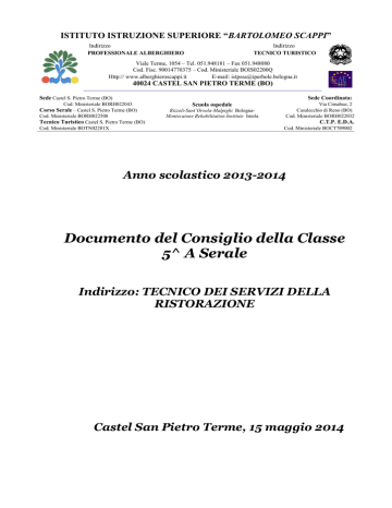 ISTITUTO ISTRUZIONE SUPERIORE “BARTOLOMEO SCAPPI” Indirizzo PROFESSIONALE ALBERGHIERO Indirizzo TECNICO TURISTICO Viale Terme, 1054 – Tel. 051.948181 – Fax 051.948080 Cod. Fisc. 90014770375 – Cod. Ministeriale BOIS02200Q Http:// www.alberghieroscappi.it E-mail: [email protected] 40024 CASTEL SAN PIETRO TERME (BO) Sede Castel S. Pietro Terme (BO) Sede Coordinata: Cod. Ministeriale BORH022043 Corso Serale – Castel S. Pietro Terme (BO) Cod. Ministeriale BORH022508 Tecnico Turistico Castel S. Pietro Terme (BO) Cod. Ministeriale BOTN02201X Scuola ospedale Rizzoli-Sant’Orsola-Malpighi BolognaMontecatone Rehabilitation Institute Imola Via Cimabue, 2 Casalecchio di Reno (BO) Cod. Ministeriale BORH022032 C.T.P. E.D.A. Cod. Ministeriale BOCT709002 Anno scolastico 2013-2014 Documento del Consiglio della Classe 5^ A Serale Indirizzo: TECNICO DEI SERVIZI DELLA RISTORAZIONE Castel San Pietro Terme, 15 maggio 2014 Indice: Conoscenze e competenze del tecnico dei servizi di ristorazione Elenco dei componenti del Consiglio di classe Elenco degli alunni Presentazione della classe La simulazione delle prove d’esame: date Metodi generali d’insegnamento (dal POF) La valutazione (dal POF) Programmi disciplinari: Italiano Storia Legislazione Alimenti ed alimentazione Francese Inglese Matematica EGAR LOGSR Firme dei componenti del Consiglio di classe. 2 3 4 5 6 7 9 11 12 14 17 18 20 22 24 26 29 Allegati: 1. 2. 3. 4. 5. 6. 7. 8. 9. Testi di simulazione di prima prova Schede di valutazione Testi di simulazione di seconda prova Schede di valutazione Testi di simulazione di terza prova Schede di valutazione Scheda di valutazione del colloquio. Progetto alternanza scuola-lavoro. Estratto del verbale n°1 del 27.05.99 in cui si sono definiti i criteri per l’attribuzione del Credito Formativo 1 Conoscenze e competenze del TECNICO DEI SERVIZI DI RISTORAZIONE ( dal P.O.F.) Poiché il Tecnico dei Servizi di ristorazione potrà assumere livelli di responsabilità che possono essere anche elevati, egli dovrà possedere buone conoscenze culturali, tecniche e organizzative rispetto all’intero settore. Egli potrà anche assumere in proprio l’esercizio dell’impresa essendo a conoscenza delle basi operative dell’amministrazione. Avrà specifiche competenze nel campo dell’approvvigionamento e del controllo di qualità delle derrate. Avrà competenze nella produzione e distribuzione dei pasti, nell’allestimento di buffet e di banchetti, nell’organizzazione del lavoro e nella guida di un gruppo e delle sue relazioni con gruppi di altri servizi. ALTERNANZA SCUOLA-LAVORO Specializzazione in: ENOGASTRONOMIA TERRITORIALE Competenze di accesso al percorso: Il progetto è rivolto a tutti gli allievi della suddetta classe. Non è prevista alcuna selezione. Attività - L’attività formativa relativa al corso in oggetto è stata di 90 ore, totalmente svolte presso le aziende ristorative del territorio che hanno ospitato gli alunni per il periodo di stage concordato. Tale attività ha permesso agli studenti di progettare e proporre, come risultato di quanto visto e appreso durante tale periodo di formazione-lavoro, una preparazione del territorio rielaborata e interpretata secondo le proprie conoscenze e sensibilità. - La valutazione del lavoro svolto durante tale periodo di formazione aziendale è stata ottenuta dalle osservazioni e pareri espressi dal Tutor aziendale attraverso la mediazione e valutazione del responsabile interno del progetto. 2 Elenco dei componenti del Consiglio della classe V A serale Docente Materia Ore Sett. La Terra Bellina Rosario Italiano - Storia 3+2 Stinchi Mario Giulio Legislazione 2 Musumeci Domenica Alimenti e Alimentazione 2 Soglia Sandra Francese 3 Fiasché Giuseppina Inglese 3 Giampietro Nadia Matematica 3 Palazzo Angelo EGAR 4 Leonardi Loris LOGSR 6 3 Elenco degli alunni Alunni 1. BELIOGLOV MIRELA 2. BERSANETTI LORENZO 3. BURGHELEA SERGIU 4. CAVAZZINI SARLA 5. COSTA ERICA 6. GALEOTTI SIMONE 7. GNUDI ALESSANDRO 8. KASSIMY LOUBNA 9. KOVALYOVA NADIYA 10. MARZOLA CLAUDIO 11. NANNONI ROBERTO 12. RICCI NICO 13. ROCCA FABRIZIO Luogo e data di nascita MOLDOVA (EE) 09/07/1992 BOLOGNA (BO) 14/05/1992 MOLDAVIA (EE) 01/02/1990 BOLOGNA (BO) 03/04/1992 IMOLA (BO) 03/05/1973 CASTEL S. PIETRO TERME (BO) 27/07/1987 BOLOGNA (BO) 09/04/1979 MAROCCO (EE) 16/05/1989 UCRAINA (EE) 13/06/1977 BOLOGNA (BO) 11/04/1990 CASTEL S. PIETRO TERME (BO) 14/07/1994 BOLOGNA (BO) 03/01/1990 CASTEL S. PIETRO TERME (BO) 01/10/1991 4 PROFILO DELLA CLASSE V A serale La classe è formata da alunni di diversa provenienza e con alle spalle differenti percorsi scolastici. Quattro di loro sono già in possesso di un diploma di maturità ed hanno quindi usufruito di crediti scolastici nelle materie precedentemente studiate. Tre alunni sono stranieri, due stanno completando il percorso scolastico iniziato nel paese di origine ed un’alunna, in possesso di laurea, lo sta rifacendo ora, ma con un indirizzo diverso. Due alunni provengono dal diurno, uno bocciato l’hanno scorso all’esame di stato e l’altro non ammesso, sempre all’esame di stato, alcuni anni fa. Completano il gruppo classe due alunni italiani che hanno compiuto tutto il percorso di studi di scuola superiore da noi al serale; l’uno aveva precedentemente frequentato all’estero per alcuni anni una scuola superiore, l’altro, in possesso della sola licenza media, ha seguito tutto il percorso scolastico da noi al serale. Infine due alunni hanno smesso di frequentare pur non essendosi ritirati. Di fronte a questa diversità di percorsi formativi ed esperienze, i docenti hanno cercato di adeguare le loro strategie d’insegnamento per valorizzare al meglio le buone capacità e conoscenze di alcuni e per superare le fragilità emerse in altri, soprattutto laddove si richiedeva la messa in atto di abilità pregresse. Naturalmente, essendo il corso serale un percorso formativo ridotto nei tempi rispetto al diurno, ci si è concentrati sui nodi focali 