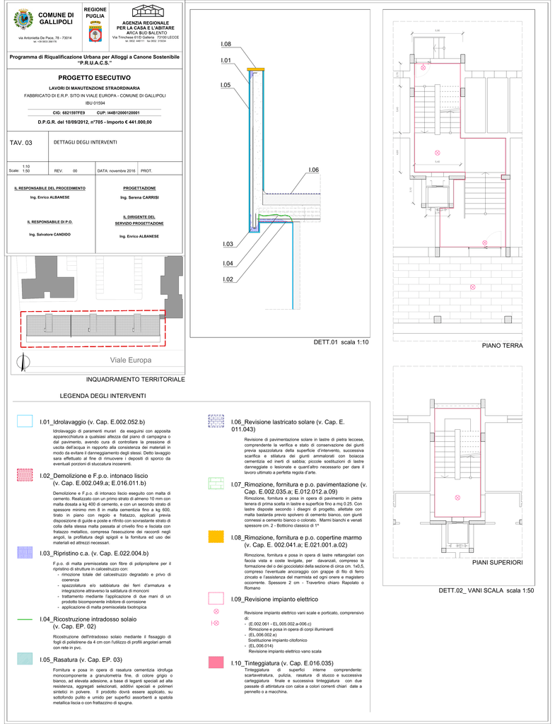 COMUNE DI GALLIPOLI REGIONE PUGLIA AGENZIA REGIONALE PER LA CASA E L'ABITARE 5,90 ARCA SUD SALENTO Via Trinchese 61/D Galleria 73100 LECCE via Antonietta De Pace, 78 - 73014 tel. 0832 446111 tel. +39 0833 266176 fax 0832 315034 I.01 2,70 Programma di Riqualificazione Urbana per Alloggi a Canone Sostenibile I.08 PROGETTO ESECUTIVO I.05 LAVORI DI MANUTENZIONE STRAORDINARIA FABBRICATO DI E.R.P. SITO IN VIALE EUROPA - COMUNE DI GALLIPOLI CIG: 6821597FE9 CUP: I44B12000120001 DETTAGLI DEGLI INTERVENTI 4,60 TAV. 03 5,40 IBU 01594 5,40 REV. 00 DATA: novembre 2016 I.06 PROT. IL RESPONSABILE DEL PROCEDIMENTO PROGETTAZIONE Ing. Enrico ALBANESE Ing. Serena CARRISI 3,10 1:10 Scale: 1:50 2,70 IL DIRIGENTE DEL IL RESPONSABILE DI P.O. SERVIZIO PROGETTAZIONE Ing. Salvatore CANDIDO Ing. Enrico ALBANESE I.03 I.04 I.02 DETT.01 scala 1:10 PIANO TERRA INQUADRAMENTO TERRITORIALE LEGENDA DEGLI INTERVENTI I.01_Idrolavaggio (v. Cap. E.002.052.b) Idrolavaggio di paramenti murari da eseguirsi con apposita apparecchiatura a qualsiasi altezza dal piano di campagna o dal pavimento, avendo cura di controllare la pressione di uscita in rapporto alla consistenza dei materiali in modo da evitare il danneggiamento degli stessi. Detto lavaggio sara effettuato al fine di rimuovere i depositi di sporco da eventuali porzioni di stuccatura incoerenti. I.02_Demolizione e F.p.o. intonaco liscio (v. Cap. E.002.049.a; E.016.011.b) Demolizione e F.p.o. di intonaco liscio eseguito con malta di cemento. Realizzato con un primo strato di almeno 10 mm con malta dosata a kg 400 di cemento, e con un secondo strato di spessore minimo mm 8 in malta cementizia fino a kg 600, tirato in piano con regolo e fratazzo, applicati previa disposizione di guide e poste e rifinito con sovrastante strato di colla della stessa malta passata al crivello fino e lisciata con fratazzo metallico, compresa l'esecuzione dei raccordi negli angoli, la profilatura degli spigoli e la fornitura ed uso dei materiali ed attrezzi necessari. I.03_Ripristino c.a. (v. Cap. E.022.004.b) F.p.o. di malta premiscelata con fibre di polipropilene per il ripristino di strutture in calcestruzzo con: - rimozione totale del calcestruzzo degradato e privo di coerenza - spazzolatura e/o sabbiatura dei ferri e integrazione attraverso la saldatura di monconi - trattamento mediante di due mani di un prodotto bicomponente inibitore di corrosione - applicazione di malta premiscelata tixotropica I.04_Ricostruzione intradosso solaio (v. Cap. EP. 02) Ricostruzione dell'intradosso solaio mediante il fissaggio di fogli di polistirene da 4 cm con l'utilizzo di profili angolari armati con rete in pvc. I.05_Rasatura (v. Cap. EP. 03) Fornitura e posa in opera di rasatura cementizia idrofuga monocomponente a granulometria fine, di colore grigio o bianco, ad elevata adesione, a base di leganti speciali ad alta resistenza, aggregati selezionati, additivi speciali e polimeri sintetici in polvere. Il prodotto essere applicato, su sottofondo pulito e umido per superfici assorbenti a spatola metallica liscia o con frattazzino di spugna. I.06_Revisione lastricato solare (v. Cap. E. 011.043) Revisione di pavimentazione solare in lastre di pietra leccese, comprendente la verifica e stato di conservazione dei giunti previa spazzolatura della superficie successiva scarifica e stilatura dei giunti ammalorati con boiacca cementizia ed inerti di sabbia; piccole sostituzioni di lastre danneggiate o lesionate e necessario per dare il I.07_Rimozione, fornitura e p.o. pavimentazione (v. Cap. E.002.035.a; E.012.012.a.09) Rimozione, fornitura e posa in opera di pavimento in pietra tenera di prima scelta in lastre e superficie fino a mq 0.25. Con lastre disposte secondo i disegni di progetto, allettate con malta bastarda previo spolvero di cemento bianco, con giunti connessi a cemento bianco o colorato. Marmi bianchi e venati spessore cm. 2 - Botticino classico di 1^ I.08_Rimozione, fornitura e p.o. copertine marmo (v. Cap. E. 002.041.a; E.021.001.a.02) Rimozione, fornitura e posa in opera di lastre rettangolari con faccia vista e coste levigate, per davanzali, compreso la formazione del o dei gocciolatoi della sezione di circa cm. 1x0,5, compreso ancoraggio con grappe di filo di ferro zincato e del marmista ed ogni onere e magistero occorrente. Spessore 2 cm - Travertino chiaro Rapolato o Romano I.09_Revisione impianto elettrico Revisione impianto elettrico vani scale e porticato, comprensivo di: - (E.002.061 - EL.005.002.a-006.c) Rimozione e posa in opera di corpi illuminanti - (EL.006.002.e) Sostituzione impianto citofonico - (EL.006.014) Revisione impianto elettrico vano scala I.10_Tinteggiatura (v. Cap. E.016.035) Tinteggiatura di superfici interne comprendente: scartavetratura, pulizia, rasatura di stucco e successiva carteggiatura finale e successiva tinteggiatura con due passate di attintatura con calce a colori correnti chiari date a pennello o a macchina. PIANI SUPERIORI DETT.02_ VANI SCALA scala 1:50