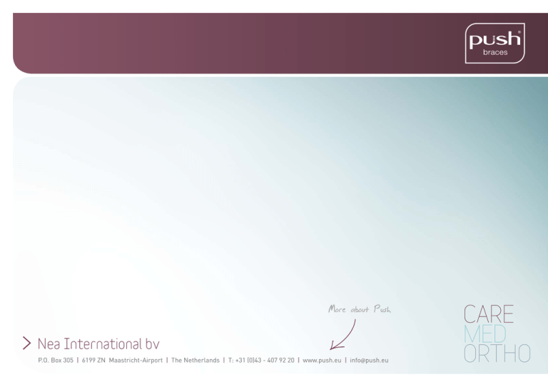 More about Push > Nea International bv P.O. Box 305 | 6199 ZN Maastricht-Airport | The Netherlands | T: +31 (0)43 - 407 92 20 | w ww.push.eu | [email protected] CARE MED ORTHO care/med/ortho 15:45 E’ ora di tornare alla libertà di movimento ore PUSH FOR FREEDOM 02 03 CARE/MED/ORTHO 06 > CAVIGLIA 10 > POLLICE 13 > POLSO 10:15 E’ ora di tornare alla libertà di movimento 14 > GINOCCHIO ore 18 > SCHIENA 20 > COLLO 22 > GOMITO 24 > SPALLA PUSH FOR FREEDOM I DISTURBI ARTICOLARI NON DOVREBBERO MAI IMPEDIRE L’ATTIVITÀ FISICA: questo è il messaggio che vogliamo dare a chi ama ciò che fa, e lo vuole fare sempre più intensamente. Push garantisce la tua libertà di movimento, e la vita attiva che desideri. 04 05 PUSH FOR FREEDOM è sinonimo di movimento in libertà, il movimento che tutti vogliono : è più facile di quanto si pensi, basta solo avere gli strumenti giusti, ad esempio tutori di elevata qualità. Indossando il corretto tutore, si incrementa la capacità di carico delle articolazioni, aumentandone la mobilità e di conseguenza la libertà di movimento, con il risultato di riscoprire le potenzialità, dimenticando le limitazioni. TRE PROFILI La libertà di movimento rappresenta una sfida che Push affronta quotidianamente. Cosa ci spinge a farlo? Lo spiega il nostro slogan: Push for freedom! È per questo che ci impegniamo al massimo. Siamo alla costante ricerca della soluzione più adatta ad aumentare la capacità dell’apparato locomotore umano di affrontare gli sforzi. Insieme a medici e ricercatori sviluppiamo soluzioni che contribuiscano a migliorare la qualità della vita. Ovviamente ciascun tutore viene sottoposto a test approfonditi. Per noi la libertà di movimento inizia dal comfort e dalla praticità. In altre parole, chi utilizza un tutore può contare su prodotti facilmente indossabili, dall’aderenza perfetta e in grado di offrire un sostegno ottimale. Grazie agli innovativi materiali impiegati, efficacia e lunga durata sono garantite. Agendo come un’estensione del corpo, il tutore restituisce il piacere dell’attività fisica. Secondo Push anche l’estetica è di fondamentale importanza, perciò è stato curato con particolare attenzione il design, creando un prodotto dall’aspetto piacevole, da non dover nascondere o camuffare, bensì da percepire come incentivo a una maggiore mobilità e a una vita attiva. I TUTORI PUSH RISPONDONO EFFICACEMENTE A UNA AMPIA GAMMA DI ESIGENZE TERAPEUTICHE; LA LINEA DI TUTORI, TUTTI CARATTERIZZATI DA UN DESIGN MODERNO E ACCATTIVANTE, SI SUDDIVIDE IN CARE, MED E ORTHO CARE Mantenimento della funzione MED Riabilitazione funzionale ORTHO Compensazione funzionale MANTENIMENTO DELLA FUNZIONE Push Care è pensato per chi è limitato nella libertà di movimento quotidiana da disturbi o lesioni di lieve entità. Ogni prodotto è caratterizzato da un elevato grado di efficacia, comfort e qualità. Grazie alla regolazione della pressione, Push Care allevia il dolore e migliora la sensazione di stabilità, ed è estremamente facile da utilizzare. RIABILITAZIONE FUNZIONALE Push Med offre soluzioni per il trattamento e la prevenzione di lesioni all’apparato locomotore. Alleviando il dolore, Push Med aumenta la capacità di carico dell’articolazione. Supporto meccanico, compressione regolabile e aderenza ottimale sono gli elementi che, in combinazione perfetta, determinano questo risultato. COMPENSAZIONE FUNZIONALE Push Ortho è il tutore ideale in caso di danni o ridotte capacità funzionali dell’apparato locomotore, quando diventa determinante l’adeguato supporto meccanico. Push Ortho può dare un contributo fondamentale al riposizionamento e alla stabilizzazione della parte interessata, compensando la perdita funzionale. SYMPRESS™ Sympress™ deriva dalla contrazione di Sympathetic Compression. Il rivestimento interno, caratteristica unica dei tutori Push, è costituito da un tessuto in microfibra che presenta diversi vantaggi: • l’impareggiabile morbidezza, che trasmette a chi lo indossa una sensazione di comfort e protezione. • la proprietà della microfibra di lasciar traspirare l’umidità in eccesso mantenendo la pelle perfettamente asciutta. • l’elasticità e lo spessore ridotto rendono Sympress™ il tessuto ideale per essere impiegato in combinazione con altri materiali: - abbinato a Lycra, Sympress™ offre una compressione ben distribuita e una ottima vestibilità - in combinazione con elementi in schiuma, Sympress™ consente di creare zone di comfort in punti delicati - con inserti in silicone, Sympress™ garantisce un’ottima aderenza alla pelle, stimolando la propriocezione. 06 07 Versioni: destra e sinistra CARE Cavigliera MISURA 1 2 3 4 5 >Indicazioni d’uso > Lievi distorsioni > Modeste infiammazioni capsulari > Lieve instabilità della caviglia (con carico leggero) > Lieve instabilità della caviglia (con carico leggero) La cavigliera Push Care comprime la zona intorno all’articolazione della caviglia, migliorandone la sensazione di stabilità. La compressione è regolabile secondo le proprie esigenze. La cavigliera ha una calzata perfetta e si adatta praticamente a tutte le calzature. Intorno ai punti sensibili della caviglia sono. Applicati cuscinetti imbottiti per offrire piacevoli zone di comfort. CIRCONFERENZA 26 - 29 29 - 32 32 - 35 35 - 38 38 - 41 Versioni: destra e sinistra MISURA 1 2 3 4 5 CIRCONFERENZA 26 - 29 29 - 32 32 - 35 35 - 38 38 - 41 MED Cavigliera >Indicazioni d’uso includono: > Instabilità (residua) moderata > Trattamento di lesioni acute dei legamenti laterali della caviglia (alternativa al bendaggio) sistema di bloccaggio del tallone integrato > T rattamento di fratture stabili della caviglia (frattura isolata del malleolo laterale, tipo Weber A) > Trattamento secondario delle fratture della caviglia (incluse le fratture di Jones) > Trattamento post-chirurgico di lesioni dei legamenti o fratture > prevenzione secondaria di lesioni ai legamenti della caviglia (in cas