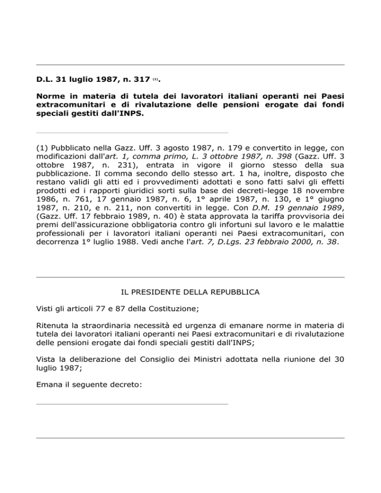 D.L. 31 luglio 1987, n. 317 (1) . Norme in materia di tutela dei lavoratori italiani operanti nei Paesi extracomunitari e di rivalutazione delle pensioni erogate dai fondi speciali gestiti dall'INPS. (1) Pubblicato nella Gazz. Uff. 3 agosto 1987, n. 179 e convertito in legge, con modificazioni dall'art. 1, comma primo, L. 3 ottobre 1987, n. 398 (Gazz. Uff. 3 ottobre 1987, n. 231), entrata in vigore il giorno stesso della sua pubblicazione. Il comma secondo dello stesso art. 1 ha, inoltre, disposto che restano validi gli atti ed i provvedimenti adottati e sono fatti salvi gli effetti prodotti ed i rapporti giuridici sorti sulla base dei decreti-legge 18 novembre 1986, n. 761, 17 gennaio 1987, n. 6, 1° aprile 1987, n. 130, e 1° giugno 1987, n. 210, e n. 211, non convertiti in legge. Con D.M. 19 gennaio 1989, (Gazz. Uff. 17 febbraio 1989, n. 40) è stata approvata la tariffa provvisoria dei premi dell'assicurazione obbligatoria contro gli infortuni sul lavoro e le malattie professionali per i lavoratori italiani operanti nei Paesi extracomunitari, con decorrenza 1° luglio 1988. Vedi anche l'art. 7, D.Lgs. 23 febbraio 2000, n. 38. IL PRESIDENTE DELLA REPUBBLICA Visti gli articoli 77 e 87 della Costituzione; Ritenuta la straordinaria necessità ed urgenza di emanare norme in materia di tutela dei lavoratori italiani operanti nei Paesi extracomunitari e di rivalutazione delle pensioni erogate dai fondi speciali gestiti dall'INPS; Vista la deliberazione del Consiglio dei Ministri adottata nella riunione del 30 luglio 1987; Emana il seguente decreto: 1. Obbligatorietà delle assicurazioni sociali per i lavoratori italiani operanti all'estero . (2) 1. I lavoratori italiani operanti all'estero, in Paesi extracomunitari con i quali non sono in vigore accordi di sicurezza sociale, alle dipendenze dei datori di lavoro italiani e stranieri di cui al comma 2, sono obbligatoriamente iscritti alle seguenti forme di previdenza ed assistenza sociale, con le modalità in vigore nel territorio nazionale, salvo quanto disposto dagli articoli da 1 a 5: a) assicurazione per l'invalidità, la vecchiaia ed i superstiti; b) assicurazione contro la tubercolosi; c) assicurazione contro la disoccupazione involontaria; d) assicurazione contro gli infortuni sul lavoro e le malattie professionali; e) assicurazione contro le malattie; f) assicurazione di maternità. 2. Sono tenuti ad osservare le disposizioni degli articoli da 1 a 5, per i lavoratori italiani assunti nel territorio nazionale o trasferiti da detto territorio per l'esecuzione di opere, commesse o attività lavorative in Paesi extracomunitari: a) i datori di lavoro residenti, domiciliati o aventi la propria sede, anche secondaria, nel territorio nazionale; b) le società costituite all'estero con partecipazione italiana di controllo ai sensi dell'articolo 2359, primo comma, del codice civile; c) le società costituite all'estero, in cui persone fisiche e giuridiche di nazionalità italiana partecipano direttamente, o a mezzo di società da esse controllate, in misura complessivamente superiore ad un quinto del capitale sociale; d) i datori di lavoro stranieri. 3. Le disposizioni di cui al comma 1 si applicano anche nel caso di assunzione di lavoratori italiani in Paesi extracomunitari . (3) 4. [I lavoratori italiani che sono disponibili a svolgere attività all'estero devono iscriversi in apposita lista di collocamento tenuta dall'ufficio regionale del lavoro del luogo di residenza, il quale rilascia il nulla osta all'assunzione che può avvenire con richiesta nominativa. L'iscrizione nella lista è compatibile con quella nella lista ordinaria di collocamento. Il lavoratore che stipula un contratto per l'estero può chiedere di mantenere l'iscrizione nella lista ordinaria] . (4) (2) Rubrica aggiunta dall'art. 1 della legge di conversione 3 ottobre 1987, n. 398. (3) Comma così sostituito dall'art. 1 della legge di conversione 3 ottobre 1987, n. 398. (4) Comma abrogato dalla lettera a) del comma 1 dell’ art. 18, D.Lgs. 14 settembre 2015, n. 151, a decorrere dal 24 settembre 2015, ai sensi di quanto disposto dal comma 1 dell’ art. 43 dello stesso D.Lgs. n. 151/2015. 2. Condizioni di lavoro dei lavoratori italiani da impiegare o da trasferire all'estero . (5) 1. Il contratto di lavoro dei lavoratori italiani da impiegare o da trasferire all'estero prevede: a) un trattamento economico e normativo complessivamente non inferiore a quello previsto dai contratti collettivi nazionali di lavoro stipulati dalle associazioni sindacali comparativamente più rappresentative per la categoria di appartenenza del lavoratore, e, distintamente, l'entità delle prestazioni in denaro o in natura connesse con lo svolgimento all'estero del rapporto di lavoro; b) la possibilità per i lavoratori di ottenere il trasferimento in Italia della quota di valuta trasferibile delle retribuzioni corrisposte all'estero, fermo restando il rispetto delle norme valutarie italiane e del Paese d'impiego; c) un'assicurazione per ogni viaggio di andata nel luogo di destinazione e di rientro dal luogo stesso, per i casi di morte o di invalidità permanente; d) il tipo di sistemazione logistica; e) idonee misure in materia di sicurezza. (5) Articolo prima modificato dall'art. 1 della legge di conversione 3 ottobre 1987, n. 398 e dall'art. 6, D.P.R. 18 aprile 1994, n. 346 e poi così sostituito dalla lettera b) del comma 1 dell’ art. 18, D.Lgs. 14 settembre 2015, n. 151, a decorrere dal 24 settembre 2015, ai sensi di quanto disposto dal comma 1 dell’ art. 43 dello stesso D.Lgs. n. 151/2015. 2-bis. Sanzioni. [1. Chiunque, operando in proprio o per conto terzi, svolge attività di mediazione per l'assunzione o il trasferimento fuori del territorio nazionale di lavoratori italiani in violazione dell'articolo 2, è punito con la reclusione da uno a cinque anni e, per ogni lavoratore reclutato, con la multa da lire due milioni a lire dieci milioni. 2. I datori di lavoro che, senza la prescritta