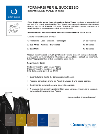 FORMARSI PER IL SUCCESSO Incontri EDEN MADE in sede Eden Made è la nuova linea di prodotto Eden Viaggi dedicata ai viaggiatori più esigenti. Per questi viaggiatori in Eden Viaggi esiste una divisione pronta a rispondere ad ogni tipo di richiesta. L’Oriente, l’America, gli Emirati, l’Africa profonda: la linea Eden Made non conosce confini, orizzonti e limiti. Incontri tecnici esclusivamente dedicati alle destinazioni EDEN MADE. Le date e le destinazioni previste: 1) Thailandia - Laos - Vietnam – Cambogia 24-25 Febbraio 2) Sud Africa - Namibia - Seychelles 10-11 Marzo 3) Stati Uniti 17-18 Marzo Ciascun incontro vedrà coinvolti gli Uffici del Turismo e i nostri corrispondenti sulla destinazione per fornirvi tutte le informazioni, gli aneddoti e i dettagli più importanti. Eden Viaggi presenterà tutto il suo reparto Eden Made. Logistica dei Corsi: Sede dell’incontro: Eden Viaggi Pesaro Inizio dell’incontro: mercoledì ore 15:00 Fine dell’incontro: giovedi ore 14:00 Durante tutta la durata del Corso sarete nostri ospiti. Possono partecipare anche più Agenti di Viaggio di una stessa agenzia. Ogni incontro terminerà con una piacevole sorpresa. A chiusura delle prime tre pratiche Eden Made verranno rimborsate le spese documentate di trasferimento a Pesaro. (segue modulo di partecipazione) Modulo di partecipazione Scegli i corsi a cui partecipare: ☐ Thailandia - Laos - Vietnam – Cambogia ☐ Sud Africa - Namibia – Seychelles ☐ Stati Uniti Nome_Cognome_____________________________________data di nascita___/___/__ Nome_Cognome_____________________________________data di nascita___/___/__ Nome_Cognome_____________________________________data di nascita___/___/__ Agenzia____________________________________________CodiceEden___________ E-mail__________________________________________________________________ Timbro e firma del titolare__________________ Informativa ai sensi dell’art. 13 D. Lgs 196/2003 Eden Viaggi s.r.l. informa il richedente ai sensi dell ‘art. 13 del D. lgs. 196/2003, che i dati personali che lo riguardano, raccolti con la presente documentazione, saranno oggetto di trattamento in formato cartaceo e/o elettronico, per le finalità relative alla partecipazione dei Cordi di Formazione. Si precisa che il conferimento di tali dati è obbligatorio e che l’eventuale rifiuto, a fornire gli stessi, non consentirà l’iscrizione alla presente iniziativa. Si precisa altresì che previo suo consenso i suoi dati saranno utilizzati per finalità funzionali allo svolgimento delle attività svolte e dei servizi offerti da Eden Viaggi per la elaborazione statistica, la commercializzazione e l’invio di materiale pubblicitari/informativo/promozionale e di aggiornamento sui servizi di Eden s.r.l. E sue società controllanti, collegate e di terzi mediante telefono, posta ordinaria ed elettronica, internet e per l’assolvimento degli obblighi di legge. I suoi dati saranno resi disponibili agli incariucati preposti alle operazioni di trattamento di cui sopra. I suoi dati potranno altresì essere comunicati alle Società in rapporto di controllo e collegamento con Eden Viaggi s.r.l. nonchè a società operantoi nel turismo. L’elenco completo e aggiornato degli incaricati e delle società in rapporto di controllo e collegamento e delle aziende terze a cui i dati potranno esser comunicati, è disponibile a richiesta al numero 0721/4421. Ai sensi dell’art. 7 D. Lgs 196/2003, potrà esercitare i relativi diritti, tra cui consultare, modificare e cancellare i suoi dati o opporsi al loro trattamento scrivendo ad Eden viaggi s.r.l. Via degli abeti n. 24 61100 Pesaro. Titolare del trattamento è Eden Viaggi. Dichiarazione di consenso ai sensi dell’art. 25 D. Lgs 196/2003. Il sottoscritto dichiara che le informazioni suindicate corrispondono a verità e dichiara di aver avuto completa informativa ai sensi dell’art. 13 ed sprime il consenso al trattamento dei propri dati personali nei limiti e per le finalità di cui sopra. Il sottoscritto con la presente, autorizza espressamente ad ogni effetto di legge, la società Eden Viaggi a r.l. corrente in Pesaro, ad utilizzare per fini pubblicitari o per qualsivoglia altro scopo relativo ed attinente la propria attività, la fotografia /il filmato che mi ritrae durante i Corsi di Formazione. Eden Viaggi s.r.l. potrà utilizzare la/il suddetta/o fotografia/ filmato secondo le modalità che riterrà più utili ed opportune, nell’ambito di azioni pubblicitarie e promozionali e comunque per qualsivoglia altro scopo relativo ed attinente la propria attività, senza alcun limite in ordine all’ambito territoriale ed al tempo di impiego. Inoltre, il/la sottoscritto/a dichiara sin d’ora di approvare il contesto e le modalità dell’utilizzo suddetto nel quale verrà inserita/o la/il fotografia/ filmato sopra indicata/o. Il/la sottoscritto/a dichiara altresì di rilasciare la presente autorizzazione a titolo gratuito e di non avere nulla a pretendere da Eden Viaggi s.r.l. per l’utilizzo della/del fotografia/ filmato suddetta/o rinunciando, come in effetti rinuncia con la sottoscrizione della presente dichiarazione, ad ogni pretesa, diritto o azione relativi all’impiego della/del fotografia/filmato così come sopra indicato. Il/la sottoscritto/a si impegna ed obbliga a non concedere ad altre persone giuridiche, persone fisiche, enti o associazioni, il diritto di utilizzare, in qualunque forma, il ritratto fotografico/filmato sopra indicato. Il/la sottoscritto/a dichiara inoltre di avere ricevuto l’informativa di cui all’art. 13 del D.Lgs. 196/2003 e di rilasciare il consenso al trattamento dei dati personali, con particolare riferimento Firma__________________ Ti aspettiamo. EDEN Viaggi Team Inviare al numero di fax : 0721/442735