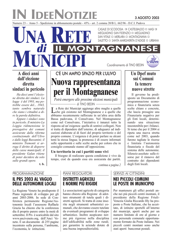 IN IDEENOTIZIE UNAdi RETE MUNICIPI 3 AGOSTO 2003 Numero 23 - Anno 5 - Spedizione in abbonamento postale - 45% - art. 2 comma 20/B L. 662/96 - D.C.I. Padova CASALE DI SCODOSIA CASTELBALDO MASI MEGLIADINO SAN FIDENZIO MEGLIADINO SAN VITALE MERLARA MONTAGNANA SALETTO SANTA MARGHERITA D’ADIGE URBANA IL MONTAGNANESE A dieci anni dall’elezione diretta sindaci in pericolo Ha dieci anni l’elezione diretta dei sindaci. La legge è del 1993, ma potrebbe essere del... 1943, tanto sembra naturale che siano i cittadini a dire la parola definitiva. Eppure i sindaci sono in pericolo. Il ministro La Loggia ridimensiona le prerogative dei comuni assicurate dalla riforma costituzionale dell’Ulivo e dalle leggi Bassanini; il ministro Tremonti si arroga il diritto di disporre delle casse municipali; il presidente Galan ritiene di poter decidere da solo sulle grandi opere. t. b. Coordinamento di TINO BEDIN C'È UN AMPIO SPAZIO PER L'ULIVO Nuova rappresentanza per il Montagnanese Potrà emergere alle prossime elezioni municipali L di TINO BEDIN a Rete dei Municipi aggiunge altre maglie a quelle che già esistono nel Montagnanese e a quelle che abbiamo recentemente rafforzate in un’altra area della Bassa padovana, il Conselvano. Nel Montagnanese come nel Conselvano, l’iniziativa è innanzi tutto la risposta ad un’esigenza: quella di sentirci collegati. Non si tratta di dipendere dall’esterno, di adeguarci ad indicazioni elaborate al di fuori del proprio territorio o del proprio comune. L’esigenza è di poter parlare su alcuni temi la stessa lingua; la premessa è di essere informati sulle opportunità e sulle scelte anche per coloro che in consiglio comunale stanno all’opposizione. Un territorio in cui i partiti sono vivi Il bisogno di realizzare questa condizione è vivo da tempo, cioè da quando essa era assicurata dai partiti. continua a pagina 2 Un Dpef muto sui Comuni fa temere nuove strette Il governo ha predisposto un Documento di programmazione economica e finanziaria senza scelte chiare e concrete, che lascia presagire una Finanziaria negativa per gli Enti locali, determinando una situazione insostenibile per i bilanci. Si teme che per il 2004 si ripeta una nuova stretta come nel 2003, quando furono tagliate le risorse e limitata l’autonomia finanziaria e fiscale del sistema delle autonomie. Silenzio assoluto sulle risorse per il rinnovo del contratto dei dipendenti degli Enti locali. PROGRAMMAZIONE PIANI REGOLATORI SERVIZI AI CITTADINI IL PRS 2003 AL VAGLIO DELLE AUTONOMIE LOCALI DISTRETTI AGRICOLI E NORME PIÙ RIGIDE NEI PICCOLI COMUNI LE POSTE IN MUNICIPIO La Regione Veneto ha predisposto il Piano regionale di sviluppo per gli anni 2003-2006. In sede di Conferenza permanente Regione/Autonomie locali l’assessore Raffaele Grazia ha chiesto che la conferenza dia il proprio parere entro la metà di settembre. Il Prs è scaricabile dal sito www.anciveneto.org, dell’Anci Veneto. È un documento di 255 pagine incentrato sulla persona, l’ambiente, l’economia, le istituzioni. Le associazioni agricole di categoria hanno chiesto alla Regione di adottare strumenti di tutela quali i distretti agricoli. Si tratta di zone inserite negli strumenti urbanistici comunali, che dovranno essere tutelate da eventuali programmi di sviluppo urbanistico. Inoltre auspicano norme più rigorose nella disciplina dell’edificabilità nelle zone rurali. per garantire le aziende dotate di una buona imprenditorialità. Per mantenere gli uffici postali anche nei più piccoli centri montani, il presidente della Regione FriuliVenezia Giulia Riccardo Illy ha proposto a Poste Italiane, che ha accettato, di istituire sportelli all’interno dei municipi, aperti anche per un numero limitato di ore al giorno e con personale comunale opportunamente formato da Poste italiane. Nei piccoli centri montani sono anche stati aperti bancomat postali. Una rete di municipi Il Montagnanese 2 Nessun impegno del governo sull’autonomia finanziaria Berlusconi e Tremonti hanno adottato, nei confronti dei Comuni, la tecnica del rinvio di qualsiasi impegno (anche di misure graduali). C’è silenzio sull’avvio di un sistema di compartecipazioni percentualizzate ai cespiti erariali (superando il metodo degli attuali trasferimenti statali). Nulla si sa sull’istituzione del Fondo perequativo. Il silenzio permane per quanto riguarda i problemi dei Comuni minori. Il Dpef non dice nulla sul superamento dei vincoli imposti nel 2003 agli Enti locali, sia per l’Irap che per l’addizionale facoltativa Irpef e sulla possibilità di poter decidere su imposte di scopo facoltative. Se le scelte del Governo ripropongono il taglio del 3% dei trasferimenti dovuti agli Enti locali ed impongono la limitazione dell’autonomia finanziaria e fiscale, non si aiuterà la ripresa economica, ma si verificheranno una diminuzione degli investimenti, il fallimento delle previsioni di aumento del Pil, il taglio per il welfare locale, per l’infanzia, gli anziani e la sanità. I criteri assurdi e punitivi del Patto di Stabilità 2003, hanno già impedito il potenziamento dei servizi sociali e dello sviluppo. Occorre un diverso atteggiamento, modificando i sistemi di calcolo delle spese e delle entrate, premiando le spese di carattere eccezionale (all’interno del pareggio di bilancio). Nuova rappresentanza per il Montagnanese continua da pagina 1 Resto convinto che dovrebbero essere ancora i partiti a tessere le idee e le esigenze di un territorio, fino a farne una rete. Ciò vale in particolare per il Montagnanese, dove il riferimento politico dei cittadini è relativamente forte rispetto ad altre zone della provincia di Padova. Questa caratteristica di radicamento politico è una delle due ragioni che ci hanno indotto a scegliere il Montagnanese quale area per la Rete dei Municipi. Intanto la mettiamo insieme noi, persone elette in diverse istituzioni repubblicane, svolgendo a livello locale un’azione anche per conto dei partiti. L’iniziati