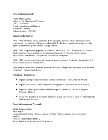 Informazioni personali: Nome: Maria Quercia Indirizzo: Via Maragliano 82 Firenze Cell: 3336442124 E-mail: [email protected] Nazionalità: italiana Data di nascita: 31/05/1968 Esperienza lavorativa: 1990 - 1998: istruttrice fitness all'interno di diversi centri, personal trainer domiciliare e nei centri stessi. I periodi estivi li impegnavo in qualità di educatrice motoria nei centri estivi o in qualità di animatrice sportiva presso villaggi turistici. 1998 - 2012: c/o palestra Equipeone sas di Maria Quercia & C. via C. Monteverdi 43, Firenze Ruolo: gestione sia amministrativa che più specificatamente rivolta alle attività motorie indirizzate ad una clientela , dal punto di vista dell'età, eterogenea. 2009 - 2013: esercizio professione di Osteopata presso la palestra Equipeone, da gennaio 2013 presso studio associato e ambulatorio. 2013: pubblicazione libro “Manuale pratico Esercizi per il riequilibrio funzionale della mediana vertebrale” . Editore Masterbooks Istruzione e Formazione: ● Diploma di ragioneria c/o l'Istituto tecnico commerciale 'Tito Acerbo' in Pescara. ● Diploma Isef presso l'Istituto Superiore Pareggiato di Educazione Fisica in Firenze. ● Diploma di Osteopata c/o la scuola di Osteopatia 'SIOTEMA' (iscritta al Registro Osteopati d'Italia ). ● Corso post-graduate di osteopatia pediatrica di due anni presso la OSD di Milano (Scuola di Osteopatia Tedesca). Capacità/competenze Personali: Madre lingua: italiano Altre lingue: Inglese (capacità lettura = buono, capacità scrittura = buono, capacità espressione orale = medio). Francese (medio/medio/medio), Spagnolo (elementare/elementare/elementare). Tempo libero: corsi di meditazione,yoga,pittura,lettura,film,viaggiare, musica,volontaria avanzata su servizi ambulanza per associazione territoriale (Humanitas Firenze). Maria Quercia