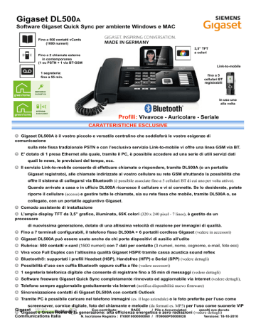 Gigaset DL500A Software Gigaset Quick Sync per ambiente Windows e MAC Fino a 500 contatti vCards (1000 numeri) 3,5” TFT a colori Fino a 2 chiamate esterne in contemporanea (1 su PSTN + 1 via BT-GSM Link-to-mobile 1 segreteria: fino a 55 min. fino a 5 cellulari BT registrabili In uso uno alla volta Profili: Vivavoce - Auricolare - Seriale CARATTERISTICHE ESCLUSIVE Gigaset DL500A è il vostro piccolo e versatile centralino che soddisferà le vostre esigenze di comunicazione sulla rete fissa tradizionale PSTN e con l’esclusivo servizio Link-to-mobile vi offre una linea GSM via BT. E’ dotato di 1 presa Ethernet alla quale, tramite il PC, è possibile accedere ad una serie di utili servizi dati quali le news, le previsioni del tempo, ecc. Il servizio Link-to-mobile consente di effettuare chiamate o rispondere, tramite DL500A (o un portatile Gigaset registrato), alle chiamate indirizzate al vostro cellulare su rete GSM sfruttando la possibilità che offre il sistema di collegarsi via Bluetooth (è possibile associate fino a 5 cellulari BT di cui uno per volta attivo). Quando arrivate a casa o in ufficio DL500A riconosce il cellulare e vi si connette. Se lo desiderate, potete riporre il cellulare (acceso) e gestire tutte le chiamate, sia su rete fissa che mobile, tramite DL500A o, se collegato, con un portatile aggiuntivo Gigaset. Comodo assistente di installazione L’ampio display TFT da 3,5” grafico, illuminato, 65K colori (320 x 240 pixel - 7 linee), è gestito da un processore di nuovissima generazione, dotato di una altissima velocità di reazione per immagini di qualità. Fino a 7 terminali configurabili, il telefono fisso DL500A + 6 portatili cordless Gigaset (vedere in accessori) Gigaset DL500A può essere usato anche da chi porta dispositivi di ausilio all’udito Rubrica: 500 contatti v-card (1500 numeri) con 7 dati per contatto (3 numeri, nome, cognome, e-mail, foto ecc) Viva voce Full Duplex con l’altissima qualità Gigaset HSP® tramite cassa acustica sound reflex Bluetooth®: supportati i profili Headset (HSP), Handsfree (HFP) e Serial (SPP) (vedere dettagli) Possibilità d’uso con cuffia Bluetooth oppure cuffia a filo (vedere accessori) 1 segreteria telefonica digitale che consente di registrare fino a 55 min di messaggi (vedere dettagli) Software freeware Gigaset Quick Sync completamente rinnovato ed aggiornabile via Internet (vedere dettagli), Telefono sempre aggiornabile gratuitamente via Internet (notifica disponibilità nuovo firmware) Sincronizzazione contatti di Gigaset DL500A con contatti Outlook Tramite PC è possibile caricare nel telefono immagini (es. il logo aziendale) o le foto preferite per l’uso come screensaver, cornice digitale, foto del chiamante e melodie (da formati es. MP3) per l’uso come suonerie VIP Gigaset Eco-contributo: RAEE / Pile e Accumulatori assolti ove dovuto Gigaset è Green Home di 2a generazione: alta efficienza energetica e zero radiazioni (vedere dettagli) Communications Italia N. Iscrizione Registro : IT08010000000060 / IT09060P00000028 Versione: 18-10-2010 Gigaset DL500A Software Gigaset Quick Sync per ambiente Windows e MAC Per informazioni e supporto tecnico è disponibile il Servizio Clienti Gigaset: 199.15.11.15 GIGASET E’ MADE IN GERMANY: PROGETTAZIONE - PRODUZIONE - QUALITA’ Fabbrica certificata TUV: ISO 9001 (Sistema Qualità) ISO 14001 (Sistema di Gestione Ambientale) Conforme alle Direttive Europee (ove applicabili): CE (R&TTE) RAEE, RoHS, Batterie e accumulatori ErP (Ecodesign), Reach, Copia della dichiarazione integrale di conformità può essere scaricata in ogni momento dal sito www.gigaset.com/docs oppure richiesta al servizio clienti Gigaset QUALITA’ GARANTITA: dal marchio GIGASET (made in Germany) dal numero del NOTIFY BODY accanto al MARCHIO CE che identifica il sistema di (Garanzia Qualità Totale) GIGASET E’: DESIGN - INNOVAZIONE - RISPETTO DELL’AMBIENTE - QUALITA’ Gigaset Communications Italia Eco-contributo: RAEE / Pile e Accumulatori N. Iscrizione Registro : IT08010000000060 / IT09060P00000028 assolti ove dovuto Versione: 18-10-2010 Gigaset DL500A Software Gigaset Quick Sync per ambiente Windows e MAC Identificazione – Colore: Black Gigaset EAN CODICE DL500A - 4250366 815190 - S30853-H3103-K101 Standard, Protocolli, Interfacce DECT/GAP/Bluetooth/F-SMS (protocollo1) /CLIP/ CNIP/ HSP/Ethernet/a-b analogica Portata, Connessioni, Configurazioni Portata: fino a 50/300 m; (interno/esterno) ampliabile collegando uno o più Gigaset Repeater Interfaccia per connessione via: linea telefonica analogica PSTN**** GSM: 5 cellulari registrabili, attivo uno per volta in collegamento via Bluetooth con il telefono-base 1 Connessione Ethernet (NON per VoIP) Comfort d’uso Telefono multifunzione flessibile ed elegante Comoda funzione di ricerca dei portatili registrati Viva voce di altissima qualità (v. caratteristiche Audio) Rubriche e selezione Rubrica interna fino a 500 v-card (1500 numeri): Ogni v-card può memorizzare fino a 7 campi contenenti: numero telefonico di casa, ufficio, cellulare, nome e cognome, indirizzo e-mail, ricorrenza, eventuale foto del chiamante; ogni voce può avere una propria melodia anche con configurazione VIP e Picture-Clip Tastiera ergonomica: grandi tasti ben distanziati Numeri grossi sul display durante la selezione 6 tasti configurabili (es. Flash, Calendario ecc) Modalità di selezione: controllata (inserire il numero, verificarne la correttezza sul display e poi selezionare) oppure tradizionale (sentire prima il tono di linea) Selezione facilitata di numeri telefonici Ripetizione automatica della chiamata Lista di ripetizione ultimi 20 numeri (diversi) chiamati 8 numeri a chiamata rapida (tasti da 2 a 9) Funzione Intercomunicante tra interni Ricezione chiamate Segnalazione chiamata acustica e visiva tramite: Misure, Pesi, Imballi Foto del chiamante per ogni voce della rubrica** Display e tasto vivavoce illuminati Dati del telefono-base Gigaset DL500A dimensioni in mm (sp