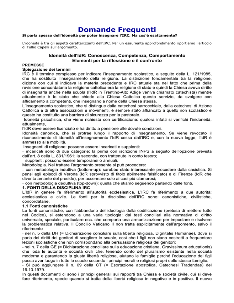 Domande Frequenti Si parla spesso dell'idoneità per poter insegnare l'IRC. Ma cos'è esattamente? L'idoneità è tra gli aspetti caratterizzanti dell'IRC. Per un esauriente approfondimento riportiamo l'articolo di Tullio Capelli sull'argomento. Idoneità dell'IdR: Conoscenza, Competenza, Comportamento Elementi per la riflessione e il confronto PREMESSE Spiegazione dei termini IRC è il termine complesso per indicare l’insegnamento scolastico, a seguito della L. 121/1985, che ha sostituito l’insegnamento della religione. La distinzione fondamentale tra la religione, dizione con cui si indicava la materia precedente e IRC attuale sta nel fatto che prima della revisione concordataria la religione cattolica era la religione di stato e quindi la Chiesa aveva diritto di insegnarla anche nella scuola (l’IdR in Trentino-Alto Adige veniva chiamato catechista) mentre attualmente è lo stato che chiede alla Chiesa Cattolica questo servizio, da svolgere con affidamento a competenti, che insegnano a nome della Chiesa stessa. L’insegnamento scolastico, che si distingue dalla catechesi parrocchiale, dalla catechesi di Azione Cattolica e di altre associazioni e movimenti, è sempre stato affiancato a quello non scolastico e questo ha costituito una barriera di sicurezza per la pastorale. Idoneità psicofisica, che viene richiesta con certificazione: qualora infatti si verifichi l’inidoneità, attualmente, l’IdR deve essere licenziato e ha diritto a pensione alle dovute condizioni. Idoneità canonica, che si protrae lungo il rapporto di insegnamento. Se viene revocato il riconoscimento di idoneità all’insegnamento l’IdR cessa dall’IRC e, con la nuova legge, l’IdR è ammesso alla mobilità. Insegnanti di religione: possono essere incaricati e supplenti: – incaricati sono di due categorie: la prima con iscrizione INPS a seguito dell’opzione prevista dall’art. 8 della L. 831/1961; la seconda, con trattenute in conto tesoro; – supplenti: possono essere temporanei o annuali. Metodologia. Nel trattare l’argomento presente si può procedere: – con metodologia induttiva (bottom-up): sarebbe stato interessante procedere dalla casistica. Si pensi agli episodi di Verona (IdR sprovvisto di titolo abilmente falsificato) e di Firenze (IdR che diventa amante del preside), per accennare solo ai casi più clamorosi; – con metodologia deduttiva (top-down): quella che stiamo seguendo partendo dalle fonti. 1. FONTI DELLA DISCIPLINA IRC L’IdR in genere fa riferimento all’autorità ecclesiastica. L’IRC fa riferimento a due autorità: ecclesiastica e civile. Le fonti per la disciplina dell’IRC sono: canonistiche, civilistiche, concordatarie. 1.1 Fonti canonistiche Le fonti canonistiche, con l’abbandono dell’ideologia della codificazione (pretesa di mettere tutto nel Codice), si estendono a una varia tipologia: dai testi conciliari alla normativa di diritto universale, speciale, particolare ecc. che comporta una armonizzazione per impostare e risolvere la problematica relativa. Il Concilio Vaticano II non tratta esplicitamente dell’argomento, salvo il riferimento - nel n. 5 della DH (= Dichiarazione conciliare sulla libertà religiosa, Dignitatis Humanae), dove si parla dei diritti dei genitori di scegliere le scuole, così che i figli non siano costretti a frequentare lezioni scolastiche che non corrispondano alla persuasione religiosa dei genitori; - nel n. 7 della GE (= Dichiarazione conciliare sulla educazione cristiana, Gravissimum educationis) che loda le autorità e società civili che, tenendo conto del pluralismo esistente nella società moderna e garantendo la giusta libertà religiosa, aiutano le famiglie perché l’educazione dei figli possa aver luogo in tutte le scuole secondo i principi morali e religiosi propri delle stesse famiglie. - Si può aggiungere il n. 69 della CT (= Esortazione apostolica, Catechesi Tradendae) del 16.10.1979. In questi documenti ci sono i principi generali sui rapporti tra Chiesa e società civile, cui si deve fare riferimento, specie quando si tratta della libertà religiosa in negativo e in positivo. Il nuovo Codice di Diritto Canonico (can. 331, sul Romano Pontefice e, specialmente per l’IRC, i cann. 804 e 805) con riferimento alle scuole cattoliche e non, statali e non. Si tratta di disposizioni di principio che vanno integrate con le disposizioni delle Conferenze Episcopali e degli Ordinari locali. La Costituzione Apostolica, Sapientia christiana del 15.04.1979 che riforma le università e facoltà ecclesiastiche; La Costituzione Apostolica, Pastor bonus del 1988 che, riformando la Curia, indica le competenze della Congregazione per l’educazione cattolica. Il Papa ha richiamato l’attenzione sul diritto alla libertà religiosa come quello a cui tutti gli altri diritti si connettono. Ecco il testo, che è in sintesi una puntualizzazione in merito alla libertà religiosa: “Un altro diritto fondamentale, sul quale a motivo delle sue frequenti violazioni nel mondo di oggi, ho dovuto ritornare, è quello alla libertà religiosa, riconosciuto sia dalla Dichiarazione universale dei diritti dell’uomo (art. 18) sia dall’Atto finale di Helsinki (1a,VII), sia dalla Convenzione sui diritti del fanciullo (art. 14). Ritengo, infatti, che il diritto alla libertà religiosa non sia semplicemente uno tra gli altri diritti umani, ma sia quello al quale tutti i diritti umani si connettono, perché la dignità della persona umana ha la sua prima fonte nel rapporto essenziale con Dio. In realtà il diritto alla libertà religiosa “è così strettamente legato agli altri diritti fondamentali, che si può sostenere, a giusto titolo, che il rispetto della libertà religiosa sia come un test per l’osservanza degli altri diritti fondamentali” ”(Insegnamenti di Giovanni Paolo II, vol. XII/1, 1989, p. 68; cf L’Osservatore Romano del 18.5.03, p. 5). 1.2. Fonti civilistiche Il sistema giuridico e amministrativo è complesso e in continuo di
