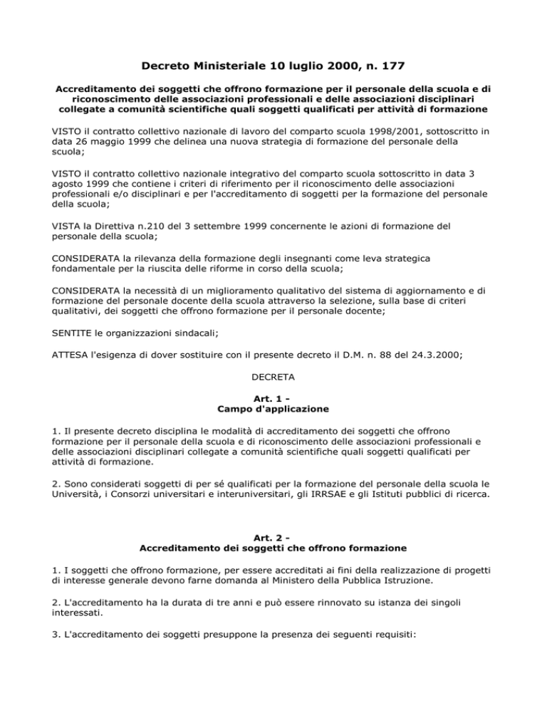 Decreto Ministeriale 10 luglio 2000, n. 177 Accreditamento dei soggetti che offrono formazione per il personale della scuola e di riconoscimento delle associazioni professionali e delle associazioni disciplinari collegate a comunità scientifiche quali soggetti qualificati per attività di formazione VISTO il contratto collettivo nazionale di lavoro del comparto scuola 1998/2001, sottoscritto in data 26 maggio 1999 che delinea una nuova strategia di formazione del personale della scuola; VISTO il contratto collettivo nazionale integrativo del comparto scuola sottoscritto in data 3 agosto 1999 che contiene i criteri di riferimento per il riconoscimento delle associazioni professionali e/o disciplinari e per l'accreditamento di soggetti per la formazione del personale della scuola; VISTA la Direttiva n.210 del 3 settembre 1999 concernente le azioni di formazione del personale della scuola; CONSIDERATA la rilevanza della formazione degli insegnanti come leva strategica fondamentale per la riuscita delle riforme in corso della scuola; CONSIDERATA la necessità di un miglioramento qualitativo del sistema di aggiornamento e di formazione del personale docente della scuola attraverso la selezione, sulla base di criteri qualitativi, dei soggetti che offrono formazione per il personale docente; SENTITE le organizzazioni sindacali; ATTESA l'esigenza di dover sostituire con il presente decreto il D.M. n. 88 del 24.3.2000; DECRETA Art. 1 Campo d'applicazione 1. Il presente decreto disciplina le modalità di accreditamento dei soggetti che offrono formazione per il personale della scuola e di riconoscimento delle associazioni professionali e delle associazioni disciplinari collegate a comunità scientifiche quali soggetti qualificati per attività di formazione. 2. Sono considerati soggetti di per sé qualificati per la formazione del personale della scuola le Università, i Consorzi universitari e interuniversitari, gli IRRSAE e gli Istituti pubblici di ricerca. Art. 2 Accreditamento dei soggetti che offrono formazione 1. I soggetti che offrono formazione, per essere accreditati ai fini della realizzazione di progetti di interesse generale devono farne domanda al Ministero della Pubblica Istruzione. 2. L'accreditamento ha la durata di tre anni e può essere rinnovato su istanza dei singoli interessati. 3. L'accreditamento dei soggetti presuppone la presenza dei seguenti requisiti: • • • • • • • • • • • • • l'inclusione della formazione del personale della scuola tra i fini istituzionali dell'ente o dell'agenzia, tenendo conto delle finalità contenute nello statuto; attività formativa già svolta per lo sviluppo professionale del personale della scuola comprovata da almeno tre anni di attività; esperienza accumulata nel campo della formazione; capacità logistiche per la realizzazione di programmi formativi complessi; stabilità economica e finanziaria; attività di ricerca ed iniziative di innovazione metodologica sulla formazione; realizzazione di iniziative di innovazione metodologica nel campo della formazione; adeguato livello di professionalizzazione anche con riferimento a specifiche certificazioni e accreditamenti ottenuti; padronanza di approcci innovativi, anche in relazione al monitoraggio e alla valutazione di impatto delle azioni di formazione; significative esperienze di ricorso alle tecnologie dell'informazione e della comunicazione anche per la formazione a distanza e di apprendimento in rete; documentata conoscenza della natura e delle caratteristiche dei processi di sviluppo professionale del personale nel sistema scolastico italiano; specifica competenza di campo nelle aree progettuali di lavoro; disponibilità a consentire il monitoraggio, l'ispezione e la valutazione delle azioni di formazione. 4. La procedura di accreditamento prevede due fasi successive: • • All'atto della domanda, rivolta ad ottenere l'accreditamento per la formazione, il soggetto interessato dichiara il possesso dei requisiti di cui al comma precedente, documenta lo svolgimento di tre iniziative di formazione rivolte al personale della scuola condotte nell'arco dei tre anni precedenti e presenta un piano di iniziative di formazione di interesse generale (almeno tre) da realizzare nei successivi dodici mesi. Entro 90 giorni dalla presentazione della domanda e sulla base della verifica della completezza della documentazione fornita, il Comitato tecnico nazionale, composto di esperti indipendenti nominati dal Ministro della Pubblica Istruzione, include il soggetto in un elenco provvisorio. Successivamente il Comitato predispone, con riferimento alle iniziative previste dai piani di attività dei singoli soggetti, specifici interventi di analisi e di verifica volti ad accertare il possesso dei requisiti indicati nel comma precedente e la qualità delle azioni di formazione svolte, condizioni queste per la successiva proposta di accoglimento della domanda e per l'inclusione nell'elenco definitivo dei soggetti accreditati da parte del Ministero. 5. Le iniziative formative promosse da soggetti inclusi nell'elenco provvisorio o definitivamente accreditati sono riconosciute dall'amministrazione scolastica. 6. L'elenco dei soggetti accreditati è di dominio pubblico ed è disponibile presso gli uffici dell'amministrazione scolastica. 7. La perdita di requisiti, accertata attraverso il sistema di ispezione, di monitoraggio e di valutazione di cui al successivo art. 5, fa venir meno l'accreditamento, con l'adozione di un provvedimento ministeriale di cancellazione dall'elenco. Art. 3 Qualificazione di associazioni professionali e disciplinari 1. Le associazioni professionali del personale della scuola e le associazioni disciplinari collegate a comunità scientifiche possono essere riconosciute dal Ministero della pubblica istruzione come soggetti qualificati per la formazione. 2. Il riconoscimento di soggetto qualificato ha la durata di tre anni e può essere rinnovato su istanza della si