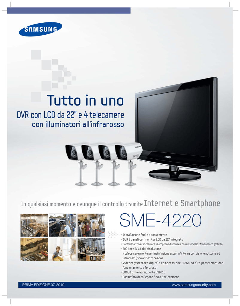 Tutto in uno DVR con LCD da 22” e 4 telecamere con illuminatori all’infrarosso In qualsiasi momento e ovunque il controllo tramite Internet e Smartphone SME-4220 • Installazione facile e conveniente • DVR 8 canali con monitor LCD da 22" integrato • Controllo attraverso cellulare smart phone disponibile con un servizio DNS dinamico gratuito • 600 linee TV ad alta risoluzione 4 telecamere pronte per installazione esterna/interna con visione notturna ad infrarossi (fino a 15 m di campo) • Videoregistratore digitale compressione H.264 ad alte prestazioni con funzionamento silenzioso • 500GB di memoria, porte USB 2.0 • Possibilità di collegare fino a 8 telecamere PRIMA EDIZIONE 07-2010 www.samsungsecurity.com DVR con LCD da 22” e 4 telecamere con illuminatori all’infrarosso SME-4220 Specifiche Telecamera Telefono cellulare non compreso. Dimensioni Unità: mm (pollici) 413.65 (16.29") 413,65 (16,29") 521 (20,16") (20.16") 521 218.82 (8,61") (8.61") 218,82 DVR con LCD da 22” 64(2,52") (2.52") 64 100(3,94") (3.94") 100 Telecamera con illuminatori all’infrarosso Accessori Accessori standard telecamera e supporto cavo prolunga da 1,8 m manuale utente cavo VGA guida all’installazione della rete Batteria 4 pz 4 pz 1 pz 1 pz 1 pz 2 pz cavo di alimentazione telecomando guida rapida mouse cavo ethernet 1 pz 1 pz 1 pz 1 pz 1 pz Accessori opzionali (forniti separatamente) Modello SEB-1000R Telecamera con illuminatori all’infrarosso, cavo da 1,8 m Autom. (Elettrica) / A colori / B/N CC 12V CCD IP66 600TVL 50dB Video composito: TIPO MINI DIN (JACK) Lunghezza focale: 3,8mm Apertura (F): 2.0 Bianco / metallo 30 EA DVR LCD 68.3 (2,69") (2.69") 68,3 67(2,64") (2.64") 67 Giorno/notte Tensione di ingresso Dispositivo di acquisizione immagini Resistente agli agenti atmosferici Risoluzione Rapporto S/N Uscita del segnale Obiettivo Colore / materiale LED a infrarossi SEB-1001 SEA-C100 Telecamera a Cavo da colori, cavo 1,8 m da 1,8 m Dimensione dello schermo Risoluzione (O x V) Luminosità Pannello Rapporto di contrasto Tempo di risposta (ms) Display Angolo di visualizzazione (O/V) Altoparlante integrato Sottoesposizione Funzione Picture in Picture Telecomando Supporto VESA Video Audio Allarme Interfaccia di ingresso Rete Backup PC (VGA) Video Interfaccia di uscita Audio Allarme Memoria Capacità HDD N. di telecamera visualizzato Modo live Registratore Risoluzione Codec video Codec audio Velocità di registrazione Moodo registrazione/ (max) riproduzione Qualità di registrazione selezionabile Modo di ricerca Modo backup Formato file Testo E-mail Immagine (JPEG) Interfaccia di comando menu Peso Specifiche meccaniche Dimensioni (L x H x P) Il marchio Eco rappresenta la volontà di Samsung Techwin di realizzare prodotti ecologici e indica che il prodotto soddisfa la direttiva UE RoHS. Larghezza 22" 1366 x 768 pixel 400cd/m2 800 : 1 5 170° / 160° altoparlante1 x 1 Watt Supportato Supportato Supportato VESA 100 8 CH tipo DIN e 4 CH tipo BNC selezionabili (da 5 a 8CH) 4 CH 4 CH 1 x porta Ethernet (10 / 100 Mbps Ethernet) 2 x USB 2.0 1 CH (VGA) 1 CH 1 CH 1 CH 1 SATA 500GB 1 / 4 / 6 / 8 / Sequenza 704 x 480(NTSC), 704 x 576(PAL) H.264 G.711 NTSC: 240fps (352 x 240), 120fps (704 x 240), 60fps (704 x 480) PAL: 200fps (352 x 288), 100fps (704 x 288), 50fps (704 x 576) Livello: Altissimo/alto/standard/basso Ricerca temporale, ricerca per eventi AVI Notifica: Evento allarme / Movimento / Perdita video Notifica: Snapshot video live Mouse (USB), telecomando 6,8kg 521 x 413 x 218mm (20,16" x 16,29" x 8,61") Il progetto e le specifiche sono soggetti a modifiche senza preavviso. DISTRIBUITO DA SAMSUNG TECHWIN CO., LTD. 701, Sampyeong-dong, Bundang-gu, Seongnam-si, Gyeonggi-do Korea 463-400 Tel : +82-70-7147-8741~8749, 8752~8760 Fax : +82-31-8018-3745 www.samsungsecurity.com www.samsungcctv.com SAMSUNG TECHWIN AMERICA 1480 Charles Willard St, Carson, CA 90746, UNITED STATES Tol Free : +1-877-213-1222 Fax : +1-310-632-2195 www.samsungcctvusa.com SAMSUNG TECHWIN EUROPE LTD. Samsung House, 1000 Hillswood Drive, Hillswood Business Park Chertsey, Surrey, UNITED KINGDOM KT16 OPS Tel : +44-1932-45-5300 Fax : +44-1932-45-5325 TIANJIN SAMSUNG TECHWIN OPTO-ELECTRONICS CO., LTD. No.11 Wei 6 Street. Micro-Electronic Industrial Park Jingang Road, Tianjin, P.R. CHINA 300385 Tel : +86-22-23887788 Fax : +86-22-23887788 SI.이-1007