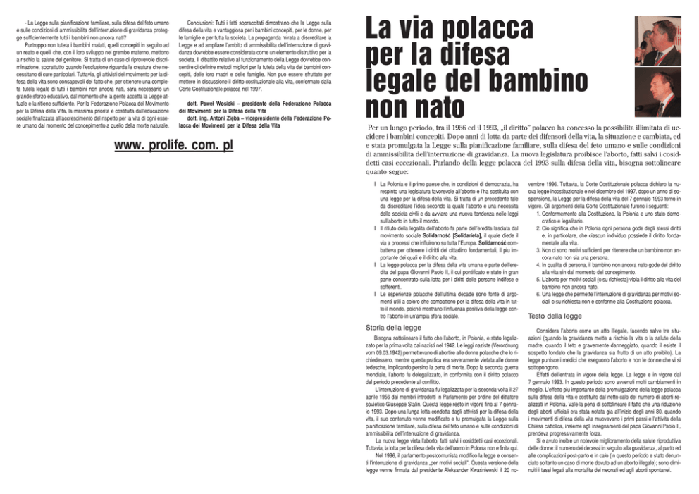 − La Legge sulla pianificazione familiare, sulla difesa del feto umano e sulle condizioni di ammissibilita dell'interruzione di gravidanza proteg− ge sufficientemente tutti i bambini non ancora nati? Purtroppo non tutela i bambini malati, quelli concepiti in seguito ad un reato e quelli che, con il loro sviluppo nel grembo materno, mettono a rischio la salute del genitore. Si tratta di un caso di riprovevole discri− minazione, soprattutto quando l'esclusione riguarda le creature che ne− cessitano di cure particolari. Tuttavia, gli attivisti del movimento per la di− fesa della vita sono consapevoli del fatto che, per ottenere una comple− ta tutela legale di tutti i bambini non ancora nati, sara necessario un grande sforzo educativo, dal momento che la gente accetta la Legge at− tuale e la ritiene sufficiente. Per la Federazione Polacca del Movimento per la Difesa della Vita, la massima priorita e costituita dall'educazione sociale finalizzata all'accrescimento del rispetto per la vita di ogni esse− re umano dal momento del concepimento a quello della morte naturale. Conclusioni: Tutti i fatti sopraccitati dimostrano che la Legge sulla difesa della vita e vantaggiosa per i bambini concepiti, per le donne, per le famiglie e per tutta la societa. La propaganda mirata a discreditare la Legge e ad ampliare l'ambito di ammissibilita dell'interruzione di gravi− danza dovrebbe essere considerata come un elemento distruttivo per la societa. Il dibattito relativo al funzionamento della Legge dovrebbe con− sentire di definire metodi migliori per la tutela della vita dei bambini con− cepiti, delle loro madri e delle famiglie. Non puo essere sfruttato per mettere in discussione il diritto costituzionale alla vita, confermato dalla Corte Costituzionale polacca nel 1997. dott. Paweł Wosicki – presidente della Federazione Polacca dei Movimenti per la Difesa della Vita dott. ing. Antoni Zięba – vicepresidente della Federazione Po− lacca dei Movimenti per la Difesa della Vita www. prolife. com. pl La via polacca per la difesa legale del bambino non nato Per un lungo periodo, tra il 1956 ed il 1993, „il diritto” polacco ha concesso la possibilita illimitata di uc− cidere i bambini concepiti. Dopo anni di lotta da parte dei difensori della vita, la situazione e cambiata, ed e stata promulgata la Legge sulla pianificazione familiare, sulla difesa del feto umano e sulle condizioni di ammissibilita dell'interruzione di gravidanza. La nuova legislatura proibisce l'aborto, fatti salvi i cosid− detti casi eccezionali. Parlando della legge polacca del 1993 sulla difesa della vita, bisogna sottolineare quanto segue: O La Polonia e il primo paese che, in condizioni di democrazia, ha respinto una legislatura favorevole all'aborto e l'ha sostituita con una legge per la difesa della vita. Si tratta di un precedente tale da discreditare l'idea secondo la quale l'aborto e una necessita delle societa civili e da avviare una nuova tendenza nelle leggi sull'aborto in tutto il mondo. O Il rifiuto della legalita dell'aborto fa parte dell'eredita lasciata dal movimento sociale Solidarność [Solidarieta], il quale diede il via a processi che influirono su tutta l'Europa. Solidarność com− batteva per ottenere i diritti del cittadino fondamentali, il piu im− portante dei quali e il diritto alla vita. O La legge polacca per la difesa della vita umana e parte dell'ere− dita del papa Giovanni Paolo II, il cui pontificato e stato in gran parte concentrato sulla lotta per i diritti delle persone indifese e sofferenti. O Le esperienze polacche dell'ultima decade sono fonte di argo− menti utili a coloro che combattono per la difesa della vita in tut− to il mondo, poiché mostrano l'influenza positiva della legge con− tro l'aborto in un'ampia sfera sociale. Storia della legge Bisogna sottolineare il fatto che l'aborto, in Polonia, e stato legaliz− zato per la prima volta dai nazisti nel 1942. Le leggi naziste (Verordnung vom 09.03.1942) permettevano di abortire alle donne polacche che lo ri− chiedessero, mentre questa pratica era severamente vietata alle donne tedesche, implicando persino la pena di morte. Dopo la seconda guerra mondiale, l'aborto fu delegalizzato, in conformita con il diritto polacco del periodo precedente al conflitto. L'interruzione di gravidanza fu legalizzata per la seconda volta il 27 aprile 1956 dai membri introdotti in Parlamento per ordine del dittatore sovietico Giuseppe Stalin. Questa legge resto in vigore fino al 7 genna− io 1993. Dopo una lunga lotta condotta dagli attivisti per la difesa della vita, il suo contenuto venne modificato e fu promulgata la Legge sulla pianificazione familiare, sulla difesa del feto umano e sulle condizioni di ammissibilita dell'interruzione di gravidanza. La nuova legge vieta l'aborto, fatti salvi i cosiddetti casi eccezionali. Tuttavia, la lotta per la difesa della vita dell'uomo in Polonia non e finita qui. Nel 1996, il parlamento postcomunista modifico la legge e consen− ti l'interruzione di gravidanza „per motivi sociali”. Questa versione della legge venne firmata dal presidente Aleksander Kwaśniewski il 20 no− vembre 1996. Tuttavia, la Corte Costituzionale polacca dichiaro la nu− ova legge incostituzionale e nel dicembre del 1997, dopo un anno di so− spensione, la Legge per la difesa della vita del 7 gennaio 1993 torno in vigore. Gli argomenti della Corte Costituzionale furono i seguenti: 1. Conformemente alla Costituzione, la Polonia e uno stato demo− cratico e legalitario. 2. Cio significa che in Polonia ogni persona gode degli stessi diritti e, in particolare, che ciascun individuo possiede il diritto fonda− mentale alla vita. 3. Non ci sono motivi sufficienti per ritenere che un bambino non an− cora nato non sia una persona. 4. In qualita di persona, il bambino non ancora nato gode del diritto alla vita sin dal momento del concepimento. 5. L'aborto per motivi sociali (o su richiesta) viola il d