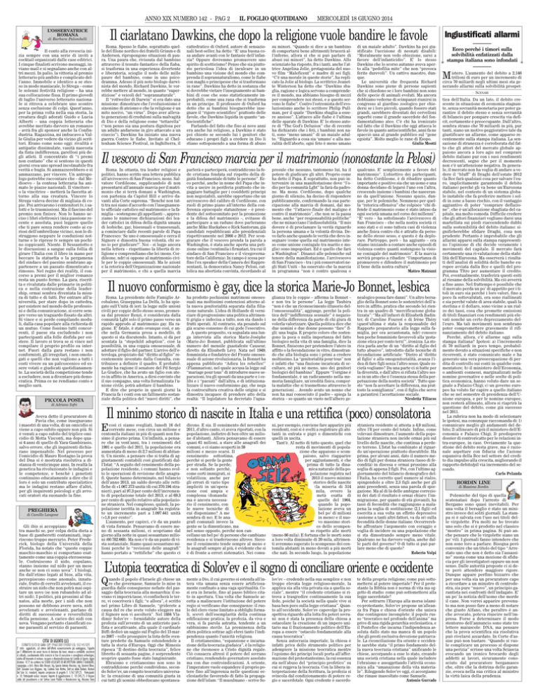 ANNO XIX NUMERO 142 - PAG 2 di Barbara Palombelli PICCOLA POSTA MERCOLEDÌ 18 GIUGNO 2014 Il ciarlatano Dawkins, che dopo la religione vuole bandire le favole L’OSSERVATRICE ROMANA Il conto alla rovescia inizia sempre con una serie di inviti a cocktail organizzati dalle case editrici. I cinque finalisti scrivono messaggi, inviano mail e si segnalano anche con altri mezzi. In palio, la vittoria al premio letterario più ambito e complicato dell’anno. Immobile e identico a se stesso in modo maniacale, lo Strega – come le solenni festività religiose – ha una sua collocazione fissa. Il primo giovedì di luglio l’universo letterario nazionale si ritrova a celebrare uno scontro senza esclusione di colpi. Quest’anno, per la prima volta nella sua storia, la creatura degli adorati Guido e Lucia Alberti – una coppia letteraria che avrebbe meritato davvero un romanzo – avrà fra gli sponsor anche la Confindustria. Ragazzina, mi imbucavo a Valle Giulia per vedere da vicino gli scrittori. Erano come sono oggi: rivalità e antipatie dissimulate, vanità nascosta da finta indifferenza, garellosi più degli atleti. Il concentrato di “i premi non contano” che si sentono in questi giorni crea uno spread incolmabile fra verità e bugia. Si ammazzerebbero e si ammazzano, per vincere. Un antropologo potrebbe raccontare che – dal Medioevo – la contesa letteraria ha animato le piazze nazionali. Il vincitore – o la vincitrice – metterà la fascetta attorno alla sua creatura. Vincere lo Strega valeva decine di migliaia di copie. Poi arrivarono i contenitori tv, i salotti e le trasmissioni. Ma il fascino del premio non finisce. Non lo hanno ucciso i libri elettronici (mia passione recente e assoluta, puoi leggere quello che ti pare senza rendere conto ai curiosi dell’ombrellone vicino), non lo distruggono neppure le conduzioni notturne e le riprese tv sempre un pochino zoppicanti. Niente. Il Sessantotto e le discussioni a sangue sulla follia di girare l’Italia con il libro in mano per beccare la statuetta o la pergamena del sindaco del paesino sembrano appartenere a un passato dimenticato e rimosso. Nel regno dei reality, il concorso a premi per il miglior romanzo resta un punto fermo. La gara, riscritta e rivalutata dalle primarie in politica e nella costruzione della leadership, ormai sembra diventata la misura di tutto e di tutti. Per entrare all’università, per stare dopo in cattedra, per esistere nel mondo delle professioni e della comunicazione, si corre sempre verso un traguardo fissato da altri. Si vince e si perde compilando moduli, dalla casa popolare alla richiesta di un mutuo. Come fossimo tutti concorrenti, il paese sta escludendo i non partecipanti alla folle disfida per esistere. Il lavoro si trova se si vince nel compilare il proprio profilo su internet. Fuori dalla gara restano i non conformisti, gli irregolari, i non omologati e quelli che non vogliono a tutti i costi vivere su un palcoscenico ed essere votati e giudicati quotidianamente. La società della competizione tende a escludere, non a diventare più democratica. Prima ce ne rendiamo conto e meglio sarà. IL FOGLIO QUOTIDIANO Roma. Spesso le fiabe, soprattutto quelle del filone nordico dei fratelli Grimm e di Andersen, ripropongono situazioni di paura. Una paura che, rivissuta dal bambino attraverso il tessuto fantastico della fiaba, si trasforma in una esperienza divertente e liberatoria, scioglie il nodo delle mille paure del bambino, come in uno psicodramma. Adesso il più noto biologo darwinista del mondo, Richard Dawkins, le vorrebbe mettere al mondo, in quanto “superstiziose” e veicoli del “soprannaturale”. Il “rottweiler di Darwin” si era dato una missione: dimostrare che l’evoluzionismo è sinonimo di ateismo e che la religione è un mito nocivo, “un virus”. Dopo aver allevato generazioni di creduloni sulla malvagità di Dio e della religione come “tettarella” (“non penso sia una postura dignitosa per un adulto andarsene in giro attaccato a un ciuccio”), Dawkins ha iniziato una nuova guerra. Contro le fiabe. Invitato al Cheltenham Science Festival, in Inghilterra, il cattedratico di Oxford, autore di sensazionali best-seller, ha detto: “E’ una buona cosa andare avanti con le fantasie dell’infanzia? Oppure dovremmo promuovere uno spirito di scetticismo? Penso che sia piuttosto pericolosa l’idea di inculcare in un bambino una visione del mondo che comprenda il soprannaturalismo, come le fiabe con maghi o principesse che si trasformano in rane”. Dawkins ha detto in sostanza che si dovrebbe vietare l’insegnamento ai bambini di cose che sono statisticamente improbabili, come una rana che si trasforma in un principe. Il professore di Oxford ha detto che ai bambini bisognerebbe insegnare il “rigore scientifico” piuttosto delle favole, che Dawkins liquida in quanto “antiscientifiche”. Parlando del fatto che fino ai nove anni era anche lui religioso, a Dawkins è stato poi chiesto se secondo lui i genitori che educano i propri figli a credere in Dio li stiano sottoponendo a una forma di abuso su minori. “Quando si dice a un bambino di comportarsi bene altrimenti brucerà all’inferno, allora sì che si può parlare di abusi sui minori”, ha detto Dawkins. Allo scienziato ha risposto, fra i tanti, anche l’attrice Angelina Jolie, protagonista del nuovo film “Maleficent” e madre di sei figli. “C’è una morale in queste storie”, ha replicato la Jolie al biologo. La scrittrice Jeanette Winterson ha detto che “Dawkins sbaglia, ragione e logica servono a comprendere il mondo, ma abbiamo bisogno di mezzi per comprendere noi stessi, e a questo servono le fiabe”. Contro l’estremista dell’evoluzionismo anche lo scrittore Philip Pullman, per il quale “Dawkins sbaglia a essere ansioso”. L’attacco alle fiabe è l’ultima delle sparate di Dawkins. E’ lo stesso autore di “The God’s Delusion” che di recente ha dichiarato che i feti, i b