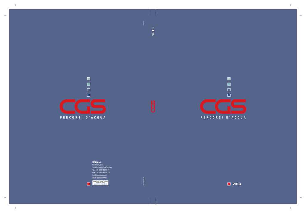 pubsrl.it Via Torino, 9/A 28060 Cureggio (NO) - Italy Tel. +39 0322 83.99.71 Fax +39 0322 83.99.73 [email protected] www.cgsmixer.com Ed. 01/13 rev. 00 C.G.S. srl Catalogo catalogue ISO 9001:2008 Certified quality system since 1998. Certifié système de qualité depuis 1998. Azienda Fondata nel 1977, C.G.S. subito si impone sul mercato divenendo punto di riferimento nei sistemi di scarico. Incentra la sua attività sulla qualità e sul servizio, che costituiranno sempre il leit motiv di ogni sua scelta produttiva e di mercato. I più importanti processi produttivi vengono eseguiti con l’utilizzo delle migliori tecnologie e di personale altamente specializzato all’interno del proprio stabilimento, garantendo un’estrema flessibilità ed un elevato standard qualitativo. Oggi, grazie alla continua ricerca di soluzioni innovative e all’esperienza acquisita, C.G.S. può offrire un’ampia gamma di prodotti in grado di soddisfare le più diverse ed esigenti richieste dei propri clienti in Italia e nel Mondo. C.G.S., da sempre un partner serio e qualificato. Company profile Founded in 1977, C.G.S became very successful in its industry, becoming a benchmark in the field of drains and overflows. The principle of C.G.S has always been quality and service, representing high standards, strong position, and production in todays markets. Using advanced technology and highly trained personnel, C.G.S maintains extreme flexibility and a high quality of standards. With its innovative solutions and expertise C.G.S is able to offer a wide range of products that can satisfy the most various and demanding needs of customers globally. C.G.S; always a serious and qualified partner. Sifoni doccia shower drain SIFONI DOCCIA Canaline doccia in acciaio inox stainless steel trench drains Sifoni doccia shower drains SIFONI DOCCIA Linea Graffiti Tessera Fusion Tile Soluzioni innovative per personalizzare il vostro ambiente doccia. Cinque griglie dal diverso design ed una piastrellabile. Practical drain solutions to customize your shower stall. Five different grille designs including one for inlaid tiles. Minimal Sifoni doccia, Shower drains 7 Caratteristiche tecniche technical details Colla per piastrelle Tile adhesive Nastro butilico bi-adesivo Butyl double sided tape Guaina impermeabile Waterproof membrane Colla per piastrelle Tile adhesive Piastrella Tile Canalina con sistema di regolazione per facilitare il posizionamento a pavimento. Per una corretta installazione si raccomanda di preparare il sottofondo con un’adeguata guaina impermeabile. Stainless steel rough-in with adjustment system, for convenient in floor positioning. For best results install a waterproof membrane. CDA 20 105 13 20 700 - 800 - 900 - 1000 - 1200 = = Versione con sifone conforme alla normativa EN274 Altezza totale filo pavimento 105 mm Colonna d’acqua 50 mm Portata di scarico 30 l/min. 125 85 Floor offlet with swivel drain according to the EN274 Depth 105 mm from finished floor surface Flow rate 30 lt/min. G 1”1/2 CDB 125 85 85 13 20 700 - 800 - 900 - 1000 - 1200 = = G 1”1/2 Sifoni doccia shower drains 20 Versione con sifone ribassato Altezza totale filo pavimento 85 mm Colonna d’acqua 30 mm Portata di scarico 30 l/min. Floor offlet with low swivel drain Depth 85 mm from finished floor surface Flow rate 30 lt/min SIFONI DOCCIA Lunghezza in mm Length mm Griglia Grille LINEA GRAFFITI TESSERA FUSION TILE MINIMAL 700 800 900 1000 1200 GR01-7 o 88,00 GR01-8 GR01-9 GR01-10 GR01-12 o 95,00 o 100,00 o 105,00 o 115,00 GR02-7 o 88,00 GR02-8 GR02-9 GR02-10 GR02-12 o 95,00 o 100,00 o 105,00 o 115,00 GR03-7 GR03-8 GR03-9 GR03-10 GR03-12 o 98,00 o 105,00 o 110,00 o 115,00 o 125,00 GR04-7 GR04-8 GR04-9 GR04-10 GR04-12 o 98,00 o 105,00 o 110,00 o 115,00 o 125,00 GR05-7 GR05-8 GR05-9 GR05-10 GR05-12 o 88,00 o 95,00 o 100,00 o 105,00 o 115,00 GR06-7 GR06-8 GR06-9 GR06-10 GR06-12 o 88,00 o 95,00 o 100,00 o 105,00 o 115,00 Il sifone preassemblato, inamovibile e orientabile a 360°, è completamente ispezionabile. The pre assembled 360° swivel drain, has a removable siphon, for easy cleaning and service. Lunghezza in mm Length mm 85 800 900 1000 1200 CDA-7 CDA-8 CDA-9 CDA-10 CDA-12 o 245,00 o 258,00 o 275,00 o 290,00 o 320,00 CDB-7 CDB-8 CDB-9 CDB-10 CDB-12 o 245,00 o 258,00 o 275,00 o 290,00 o 320,00 CD-R01 o 19,00 ø4 0 ø5 0 CDB ø5 0 CDA 700 ø4 0 105 Scarico h mm Drain h mm Accessori - Accessories Kit completo per montaggio modulare Complete kit for modular assembly Sifoni doccia, Shower drains 9 Sistemi di impermeabilizzazione waterproofing system Sistemi di impermeabilizzazione Guaina di isolamento impermeabilizzante di facile e sicura installazione. • Riduce i tempi di esecuzione e posa rispetto ai tradizionali sistemi di isolamente cementizio. •Non richiede tempi di essiccazione intermedi. •Si applica semplicemente con colla per piastrelle. •L’elasticità della guaina compensa eventuali dilatazioni e fessurazioni, la sua speciale composizione ne mantiene invariate nel tempo le caratteristiche. •Adatta per applicazioni a pavimento e a parete per interni ed esterni con uno spessore costante di solo 0,5 mm su tutta la superficie di posa. Waterproofing system Isolated Waterproof membrane with easy and secure installation. •Reduces procedure time in comparison to traditional mortered isolation. •Does not require additional drying time during procedure of installation. •Applied with a simple tile adhesive. •Membrane elasticity compensates for expansion and contraction of possible cracks in cement or mortar, and maintains its characteristics throughout time. •Optimal for floor and wall appications for both internal and external applications. Remains a constant minimal thickness of 0,5 mm. Kit canalina doccia + guaina isolante preformata + nastro butilico bi-adesivo. Disponibile in differenti lunghezze e versioni. Differenti griglie di finitura. Linear shower drain kit + pre-sized isolation membrane + butyl double sided 