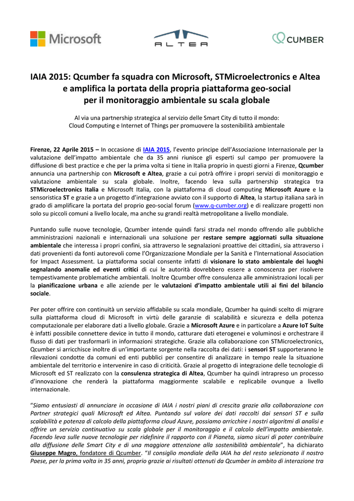 IAIA 2015: Qcumber fa squadra con Microsoft, STMicroelectronics e Altea e amplifica la portata della propria piattaforma geo-social per il monitoraggio ambientale su scala globale Al via una partnership strategica al servizio delle Smart City di tutto il mondo: Cloud Computing e Internet of Things per promuovere la sostenibilità ambientale Firenze, 22 Aprile 2015 – In occasione di IAIA 2015, l’evento principe dell’Associazione Internazionale per la valutazione dell’impatto ambientale che da 35 anni riunisce gli esperti sul campo per promuovere la diffusione di best practice e che per la prima volta si tiene in Italia proprio in questi giorni a Firenze, Qcumber annuncia una partnership con Microsoft e Altea, grazie a cui potrà offrire i propri servizi di monitoraggio e valutazione ambientale su scala globale. Inoltre, facendo leva sulla partnership strategica tra STMicroelectronics Italia e Microsoft Italia, con la piattaforma di cloud computing Microsoft Azure e la sensoristica ST e grazie a un progetto d’integrazione avviato con il supporto di Altea, la startup italiana sarà in grado di amplificare la portata del proprio geo-social forum (www.q-cumber.org) e di realizzare progetti non solo su piccoli comuni a livello locale, ma anche su grandi realtà metropolitane a livello mondiale. Puntando sulle nuove tecnologie, Qcumber intende quindi farsi strada nel mondo offrendo alle pubbliche amministrazioni nazionali e internazionali una soluzione per restare sempre aggiornati sulla situazione ambientale che interessa i propri confini, sia attraverso le segnalazioni proattive dei cittadini, sia attraverso i dati provenienti da fonti autorevoli come l’Organizzazione Mondiale per la Sanità e l’International Association for Impact Assessment. La piattaforma social consente infatti di visionare lo stato ambientale dei luoghi segnalando anomalie ed eventi critici di cui le autorità dovrebbero essere a conoscenza per risolvere tempestivamente problematiche ambientali. Inoltre Qcumber offre consulenza alle amministrazioni locali per la pianificazione urbana e alle aziende per le valutazioni d’impatto ambientale utili ai fini del bilancio sociale. Per poter offrire con continuità un servizio affidabile su scala mondiale, Qcumber ha quindi scelto di migrare sulla piattaforma cloud di Microsoft in virtù delle garanzie di scalabilità e sicurezza e della potenza computazionale per elaborare dati a livello globale. Grazie a Microsoft Azure e in particolare a Azure IoT Suite è infatti possibile connettere device in tutto il mondo, catturare dati eterogenei e voluminosi e orchestrare il flusso di dati per trasformarli in informazioni strategiche. Grazie alla collaborazione con STMicroelectronics, Qcumber si arricchisce inoltre di un’importante sorgente nella raccolta dei dati: i sensori ST supporteranno le rilevazioni condotte da comuni ed enti pubblici per consentire di analizzare in tempo reale la situazione ambientale del territorio e intervenire in caso di criticità. Grazie al progetto di integrazione delle tecnologie di Microsoft ed ST realizzato con la consulenza strategica di Altea, Qcumber ha quindi intrapreso un processo d’innovazione che renderà la piattaforma maggiormente scalabile e replicabile ovunque a livello internazionale. “Siamo entusiasti di annunciare in occasione di IAIA i nostri piani di crescita grazie alla collaborazione con Partner strategici quali Microsoft ed Altea. Puntando sul valore dei dati raccolti dai sensori ST e sulla scalabilità e potenza di calcolo della piattaforma cloud Azure, possiamo arricchire i nostri algoritmi di analisi e offrire un servizio continuativo su scala globale per il monitoraggio e il calcolo dell’impatto ambientale. Facendo leva sulle nuove tecnologie per ridefinire il rapporto con il Pianeta, siamo sicuri di poter contribuire alla diffusione delle Smart City e di una maggiore attenzione alla sostenibilità ambientale”, ha dichiarato Giuseppe Magro, fondatore di Qcumber. “Il consiglio mondiale della IAIA ha del resto selezionato il nostro Paese, per la prima volta in 35 anni, proprio grazie ai risultati ottenuti da Qcumber in ambito di interazione tra ambiente e social media e siamo entusiasti di aver partecipato attivamente all’organizzazione di questa edizione”. “Siamo orgogliosi di contribuire con la nostra tecnologia all’evoluzione del progetto Qcumber e siamo convinti che questa eccellenza italiana saprà farsi strada nel mondo. Un esempio significativo di come il Cloud Computing possa supportare un percorso di crescita flessibile e di come l’Internet of Things rappresenti una prospettiva concreta, ma anche un’interessante dimostrazione di quanto l’innovazione tecnologica non sia fine a se stessa ma produca progetti d’impatto reale a vantaggio dell’intera collettività”, ha commentato Fabio Santini, Direttore della Divisione Developer Experience & Evangelism di Microsoft Italia. “A pochi giorni dal nuovo accordo che vede Microsoft Italia ed ST fare squadra per dare forma a un ecosistema ‘sensor-to-cloud’ a supporto delle aziende e del territorio italiano, l’esperienza di Qcumber testimonia il valore dell’integrazione tra cloud e sensoristica anche per l’evoluzione delle città in una logica di Smart City, un settore che promette benefici per l’intero Paese, dal momento che il Politecnico di Milano stima che l’adozione pervasiva di tecnologie IoT applicate alla gestione del territorio potrebbe generare un risparmio di più di 4 miliardi di euro, oltre a una riduzione dell’impatto ambientale e a una maggiore vivibilità”. “Altea accoglie con entusiasmo la partecipazione a IAIA 2015 per esprimere il valore di Qcumber e delle iniziative progettuali che sono nate da questa piattaforma. La collaborazione attivata con importanti soggetti del panorama ICT ci ha permesso di creare una soluzione di organizzazione e gestione che favorisce azioni di Corporate Social Responsibil