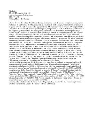 Dio Padre 1416-1425; patera, circa 1831 rame sbalzato, cesellato e dorato 120 x 90 x 70 Milano, Museo del Duomo Chiave di volta del catino absidale del duomo di Milano e parte di una più complessa scena, venne realizzato da Beltramino da Rho, come indica Mia Cinotti (in Bossaglia, Cinotti 1978), ritenendolo eseguito entro il 1425 su un modello approntato nel 1415 da Jacopino da Tradate (Bossaglia 1973). La rilettura dei documenti inerenti questa impresa, compiuta tra il 1416 (il 23 febbraio Beltramino si era proposto quale esecutore dell’immagine di Dio Padre; non domandava né anticipi né che gli fossero pagati i materiali, a esclusione della doratura) e il 1425, in competizione con il più anziano collega Giovannolo da Seregno, al quale verrà affidata l’esecuzione dei nove angeli musicanti destinati a circondare la figura di Dio Padre (Venturelli 2003a; Venturelli 2006 pp 86-87), ha invece consentito a Laura Cavazzini di assegnare a Beltramino non solo l’esecuzione, ma anche il modello dell’immagine di Dio Padre. Orafo milanese tolto dall’oscurità da Michele Caffi, citato nelle carte della Fabbrica del Duomo dal 22 novembre 1404 (quando assieme ad altri due orafi e a un pittore stima una scultura di Giorgio Solari), Beltramino de Zuttis, dopo aver aperto bottega nel 1405, compì in seno alla Scuola orafa di Sant’Eligio una brillante carriera, divenendone canepario (1417), console (1426) e abate (1434). L’opera del duomo è oggi l’unica nota di questo autore. Perduta infatti sia la Pace bronzea eseguita da Beltramino nel 1414 per i canonici di Santa Tecla (l’antica cattedrle estiva di Milano) pervenuta nel nuovo duomo quando l’edificio fu demolito nel 1461, ivi descritta da Filippo Argelati (Argelati 1745, tII,parteII, Appendix col 1739) e citata ancora da Carlo Romussi (Romussi 1906 p. 141), sia la croce per “altare” commissionatagli il 7 maggio 1433 dal Capitolo della Chjiesa di san Giorgio al Palazzo di Milano, che avrebbe dovuto essere ben “fabricatam, laboratam” e “ bona figurata” con immagini in rilievo. Nel corso del terzo decennio del XIX secolo, provvedendo a un radicale restauro della chiave di volta absidale, gli angeli realizzati da Giovannolo da Seregno che attorniavano il Padre Eterno vennero rimossi (Cavazzini 1996, p. 128) mentre nel 1831, su progetto del pittore Sanquirico, si approntò la grande “patera” destinata ad accogliere la testa di Dio Padre (Brivio 1978); nel 1831, come fa sapere Giulia Benati (che ringrazio vivamente) il “lamaro” Martino Ubicini realizzò due pieghe grandi fatte di nuovo formanti il busto del Padre Eterno” mentre il “Sig.Thomas”, “indoratore”, provvide a eseguire il “cappello” (il triangolo) dietro il capo di Dio Padre e a indorare l’opera (già C.Boito 1889 p,220 aveva menzionato ridora ture nel 1521 e nel 1627; Nava 1854 p184 cita quella eseguita nel 1830) Nel 1965 l’opera eseguita da Beltramino venne tolta e collocata nel museo al suo posto messa una copia (Brivio 1978) (estratto della scheda redatta da Paola Venturelli per catalogo mostra Oro dai Visconti agli Sforza – Smalti e oreficeria nel Ducato di Milano - Silvana Editoriale).