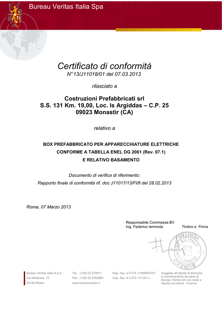 Bureau Veritas Italia Spa Certificato di conformità N° 13/J11018/01 del 07.03.2013 rilasciato a Costruzioni Prefabbricati srl S.S. 131 Km. 19,00, Loc. Is Argiddas – C.P. 25 09023 Monastir (CA) relativo a BOX PREFABBRICATO PER APPARECCHIATURE ELETTRICHE CONFORME A TABELLA ENEL DG 2061 (Rev. 07.1) E RELATIVO BASAMENTO Documento di verifica di riferimento: Rapporto finale di conformità rif. doc J11017/13/FI/fi del 28.02.2013 Roma, 07 Marzo 2013 Responsabile Commessa BV Ing. Federico Iemmola Bureau Veritas Italia S.p.A. Tel. (+39) 02.270911 Reg. Imp. e P.IVA 11498640157 Via Miramare, 15 Fax. (+39) 02.2552980 Cap. Soc. € 4.472.131,00 i.v. 20126 Milano www.bureauveritas.it Timbro e Firma Soggetta all’attività di direzione e coordinamento da parte di Bureau Veritas SA con sede a Neuilly-sur-Seine - Francia