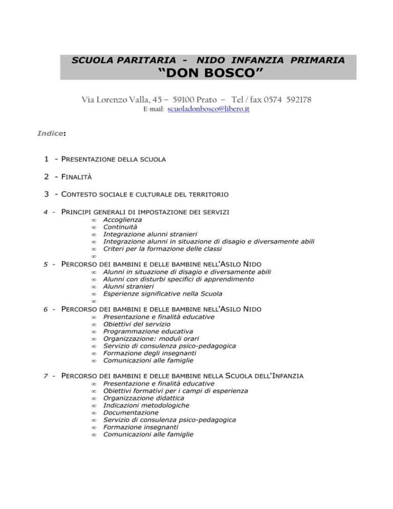 SCUOLA PARITARIA - NIDO INFANZIA PRIMARIA “DON BOSCO” Via Lorenzo Valla, 45 – 59100 Prato – Tel / fax 0574 592178 E-mail: [email protected] Indice: 1 - PRESENTAZIONE DELLA SCUOLA 2 - FINALITÀ 3 - CONTESTO SOCIALE E CULTURALE DEL TERRITORIO 4 - PRINCIPI GENERALI DI IMPOSTAZIONE DEI SERVIZI • • • • • • 5 - PERCORSO • • • • • 6 - PERCORSO • • • • • • • 7 - Accoglienza Continuità Integrazione alunni stranieri Integrazione alunni in situazione di disagio e diversamente abili Criteri per la formazione delle classi DEI BAMBINI E DELLE BAMBINE NELL'ASILO NIDO Alunni in situazione di disagio e diversamente abili Alunni con disturbi specifici di apprendimento Alunni stranieri Esperienze significative nella Scuola DEI BAMBINI E DELLE BAMBINE NELL'ASILO NIDO Presentazione e finalità educative Obiettivi del servizio Programmazione educativa Organizzazione: moduli orari Servizio di consulenza psico-pedagogica Formazione degli insegnanti Comunicazioni alle famiglie PERCORSO DEI BAMBINI E DELLE BAMBINE NELLA SCUOLA DELL'INFANZIA • • • • • • • • Presentazione e finalità educative Obiettivi formativi per i campi di esperienza Organizzazione didattica Indicazioni metodologiche Documentazione Servizio di consulenza psico-pedagogica Formazione insegnanti Comunicazioni alle famiglie 8 - PERCORSO DEGLI ALUNNI NELLA SCUOLA PRIMARIA: • • • • • • • • • 9 - Presentazione e finalità educative Qualità dell’offerta formativa Organizzazione didattica Scelta dei contenuti Contratto formativo Valutazione degli apprendimenti Strategie Competenze disciplinari alla fine della classe quinta Servizio di coordinamento pedagogico AMPLIAMENTO DELL’OFFERTA FORMATIVA • Progetti di continuità • Progetti dell'Asilo Nido • 10 - RISORSE • Progetti della Scuola dell’Infanzia Progetti della Scuola Primaria • • • • Interne Strutturali Strumenti tecnologici e multimediali Finanziarie 11 - ORARIO DI RICEVIMENTO 1 - Presentazione della scuola La Scuola Paritaria “Don Bosco” si colloca nella missione evangelizzatrice della Chiesa e propone un progetto educativo che, ispirandosi ai valori cristiani , ha come obiettivo quello di promuovere la maturazione della persona umana nella totalità delle sue espressioni, per condurla gradualmente a realizzarsi in armonia con se stessa e con gli altri. “Come scuola cattolica • È una espressione della missione della Chiesa • E’ una “comunità educante” che mira alla formazione integrale della persona • E’ una “comunità educante” che promuove i diritti e i doveri umani universali • Come “scuola della comunità cristiana” ha un rapporto stretto con la Chiesa diocesana • E’ una “comunità aperta” che collabora costantemente con le famiglie e la società civile, rispetta la libertà religiosa e di coscienza degli alunni e delle famiglie, pur non rinunciando alla propria identità e al compito di proporre i valori che ne conseguono.” (Dal Progetto per le scuole cattoliche della diocesi di Prato 29/03/2006) STORIA La Scuola Paritaria Primaria e dell’Infanzia“Don Bosco”, è situata a Prato in Via Lorenzo Valla n. 45 e giuridicamente l’edificio è di proprietà della Parrocchia di San Pietro a Mezzana. La sua inaugurazione risale all’anno 1955 e nell’anno 2005 ha festeggiato il 50° anniversario. Essa fu fortemente voluta dal popolo di Mezzana, il quale contribuì in misura decisiva alla sua realizzazione. Nel corso degli anni, verificandosi un’espansione edilizia e aumentando la popolazione è stato necessario l’ampliamento dell’edificio e la messa a norma dello stesso. Nell’anno 2005, sono stati realizzati i lavori di manutenzione straordinaria per il rifacimento di parte del tetto, il ripristino e la messa in sicurezza di locali destinati a sala video, sala computer, biblioteca e spazi per attività artistiche e musicali. In seguito alle numerose richieste di accogliere bambini sotto i tre anni, La Scuola ha attivato un nuovo servizio educativo rivolto proprio alla fascia di età dai dodici mesi ai tre anni. Perciò sono stati riorganizzati tutti gli spazi assegnati alla scuola dell'Infanzia, individuando un'area adeguata ad accogliere i bambini nella fascia di età di nido. Durante l'estate 2008, sono stati eseguiti i lavori di adeguamento della struttura per assolvere tale servizio. Il 26 di Novembre del 2008 il Nido è stato autorizzato dal Comune di Prato e il 25 di Febbraio del 2009 è stato accreditato secondo i parametri regionali. Dal Settembre 2010 circa il 70% delle famiglie dei bambini iscritti al nido può usufruire dei crediti di accesso dietro presentazione ISEE. La scuola Primaria è certificata secondo i requisiti di ISO 9001/UNI EN ISO 9001:2008 dall'anno 2005 e il 4 marzo del 2010 tale certificazione èp stata estesa alla scuola dell'Infanzia e all'asilo Nido GESTIONE Dal 1975 la Scuola è stata gestita dalla Suore Francescane d’Ognissanti di Firenze fino al giugno del 1991. Dal luglio 1991 all’agosto 1993 è subentrata Suor Caterina Bartoletti delle Suore Domenicane della Madonna del Rosario di Iolo – Prato. Dal settembre 1993 a svolgere il compito di dirigenza sono le Suore Orsoline del Sacro Cuore di Maria di Vicenza. La gestione è assunta dal Responsabile della Diocesi di Prato. Dal settembre 2005 il compito di dirigenza è svolto da Alba Maria Aquilano su designazione del Vescovo Monsignor Gastone Simoni della diocesi di Prato. La presenza delle Suore Orsoline è comunque garantita all’interno della scuola. Dal 17 Settembre 2006 la gestione amministrativa della Scuola è stata ripresa dal parroco pro-tempore don Luca Bongini che risulta essere il Legale rappresentante. 2 - Finalità La scuola “Don Bosco” si ispira ai valori cristiani ed è impegnata a promuovere la maturazione della persona umana nella totalità delle sue espressioni, per condurla gradualmente a realizzarsi in armonia con se stessa e con gl