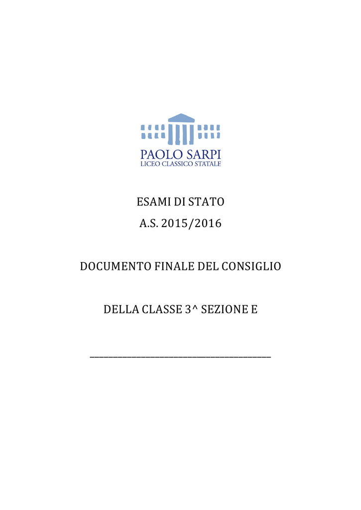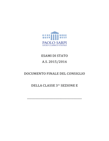ESAMIDISTATO A.S.2015/2016 DOCUMENTOFINALEDELCONSIGLIO DELLACLASSE3^SEZIONEE _______________________________________ Ministero dell’Istruzione, dell’Università e della Ricerca Liceo Classico Statale Paolo Sarpi P.zza Rosate, 4 – Bergamo Tel. 035 237476 Fax 035 223594 Email: [email protected] pec: [email protected] www.liceosarpi.bg.it INDICE Profilo della classe Obiettivi educativi, cognitivi e comportamentali Criteri e strumenti di verifica e valutazione Contenuti e tematiche pluridisciplinari Profilo della classe in relazione agli obiettivi prefissati e raggiunti 1. Attività della classe 2. Griglie di valutazione 3. Simulazioni 4. Programmi Disciplinari Italiano Latino Greco Matematica Fisica Inglese Scienze Storia dell’Arte IRC Scienze motorie e sportive Filosofia Storia -2- pagine 3 4 6 11 12 17 18 21 35 43 53 58 62 65 69 73 76 79 83 87 Ministero dell’Istruzione, dell’Università e della Ricerca Liceo Classico Statale Paolo Sarpi P.zza Rosate, 4 – Bergamo Tel. 035 237476 Fax 035 223594 Email: [email protected] pec: [email protected] www.liceosarpi.bg.it 1. PROFILO DELLA CLASSE Il Consiglio di classe è composto dai seguenti docenti: MATERIA Italiano Latino Greco Storia Filosofia Lingua straniera Matematica Fisica Scienze Storia dell’arte Scienze motorie Sostegno Religione DOCENTE Arturo Moretti (coord.) Anna Tondini Lorella Bonasia Alessandro Ricotta Alessandro Ricotta Enzo Candeloro Mariagrazia Ruggeri Mariagrazia Ruggeri Maria Venere Sciarrotta Francesca Buonincontri Anna Carotenuto Giuseppe Ciociola Vincenzo Pasini Continuità (IV-V-1-2-3) 1, 2, 3 1, 2, 3 1, 2, 3 1, 2, 3 1, 2, 3 IV, V, 1, 2, 3 V, 1, 2, 3 1, 2, 3 V, 1, 2, 3 1, 2, 3 IV, V, 1, 2, 3 V,1, 2, 3 IV, V, 1, 2, 3 2. COMPOSIZIONE DELLA CLASSE a. Elenco degli alunni 1 BOLIS BENEDETTA 2 BONARDI MARIA 3 BOSCHIROLI MARCELLO 4 BRIZIO SOFIA 5 CALINI BEATRICEBIANCA 6 CARMINATI GIUSEPPE 7 CAVALLERI SELENE 8 COLOMBO GIACOMO 9 DANIELE BARBARA 10 DE MATTEIS RAFFAELE 11 DI NOTO MARTINA 12 ELZI MICHELE 13 FENILI MATTEO 14 FOGLIO MASSIMILIANO 15 GHIRARDI ANDREA 16 GUALDI MARTINA 17 MARLETTA SIMONA 18 MERLO ANTONIO 19 POZZOLI MADDALENA 20 ROSSI FABRIZIA 21 SALVETTI DANIELA 22 SALVI ELISA 23 SUARDO GIACOMO 24 VIGANI DAVIDE Rappresentanti di classe degli studenti: Maddalena Pozzoli, Davide Vigani. Rappresentante dei genitori nel CdC: Marcella Datei. b. Gli alunni della classe provengono dalla 2^ E: n° 22 dalla 3^ E: n° 1 da altro istituto: n° 2 c. Hanno ripetuto delle classi: n° 9 -3- Ministero dell’Istruzione, dell’Università e della Ricerca Liceo Classico Statale Paolo Sarpi P.zza Rosate, 4 – Bergamo Tel. 035 237476 Fax 035 223594 Email: [email protected] pec: [email protected] www.liceosarpi.bg.it 3. ESITI SCOLASTICI Classe quarta: iscritti n° 22 Promossi: n° 12 Promossi dopo la sospensione del giudizio: n° 4 Materie: storia (1), latino (1), greco (2), italiano (1), scienze (1). Non promossi: n° 6 Ritirati: n° 0 Classe quinta: iscritti n° 19 (di cui 3 ripetenti dalla 5E precedente) Promossi: n° 14 Promossi dopo la sospensione del giudizio: n° 4 Materie: matematica (2), greco (1), scienze (1). Non promossi: n° 1. Classe prima: iscritti n° 27 (di cui 5 ripetenti) Promossi a giugno: n° 12 Promossi dopo la sospensione del giudizio: n° 7 Materie: matematica (2), greco (3), latino (3), italiano (1), arte (1), fisica (1). Non promossi: n° 5. Trasferiti: n° 3. Classe seconda: iscritti n° 22 (di cui 6 ripetenti) Promossi a giugno: n° 14 Promossi dopo la sospensione del giudizio: n° 8 Materie: matematica (3), greco (3), latino (3), inglese (1). Classe terza: iscritti n° 25 (di cui 9 ripetenti: uno studente respinto agli Esami presso altro Liceo; uno studente non ammesso agli Esami presso il nostro Liceo e uno studente non ammesso agli Esami presso altro Liceo). 4. OBIETTIVI La programmazione disciplinare generale e dei singoli ambiti è ispirata ai principi e alle linee della programmazione d'istituto (POF) e del Documento di programmazione del Collegio docenti. Il Consiglio dei docenti focalizza per la classe i seguenti obiettivi: Obiettivi formativi • • • • • • • Acquisire coscienza di sé, delle proprie capacità e dei propri limiti Acquisire consapevolezza delle mete comuni educative, formative e disciplinari Comportarsi in modo rispettoso nei confronti di tutti (compagni, docenti e personale scolastico) Acquisire la consapevolezza che ambienti, strutture, sussidi didattici della scuola costituiscono un bene comune eche gli allievi condividono la responsabilità di averne cura Acquisire una responsabilità collettiva, stabilendo rapporti collaborativi con i compagni e superando atteggiamenti di competitività negativa Sviluppare un approccio problematico, aperto e non emotivo nei confronti della realtà Rispettare orari e tempi della vita scolastica, consegne e scadenze connesse con il lavoro didattico -4- Ministero dell’Istruzione, dell’Università e della Ricerca Liceo Classico Statale Paolo Sarpi P.zza Rosate, 4 – Bergamo Tel. 035 237476 Fax 035 223594 Email: [email protected] pec: [email protected] www.liceosarpi.bg.it • • • • Partecipare e collaborare attivamente e in modo responsabile a tutti i momenti del lavoro della classe nel riconoscimento della valenza didattico-cognitiva delle attività (spiegazione, interrogazione, discussione, assemblea) Consolidare un metodo di studio efficace ed autonomo Affinare il rigore linguistico e concettuale Consolidare un atteggiamento interdisciplinare nei confronti delle materie di studio. Obiettivi cognitivi Conoscenza: possedere conoscenze formali / astratte • Conoscere gli argomenti dagli aspetti essenziali alla completezza di dati specifici e contestuali • Conoscere il significato dei termini e il loro uso specifico • Conoscere concetti, metodi, procedure e strumenti operativi delle diverse discipline in relazione ai contenuti dei relativi programmi. Abilita': sapere utilizzare conoscenze dati in concreto e in contest