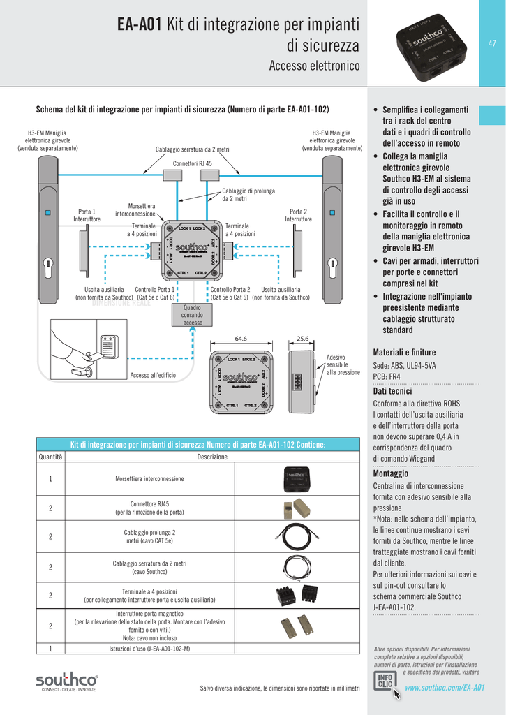 EA-A01 Kit di integrazione per impianti di sicurezza 47 Accesso elettronico Schema del kit di integrazione per impianti di sicurezza (Numero di parte EA-A01-102) H3-EM Maniglia elettronica girevole (venduta separatamente) H3-EM Maniglia elettronica girevole (venduta separatamente) Cablaggio serratura da 2 metri Connettori RJ 45 Porta 1 Interruttore Cablaggio di prolunga da 2 metri Morsettiera interconnessione Terminale a 4 posizioni Terminale a 4 posizioni Controllo Porta 2 Uscita ausiliaria (Cat 5e o Cat 6) (non fornita da Southco) Uscita ausiliaria Controllo Porta 1 (non fornita da Southco) (Cat 5e o Cat 6) DIMENSIONE REALE Porta 2 Interruttore Quadro comando accesso 64.6 25.6 Adesivo sensibile alla pressione Accesso all’edificio • Semplifica i collegamenti tra i rack del centro dati e i quadri di controllo dell’accesso in remoto • Collega la maniglia elettronica girevole Southco H3-EM al sistema di controllo degli accessi già in uso • Facilita il controllo e il monitoraggio in remoto della maniglia elettronica girevole H3-EM • Cavi per armadi, interruttori per porte e connettori compresi nel kit • Integrazione nell'impianto preesistente mediante cablaggio strutturato standard Materiali e finiture Sede: ABS, UL94-5VA PCB: FR4 Dati tecnici Kit di integrazione per impianti di sicurezza Numero di parte EA-A01-102 Contiene: Quantità Descrizione Conforme alla direttiva ROHS I contatti dell’uscita ausiliaria e dell’interruttore della porta non devono superare 0,4 A in corrispondenza del quadro di comando Wiegand Montaggio 1 Morsettiera interconnessione 2 Connettore RJ45 (per la rimozione della porta) 2 Cablaggio prolunga 2 metri (cavo CAT 5e) 2 Cablaggio serratura da 2 metri (cavo Southco) 2 Terminale a 4 posizioni (per collegamento interruttore porta e uscita ausiliaria) 2 Interruttore porta magnetico (per la rilevazione dello stato della porta. Montare con l’adesivo fornito o con viti.) Nota: cavo non incluso 1 Istruzioni d’uso (J-EA-A01-102-M) Centralina di interconnessione fornita con adesivo sensibile alla pressione *Nota: nello schema dell’impianto, le linee continue mostrano i cavi forniti da Southco, mentre le linee tratteggiate mostrano i cavi forniti dal cliente. Per ulteriori informazioni sui cavi e sul pin-out consultare lo schema commerciale Southco J-EA-A01-102. Altre opzioni disponibili. Per informazioni complete relative a opzioni disponibili, numeri di parte, istruzioni per l’installazione e specifiche dei prodotti, visitare Salvo diversa indicazione, le dimensioni sono riportate in millimetri www.southco.com/EA-A01 EA-A01 Scatola di derivazione indipendente 48 Accesso elettronico 12V 24V 3 9 6 # 2 8 1 0 5 7 4 Ø 3 Scatola di derivazione • Consente l’uso di 2 dispositivi di controllo Numero di parte dell’accesso e 2 chiusure EA-A01-001 elettromeccaniche 4 X Ø 4.3 ±0.1 • Collegamenti 4 x Ø 5.0 Passante 126 Ø 9 X 90° contrassegnati per Scatola di derivazione EA-A01-001 semplificare l’impostazione • Pratica connessione 63.3 42 42 centralizzata per + l’alimentazione LAT1 LAT2 CTRL1CTRL2 PWR SWITCH dell’impianto 126 • Gli interruttori consentono 114 qualunque combinazione di 1 2 3 controllo dell’accesso 31 4 5 6 collegato alla chiusura 7 8 9 Ø 0 # 138 • Da usare con qualunque 3 1 2 3 4 5 6 combinazione di dispositivo Centralina 2 7 8 9 di controllo dell’accesso Ø 0 # e chiusura Centralina 1 elettromeccanica Southco. Preparazione del pannello • Ordinare scatola di Chiusura 1 Chiusura 2 derivazione, cavi e 4 X Ø 4.3 ±0.1 alimentazione DIMENSIONE REALE 4 x Ø 5.0 Passante 126 separatamente Ø 9 X 90° 42 42 126 Altre opzioni disponibili. Per informazioni complete relative a opzioni disponibili, numeri di parte, istruzioni per l’installazione e specifiche dei prodotti, visitare www.southco.com/EA 1 2 3 4 5 6 7 8 9 Ø 0 # EA-W52-506* Cablaggio da 5 metri -RJ45 a capocorda sguainato e stagnato Collega la scatola di derivazione all'applicazione del cliente EA-W52-506-80* Cablaggio da 5 metri -RJ45 a l connettore JA A2506H-09 Collega la scatola di derivazione alle Serie EA-K1 e EA-P1 centraline di accesso *Contattare Southco per richiedere lunghezze specifiche Salvo diversa indicazione, le dimensioni sono riportate in millimetri 2 3 5 6 7 8 9 Ø 1 0 # 4 # Collega la scatola di derivazione alla Maniglia elettronica girevole H3-EM-60-100 9 EA-W01-500-51* Cablaggio da 5 metri -RJ12 a Hirose a 6 pin DF11-6DS-2C 6 Collega la scatola di derivazione alle R4-EM-XX-XXX Chiusura rotativa elettronica 3 Cablaggio da 5 metri -RJ12 a Molex 43020-0601 8 EA-W20-501-51* 5 Cablaggio da 5 metri -RJ12 a Hirose a 4 pin DF11-4DS-2C 2 EA-W02-503-51* 0 138 Funzione Collega la scatola di derivazione alle EM-10-XX-XXX Aggancio elettronico 7 3 Descrizione 4 Numero di parte 1 31 Elenco degli accessori Ø 114
