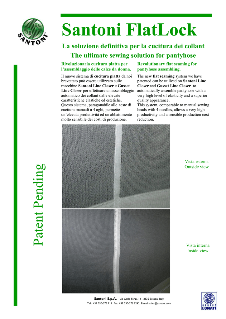 Santoni FlatLock La soluzione definitiva per la cucitura dei collant The ultimate sewing solution for pantyhose Rivoluzionaria cucitura piatta per l’assemblaggio delle calze da donna. Revolutionary flat seaming for pantyhose assembling. Il nuovo sistema di cucitura piatta da noi brevettato può essere utilizzato sulle macchine Santoni Line Closer e Gusset Line Closer per effettuare un assemblaggio automatico dei collant dalle elevate caratteristiche elastiche ed estetiche. Questo sistema, paragonabile alle teste di cucitura manuali a 4 aghi, permette un’elevata produttività ed un abbattimento molto sensibile dei costi di produzione. The new flat seaming system we have patented can be utilized on Santoni Line Closer and Gusset Line Closer to automatically assemble pantyhose with a very high level of elasticity and a superior quality appearance. This system, comparable to manual sewing heads with 4 needles, allows a very high productivity and a sensible production cost reduction. Patent Pending Vista esterna Outside view Vista interna Inside view Santoni S.p.A. Via Carlo Fenzi, 14 - 2135 Brescia, Italy Tel.: +39 030-376 711 Fax: +39 030-376 7242 E-mail: [email protected] Disponibile in esclusiva sulle macchine automatiche Santoni Available exclusively on Santoni automatic machines Santoni FlatLock LC36SP/DP GLC36SP/DP Santoni S.p.A. Via Carlo Fenzi, 14 - 2135 Brescia, Italy Tel.: +39 030-376 711 Fax: +39 030-376 7242 E-mail: [email protected] Note e caratteristiche tecniche di questo depliant non sono impegnative per la Santoni S.p.A. Soggetto a modifiche senza preavviso All technical specifications and features included in this brochure are not binding to Santoni S.p.A. Specifications subject to change without notice