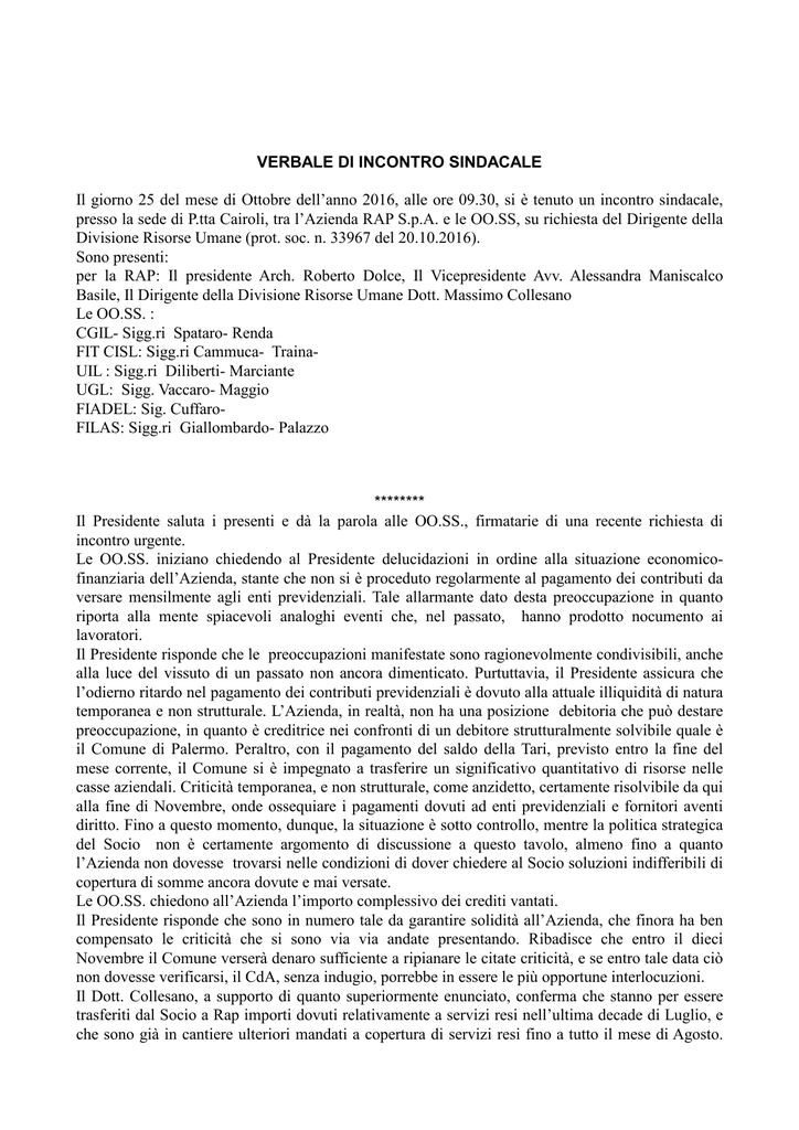 VERBALE DI INCONTRO SINDACALE Il giorno 25 del mese di Ottobre dell’anno 2016, alle ore 09.30, si è tenuto un incontro sindacale, presso la sede di P.tta Cairoli, tra l’Azienda RAP S.p.A. e le OO.SS, su richiesta del Dirigente della Divisione Risorse Umane (prot. soc. n. 33967 del 20.10.2016). Sono presenti: per la RAP: Il presidente Arch. Roberto Dolce, Il Vicepresidente Avv. Alessandra Maniscalco Basile, Il Dirigente della Divisione Risorse Umane Dott. Massimo Collesano Le OO.SS. : CGIL- Sigg.ri Spataro- Renda FIT CISL: Sigg.ri Cammuca- TrainaUIL : Sigg.ri Diliberti- Marciante UGL: Sigg. Vaccaro- Maggio FIADEL: Sig. CuffaroFILAS: Sigg.ri Giallombardo- Palazzo ******** Il Presidente saluta i presenti e dà la parola alle OO.SS., firmatarie di una recente richiesta di incontro urgente. Le OO.SS. iniziano chiedendo al Presidente delucidazioni in ordine alla situazione economicofinanziaria dell’Azienda, stante che non si è proceduto regolarmente al pagamento dei contributi da versare mensilmente agli enti previdenziali. Tale allarmante dato desta preoccupazione in quanto riporta alla mente spiacevoli analoghi eventi che, nel passato, hanno prodotto nocumento ai lavoratori. Il Presidente risponde che le preoccupazioni manifestate sono ragionevolmente condivisibili, anche alla luce del vissuto di un passato non ancora dimenticato. Purtuttavia, il Presidente assicura che l’odierno ritardo nel pagamento dei contributi previdenziali è dovuto alla attuale illiquidità di natura temporanea e non strutturale. L’Azienda, in realtà, non ha una posizione debitoria che può destare preoccupazione, in quanto è creditrice nei confronti di un debitore strutturalmente solvibile quale è il Comune di Palermo. Peraltro, con il pagamento del saldo della Tari, previsto entro la fine del mese corrente, il Comune si è impegnato a trasferire un significativo quantitativo di risorse nelle casse aziendali. Criticità temporanea, e non strutturale, come anzidetto, certamente risolvibile da qui alla fine di Novembre, onde ossequiare i pagamenti dovuti ad enti previdenziali e fornitori aventi diritto. Fino a questo momento, dunque, la situazione è sotto controllo, mentre la politica strategica del Socio non è certamente argomento di discussione a questo tavolo, almeno fino a quanto l’Azienda non dovesse trovarsi nelle condizioni di dover chiedere al Socio soluzioni indifferibili di copertura di somme ancora dovute e mai versate. Le OO.SS. chiedono all’Azienda l’importo complessivo dei crediti vantati. Il Presidente risponde che sono in numero tale da garantire solidità all’Azienda, che finora ha ben compensato le criticità che si sono via via andate presentando. Ribadisce che entro il dieci Novembre il Comune verserà denaro sufficiente a ripianare le citate criticità, e se entro tale data ciò non dovesse verificarsi, il CdA, senza indugio, porrebbe in essere le più opportune interlocuzioni. Il Dott. Collesano, a supporto di quanto superiormente enunciato, conferma che stanno per essere trasferiti dal Socio a Rap importi dovuti relativamente a servizi resi nell’ultima decade di Luglio, e che sono già in cantiere ulteriori mandati a copertura di servizi resi fino a tutto il mese di Agosto. Ciò premesso, pagando il dovuto a tutto Agosto, il rimanente debito potrà ritenersi fisiologico, in quanto riguarderà esclusivamente lo scorso mese di settembre. Interviene il Vicepresidente, Avv. Alessandra Maniscalco Basile, rappresentando che per quanto attiene al ramo Manutenzione Stradale alcune fatture risultano effettivamente in pagamento presso i competenti uffici comunali, mentre per altre si attende ancora la certificazione del servizio reso da parte aziendale. Le OO.SS., nel ribadire ancora una volta tutte le preoccupazioni di cui è fatto superiormente cenno, rilevano che le voci sulla situazione debitoria dell’Azienda non consentono ai lavoratori di operare con serenità. Le OO.SS., dal canto loro, chiedono di avere un quadro chiaro della situazione, anche al fine di porre in essere successivi eventuali adempimenti di impronta squisitamente sindacale. Il Presidente rammenta che l’impegno preso dal Cda nei confronti dei lavoratori in ordine al puntuale pagamento degli stipendi sia stato finora ossequiato, a volte anche a discapito di altrettanto importanti oneri economici in scadenza. Ribadisce che se il Comune entro la prevista e già nominata data del dieci Novembre non provvederà a trasferire a Rap tutti gli importi sin qui dovuti, si troverà costretto ad assumere determinazioni diverse e consequenziali, al fine di ottenere tali pagamenti. Annuncia anche che il Cda è pronto a qualsiasi eventuale iniziativa per scongiurare qualunque stato di emergenza, stante che ha finora sempre fatto valere motivazioni a difesa e salvaguardia dell’Azienda nella sua interezza, nonché in considerazione anche dell’approssimarsi della fine dell’anno, periodo particolarmente denso di pagamenti, ad iniziare dal doppio onere di versamento ai lavoratori, di tredicesima e stipendio. Puntualizza, anche, che la rappresentanza politica comunale ha manifestato, talvolta, un approccio poco sereno nei confronti dell’azienda, dimenticando le difficoltà che quotidianamente vengono affrontate, ad esempio, alla piattaforma impiantistica, dove si è tutt’ora in emergenza dovuta al conferimento di rifiuti dei comuni viciniori, parecchi dei quali, tra l’altro, non rispettano la tempistica contrattuale di pagamenti. D’altro canto, risulta di difficile pratica la risoluzione dei contratti stipulati, ed altrettanto ostico ipotizzare di inibire loro l’ingresso in discarica, rischiando l’imputazione penale di l’interruzione di pubblico servizio. Purtuttavia, il servizio ai comuni morosi verrà messo in coda rispetto alle priorità aziendali ed anche rispetto a quello da rendere ai comuni in regola con i pagamenti. Le OO.SS. continuano a caldeggiare la loro preoccupazione per l’attuale situazio