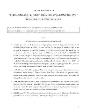 AVVISO PUBBLICO “SELEZIONE DEI PROGETTI PROMOSSI DALLE ONG NEI PVS ” DOTAZIONE FINANZIARIA 2015 DATA DI PUBBLICAZIONE DELL’ESTRATTO DEL BANDO SULLA GURI: 21.10.2014 DATA DI SCADENZA PER LA PRESENTAZIONE DEI PROGETTI: 05.12.2014, ORE 12:00 Art. 1 (Dotazione finanziaria del bando e individuazione dei lotti) 1. L’avviso pubblico per il finanziamento di progetti promossi da ONG nei Paesi in via di Sviluppo (nel prosieguo il “bando”), ai sensi dell’art. 29 della Legge 26 febbraio 1987, n. 49 secondo le procedure di cui alla Delibera n. 141/2012 del Comitato direzionale per la cooperazione allo sviluppo (nel prosieguo la “delibera quadro”) e alla Delibera 185/2013 del Comitato direzionale per la cooperazione allo sviluppo e successive modifiche (nel prosieguo la “delibera operativa”), a valere sul capitolo di bilancio 2181, risorse 2015, dispone presumibilmente – sulla base delle cifre stanziate nell’esercizio 2014 e delle previsioni di bilancio per il 2015 – di 10 milioni di euro per il finanziamento delle prime rate dei progetti approvati. Per il presente bando, nell’ambito delle risorse disponibili, sono individuati i seguenti lotti: a. 4.500.000 euro (45% del totale) per l’Africa sub-sahariana, nei seguenti Paesi: Etiopia; Kenya; Mozambico; Niger; Senegal; Somalia; Sudan; Sud Sudan. Nell’ambito del presente lotto, costituiranno settori prioritari di intervento: salute, sicurezza alimentare e nutrizionale, tutela dei diritti, educazione, formazione professionale; b. 3.000.000 euro (30% del totale) per il Mediterraneo e Medio Oriente, nei seguenti Paesi: Egitto; Libano; Palestina; Tunisia. Nell’ambito del presente lotto, costituiranno settori prioritari di intervento: tutela dei diritti (in particolare delle donne e dei minori), educazione, formazione professionale, sostegno alla governance, sostegno al settore privato; c. 500.000 euro (5% del totale) per Afghanistan e Pakistan, nei settori della tutela dei diritti (in particolare delle donne e dei minori) e del sostegno alla governance e società civile; 1 d. 2.000.000 euro (20% del totale) per il finanziamento, in ordine di graduatoria, dei progetti presentati in altri settori e/o altre aree geografiche e dei progetti non ammessi a finanziamento nell’ambito dei lotti di cui alle lettere precedenti. Nell’ambito di tutti i lotti sopraindicati, particolare attenzione dovrà essere dedicata nei progetti alla tutela dei gruppi vulnerabili (quali rifugiati, comunità ospitanti, minoranze, disabili, etc.) e all’inclusione sociale. 2. L’esatta dotazione finanziaria (totale e dei singoli lotti) verrà comunicata sul portale della Cooperazione Italiana, non appena disponibile. In ragione dei limiti degli stanziamenti in bilancio, la copertura economica per i progetti con durata pluriennale è assicurata, allo stato, solo per la prima annualità; in mancanza di disponibilità economica per le annualità successive, la Direzione si riserva il diritto di rivedere forme, modi ed entità della propria partecipazione al finanziamento dei progetti in questione. Art. 2 (Iter di approvazione dei progetti) 1. L’iter di approvazione dei progetti è quello previsto dalla Delibera quadro e dalla Delibera operativa e successive modifiche, articolato per il presente bando nelle seguenti quattro fasi: I. L’Ufficio VII, effettuate le verifiche amministrative previste dalla Delibera operativa – riguardanti la sussistenza dei requisiti di ammissibilità e/o delle irregolarità causa di esclusione, ex art. 5.3 – e il controllo delle spese ammissibili, trasmette le sintesi risultate ammissibili alle Ambasciate e ai Consolati competenti; II. Le Ambasciate e i Consolati competenti effettuano le proprie valutazioni secondo le modalità descritte nella delibera operativa, utilizzando il modello di cui all’allegato 7; III. L’Unità Tecnica Centrale effettua la valutazione tecnico-economica delle iniziative che hanno superato la precedente fase II, secondo le modalità descritte nella delibera operativa, utilizzando il modello di cui all’allegato 9; IV. Una Commissione di valutazione, nominata con decreto del Direttore Generale, riceve tutti i documenti di progetto che siano stati ritenuti ammissibili dalla DGCS e che abbiano ricevuto valutazione positiva sia dalle Ambasciate/Consolati che dalla UTC, li esamina ed attribuisce a ciascuno di essi un punteggio, utilizzando la griglia di valutazione di cui all’allegato 10. I lavori della Commissione si concludono con 2 l’elaborazione di una graduatoria stilata sulla base del punteggio attribuito a ciascun progetto. 2. Al termine della Fase I (verifiche amministrative), la DGCS può chiedere alle ONG interessate di provvedere all’integrazione della documentazione prodotta in maniera inesatta, parziale o mancante, ove tali irregolarità non siano considerate come cause di esclusione ai sensi del presente bando. La DGCS può altresì chiedere la rettifica dei piani finanziari delle iniziative esaminate, ove questi presentino refusi e/o errori materiali che non ne inficino la generale validità e coerenza, ai sensi dell’art. 4 della delibera 185/2013. Sia l’integrazione della documentazione che la rettifica del piano finanziario dovranno intervenire entro e non oltre 10 giorni lavorativi dalla ricezione richiesta della DGCS, pena l’esclusione del progetto dalle fasi successive del procedimento di valutazione. Art. 3 (Modalità per la presentazione dei progetti) 1. La presentazione dei documenti di progetto può avvenire esclusivamente attraverso l’invio di una email all’indirizzo di posta elettronica certificata [email protected], a decorrere dalla data di pubblicazione dell’estratto del presente bando sulla Gazzetta Ufficiale della Repubblica Italiana e non oltre il termine finale di cui al successivo art. 7. 2. Immediatamente dopo la scadenza dei termini per la presentazione dei progetti, l’elenco dei progetti prevenuti verrà pubblicato sul sito web dell
