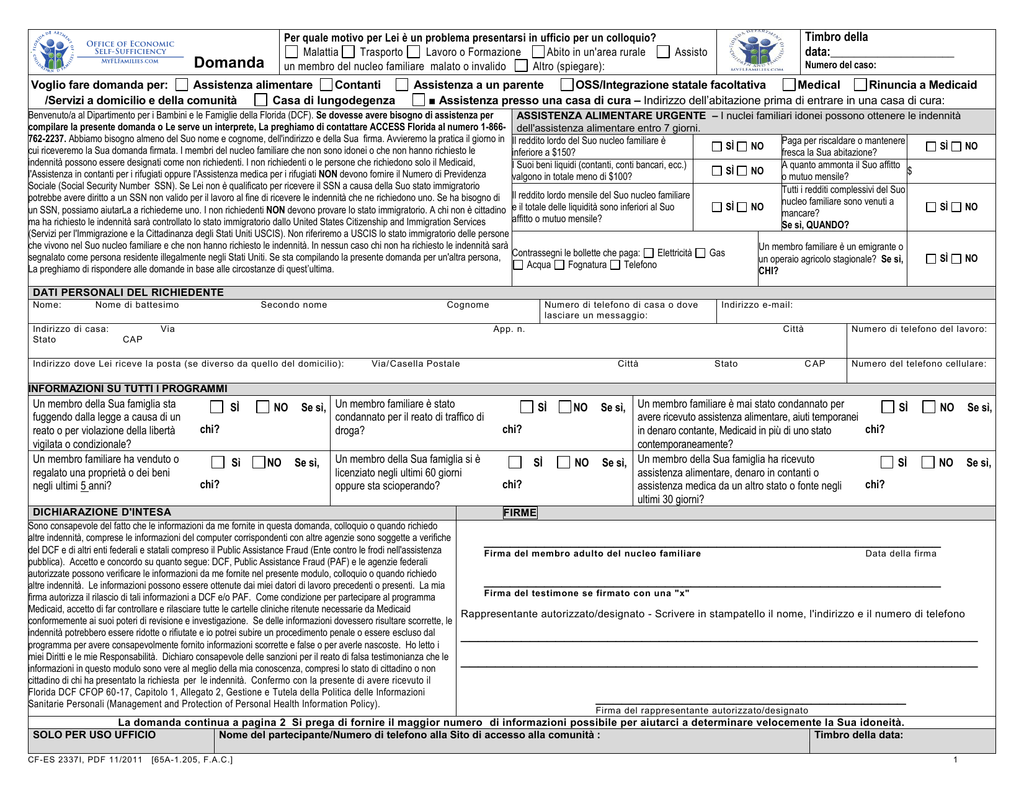 Per quale motivo per Lei è un problema presentarsi in ufficio per un colloquio? Malattia Trasporto Lavoro o Formazione Abito in un'area rurale un membro del nucleo familiare malato o invalido Altro (spiegare): Office of Economic Self-Sufficiency Domanda Voglio fare domanda per: Assistenza alimentare Contanti /Servizi a domicilio e della comunità Casa di lungodegenza Timbro della data:_____________________ Assisto Numero del caso: Assistenza a un parente OSS/Integrazione statale facoltativa Medical Rinuncia a Medicaid ■ Assistenza presso una casa di cura – Indirizzo dell’abitazione prima di entrare in una casa di cura: Benvenuto/a al Dipartimento per i Bambini e le Famiglie della Florida (DCF). Se dovesse avere bisogno di assistenza per ASSISTENZA ALIMENTARE URGENTE – I nuclei familiari idonei possono ottenere le indennità compilare la presente domanda o Le serve un interprete, La preghiamo di contattare ACCESS Florida al numero 1-866- dell'assistenza alimentare entro 7 giorni. 762-2237. Abbiamo bisogno almeno del Suo nome e cognome, dell'indirizzo e della Sua firma. Avvieremo la pratica il giorno in Il reddito lordo del Suo nucleo familiare è Paga per riscaldare o mantenere SÌ NO SÌ NO cui riceveremo la Sua domanda firmata. I membri del nucleo familiare che non sono idonei o che non hanno richiesto le inferiore a $150? fresca la Sua abitazione? indennità possono essere designati come non richiedenti. I non richiedenti o le persone che richiedono solo il Medicaid, I Suoi beni liquidi (contanti, conti bancari, ecc.) A quanto ammonta il Suo affitto SÌ NO $ l'Assistenza in contanti per i rifugiati oppure l'Assistenza medica per i rifugiati NON devono fornire il Numero di Previdenza valgono in totale meno di $100? o mutuo mensile? Sociale (Social Security Number SSN). Se Lei non è qualificato per ricevere il SSN a causa della Suo stato immigratorio Tutti i redditi complessivi del Suo potrebbe avere diritto a un SSN non valido per il lavoro al fine di ricevere le indennità che ne richiedono uno. Se ha bisogno di Il reddito lordo mensile del Suo nucleo familiare nucleo familiare sono venuti a SÌ NO SÌ NO e il totale delle liquidità sono inferiori al Suo un SSN, possiamo aiutarLa a richiederne uno. I non richiedenti NON devono provare lo stato immigratorio. A chi non è cittadino mancare? affitto o mutuo mensile? ma ha richiesto le indennità sarà controllato lo stato immigratorio dallo United States Citizenship and Immigration Services Se sì, QUANDO? (Servizi per l'Immigrazione e la Cittadinanza degli Stati Uniti USCIS). Non riferiremo a USCIS lo stato immigratorio delle persone che vivono nel Suo nucleo familiare e che non hanno richiesto le indennità. In nessun caso chi non ha richiesto le indennità sarà Un membro familiare è un emigrante o Elettricità Gas segnalato come persona residente illegalmente negli Stati Uniti. Se sta compilando la presente domanda per un'altra persona, Contrassegni le bollette che paga: SÌ NO un operaio agricolo stagionale? Se sì, Acqua Fognatura Telefono La preghiamo di rispondere alle domande in base alle circostanze di quest’ultima. CHI? DATI PERSONALI DEL RICHIEDENTE Nome: Nome di battesimo Indirizzo di casa: Stato Secondo nome Cognome Via Numero di telefono di casa o dove lasciare un messaggio: Indirizzo e-mail: App. n. Città Numero di telefono del lavoro: CAP Indirizzo dove Lei riceve la posta (se diverso da quello del domicilio): Via/ Casella Postale Città Stato C AP Numero del telefono cellulare: INFORMAZIONI SU TUTTI I PROGRAMMI Un membro della Sua famiglia sta fuggendo dalla legge a causa di un reato o per violazione della libertà vigilata o condizionale? Un membro familiare ha venduto o regalato una proprietà o dei beni negli ultimi 5 anni? SÌ NO chi? Sì chi? NO Se sì, Un membro familiare è stato condannato per il reato di traffico di droga? Se sì, Un membro della Sua famiglia si è licenziato negli ultimi 60 giorni oppure sta scioperando? SÌ NO chi? SÌ chi? NO Un membro familiare è mai stato condannato per avere ricevuto assistenza alimentare, aiuti temporanei chi? in denaro contante, Medicaid in più di uno stato contemporaneamente? Se sì, Un membro della Sua famiglia ha ricevuto assistenza alimentare, denaro in contanti o chi? assistenza medica da un altro stato o fonte negli ultimi 30 giorni? Se sì, SÌ NO Se sì, SÌ NO Se sì, DICHIARAZIONE D'INTESA FIRME Sono consapevole del fatto che le informazioni da me fornite in questa domanda, colloquio o quando richiedo altre indennità, comprese le informazioni del computer corrispondenti con altre agenzie sono soggette a verifiche _____________________________________________________ del DCF e di altri enti federali e statali compreso il Public Assistance Fraud (Ente contro le frodi nell'assistenza Firma del membro adulto del nucleo familiare Data della firma pubblica). Accetto e concordo su quanto segue: DCF, Public Assistance Fraud (PAF) e le agenzie federali autorizzate possono verificare le informazioni da me fornite nel presente modulo, colloquio o quando richiedo _____________________________________________________ altre indennità. Le informazioni possono essere ottenute dai miei datori di lavoro precedenti o presenti. La mia Firma del testimone se firmato con una "x" firma autorizza il rilascio di tali informazioni a DCF e/o PAF. Come condizione per partecipare al programma Medicaid, accetto di far controllare e rilasciare tutte le cartelle cliniche ritenute necessarie da Medicaid Rappresentante autorizzato/designato - Scrivere in stampatello il nome, l'indirizzo e il numero di telefono conformemente ai suoi poteri di revisione e investigazione. Se delle informazioni dovessero risultare scorrette, le indennità potrebbero essere ridotte o rifiutate e io potrei subire un procedimento penale o essere escluso dal ____________________________________________________________ programma per avere consapevolmente fornito informazioni scorrette e false o per av
