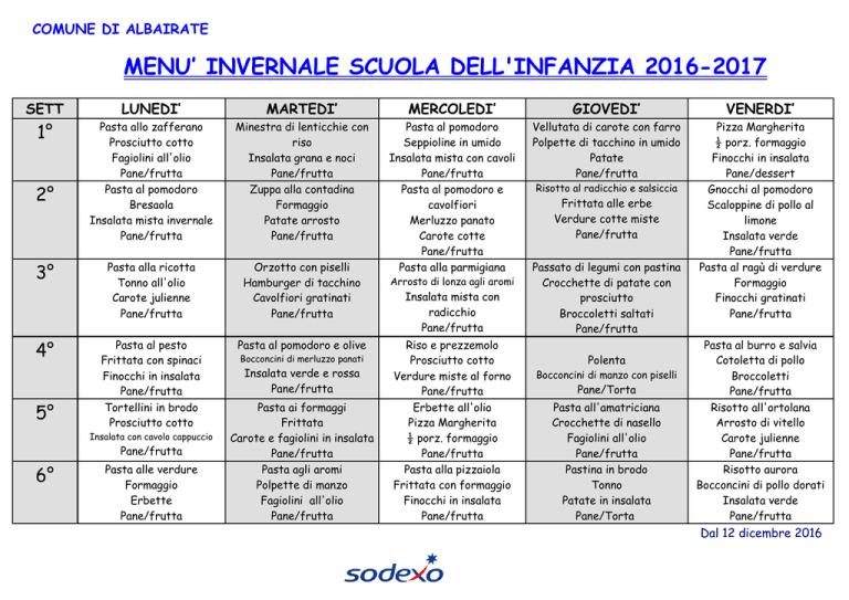 COMUNE DI ALBAIRATE MENU’ INVERNALE SCUOLA DELL'INFANZIA 2016-2017 SETT LUNEDI’ MARTEDI’ MERCOLEDI’ GIOVEDI’ VENERDI’ 1° Pasta allo zafferano Prosciutto cotto Fagiolini all'olio Pane/frutta Pasta al pomodoro Bresaola Insalata mista invernale Pane/frutta Minestra di lenticchie con riso Insalata grana e noci Pane/frutta Zuppa alla contadina Formaggio Patate arrosto Pane/frutta Vellutata di carote con farro Polpette di tacchino in umido Patate Pane/frutta Pasta alla ricotta Tonno all'olio Carote julienne Pane/frutta Orzotto con piselli Hamburger di tacchino Cavolfiori gratinati Pane/frutta Pasta al pomodoro Seppioline in umido Insalata mista con cavoli Pane/frutta Pasta al pomodoro e cavolfiori Merluzzo panato Carote cotte Pane/frutta Pasta alla parmigiana Pizza Margherita ½ porz. formaggio Finocchi in insalata Pane/dessert Gnocchi al pomodoro Scaloppine di pollo al limone Insalata verde Pane/frutta Pasta al ragù di verdure Formaggio Finocchi gratinati Pane/frutta Pasta al pesto Frittata con spinaci Finocchi in insalata Pane/frutta Tortellini in brodo Prosciutto cotto Pasta al pomodoro e olive 2° 3° 4° 5° Insalata con cavolo cappuccio Pane/frutta 6° Pasta alle verdure Formaggio Erbette Pane/frutta Bocconcini di merluzzo panati Insalata verde e rossa Pane/frutta Pasta ai formaggi Frittata Carote e fagiolini in insalata Pane/frutta Pasta agli aromi Polpette di manzo Fagiolini all'olio Pane/frutta Arrosto di lonza agli aromi Insalata mista con radicchio Pane/frutta Riso e prezzemolo Prosciutto cotto Verdure miste al forno Pane/frutta Erbette all'olio Pizza Margherita ½ porz. formaggio Pane/frutta Pasta alla pizzaiola Frittata con formaggio Finocchi in insalata Pane/frutta Risotto al radicchio e salsiccia Frittata alle erbe Verdure cotte miste Pane/frutta Passato di legumi con pastina Crocchette di patate con prosciutto Broccoletti saltati Pane/frutta Polenta Bocconcini di manzo con piselli Pane/Torta Pasta all'amatriciana Crocchette di nasello Fagiolini all'olio Pane/frutta Pastina in brodo Tonno Patate in insalata Pane/Torta Pasta al burro e salvia Cotoletta di pollo Broccoletti Pane/frutta Risotto all'ortolana Arrosto di vitello Carote julienne Pane/frutta Risotto aurora Bocconcini di pollo dorati Insalata verde Pane/frutta Dal 12 dicembre 2016