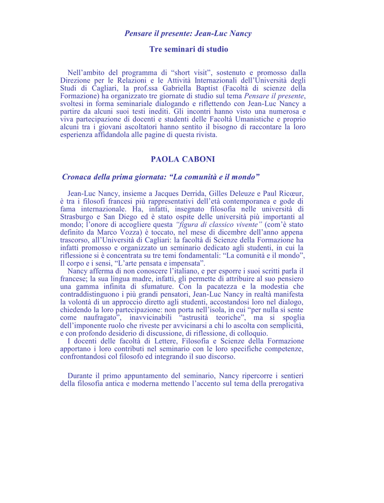 Pensare il presente: Jean-Luc Nancy Tre seminari di studio PAOLA