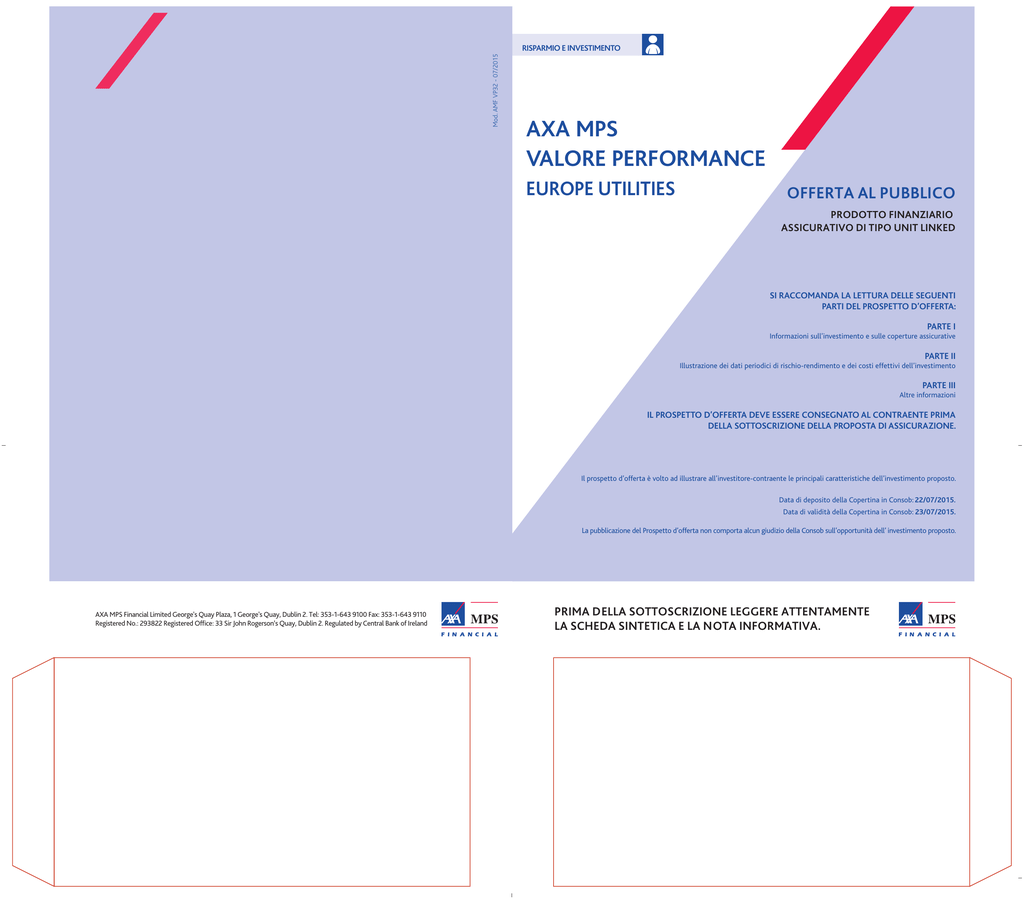 Mod. AMF VP32 - 07/2015 RISPARMIO E INVESTIMENTO AXA MPS VALORE PERFORMANCE EUROPE UTILITIES OFFERTA AL PUBBLICO PRODOTTO FINANZIARIO ASSICURATIVO DI TIPO UNIT LINKED SI RACCOMANDA LA LETTURA DELLE SEGUENTI PARTI DEL PROSPETTO D’OFFERTA: PARTE I Informazioni sull’investimento e sulle coperture assicurative PARTE II Illustrazione dei dati periodici di rischio-rendimento e dei costi effettivi dell’investimento PARTE III Altre informazioni IL PROSPETTO D’OFFERTA DEVE ESSERE CONSEGNATO AL CONTRAENTE PRIMA DELLA SOTTOSCRIZIONE DELLA PROPOSTA DI ASSICURAZIONE. Il prospetto d’offerta è volto ad illustrare all’investitore-contraente le principali caratteristiche dell’investimento proposto. Data di deposito della Copertina in Consob: 22/07/2015. 15 Data di validità della Copertina in Consob: 23/07/2015. La pubblicazione del Prospetto d’offerta non comporta alcun giudizio della Consob sull’opportunità dell’ investimento proposto. AXA MPS Financial Limited George's Quay Plaza, 1 George's Quay, Dublin 2. Tel: 353-1-643 9100 Fax: 353-1-643 9110 Registered No.: 293822 Registered Office: 33 Sir John Rogerson’s Quay, Dublin 2. Regulated by Central Bank of Ireland PRIMA DELLA SOTTOSCRIZIONE LEGGERE ATTENTAMENTE LA SCHEDA SINTETICA E LA NOTA INFORMATIVA. Scheda Sintetica - Informazioni Generali Scheda Sintetica Informazioni Generali La parte “Informazioni Generali”, da consegnare obbligatoriamente all’Investitore-Contraente prima della sottoscrizione, è volta a illustrare le informazioni generali sull’offerta. Per i termini utilizzati nella presente Scheda Sintetica, e non altrimenti definiti, si rinvia al Glossario contenuto nel Prospetto d’offerta. Informazioni generali sul contratto Impresa di assicurazione Contratto Attività finanziarie sottostanti AXA MPS Financial Limited è un’impresa di assicurazione di diritto Irlandese (l’Impresa di Assicurazione), appartenente al Gruppo AXA. Prodotto finanziario-assicurativo di tipo Unit Linked denominato AXA MPS Valore Performance - Europe Utilities (il Contratto). Il premio unico iniziale, al netto dei costi, viene interamente investito in quote del fondo interno dell'Impresa di Assicurazione, denominato AXA MPS VP32 Europe Utilities (di seguito il ‘Fondo Interno’) che investe in varie tipologie di strumenti finanziari, dal cui valore dipendono le prestazioni finanziarie e assicurative previste dal Contratto. Alla data di redazione del presente Prospetto d'offerta, l'Impresa di Assicurazione intende investire il patrimonio del Fondo Interno interamente in quote del fondo riservato di diritto irlandese non armonizzato ai sensi della Direttiva 85/611/CEE - come modificata dalle Direttive 88/220/CEE, 2001/107/CE, 2001/108/CE, 2009/65/CE e successive modifiche - denominato AXA IM DEIS 4 (di seguito, il ‘Fondo Non Armonizzato’) (ISIN IE00BYMWJS20) e gestito da AXA IM Ireland Limited. Il Fondo Non Armonizzato è un comparto del Trust di diritto irlandese Deis QIF. Il Fondo Non Armonizzato potrà investire nella tipologia di strumenti finanziari in cui investe il Fondo Interno (elencati nella Scheda Sintetica, Informazioni Specifiche, Sezione Politica di Investimento) tra cui strumenti obbligazionari, emessi da soggetti governativi e/o corporate, strumenti derivati (quotati e/o Over The Counter (OTC) inclusi, a titolo non esaustivo, opzioni, asset swap, total return swap e swaption) nonché Organismi di Investimento Collettivo del Risparmio armonizzati, ai sensi della Direttiva 85/611/CEE - come modificata dalle Direttive 88/220/CEE, 2001/107/CE, 2001/108/CE e successive modifiche, o autorizzati secondo il D.Lgs.58 del 24/02/1998 (Testo Unico dell’Intermediazione Finanziaria) e successive modifiche, o non armonizzati (gli ‘OICR’). Si precisa che la gestione attiva del Fondo Non Armonizzato da parte di AXA IM Ireland Limited risulta coerente con gli obiettivi del Fondo Interno di seguito descritti, e viene attuata mediante l’allocazione degli investimenti inclusi nel Fondo Non Armonizzato. Proposte d’investimento finanziario Finalità In ogni caso, l’Impresa di Assicurazione ha la facoltà di modificare la composizione e l’allocazione degli strumenti finanziari sottostanti il Fondo Interno nel corso della durata contrattuale coerentemente con il raggiungimento dell'Obiettivo di Protezione e dell'Obiettivo di Performance del Fondo Interno stesso, come di seguito descritti. Il Contratto prevede il versamento di un premio unico d’importo minimo pari a 2.500,00 euro. Non è prevista la possibilità di effettuare versamenti aggiuntivi successivi. La proposta d’investimento finanziario di cui al presente Prospetto d’offerta è unica. Per un’illustrazione delle informazioni di dettaglio, si rinvia alle Informazioni Specifiche della presente Scheda Sintetica. Il Contratto intende soddisfare allo stesso tempo le esigenze d’investimento del risparmio e incremento del capitale investito nel Fondo Interno, protetto e gestito su un orizzonte temporale pari alla durata contrattuale, e l'esigenza di copertura assicurativa per il caso di decesso. In particolare, il Fondo Interno persegue, di norma e salvo quanto previsto successivamente circa l'aleatorietà degli stessi: AXA MPS Financial Limited 1 di 50 AXA MPS Valore Performance Europe Utilities Scheda Sintetica - Informazioni Generali Opzioni contrattuali Durata 1) un obiettivo di protezione (‘Obiettivo di Protezione’), che mira a restituire a scadenza un importo almeno pari al Premio Versato; 2) un obiettivo di performance (‘Obiettivo di Performance’), che mira alla corresponsione (a) di Cedole Variabili a specifici anniversari di polizza e (b) di un Importo Variabile a scadenza. Non applicabile. Il contratto ha una durata fissa pari a 7 anni, 11 mesi e 23 giorni, dalla data di decorrenza (23/09/2015, la ‘Data di Decorrenza’) alla data di scadenza (20/09/2023, la ‘Data di Scadenza’). Al momento della sottoscrizione del Contratto, l’Assicur