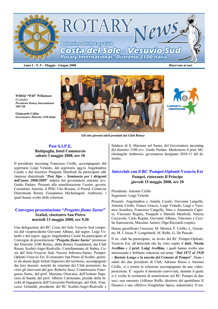 Anno I - N. 5 ~ Maggio - Giugno 2008 Riservato ai soci Wilfrid “Wilf” Wilkinson (Canada) Presidente Rotary International 2007-08 Giancarlo Calise Governatore Distretto 2100 Italia Gli otto giovani atleti premiati dai Club Rotary Post S.I.P.E. Battipaglia, hotel Commercio sabato 3 maggio 2008, ore 10 Il presidente incoming Francesco Cirillo, accompagnato dal segretario Luigi Velardo, dal segretario agg.to Angelandrea Casale e dal tesoriere Pasquale Manfredi ha partecipato alla riunione distrettuale “Post Sipe – Seminario per i dirigenti dell’anno 2008/2009” indetta dal governatore entrante avv. Guido Parlato. Presenti alla manifestazione l‟assist. govern. Costantino Astarita, il PDG Vito Rosano, il Presid. Comm.ne Distrettuale Rotary Foundation Michelangelo Ambrosio, i quali hanno svolto delle relazioni. Convegno presentazione “Progetto fiume Sarno” Scafati, cineteatro San Pietro martedì 13 maggio 2008, ore 9,30 Una delegazione del RC Costa del Sole Vesuvio Sud composta dal vicepresidente Giovanni Albano, dal segret. Luigi Velardo e dal segret. agg.to Angelandrea Casale ha partecipato al Convegno di presentazione “Progetto fiume Sarno” promosso dal Distretto 2100 Rotary, dalla Rotary Foundation, dai Club Rotary Scafati-Angri-Realvalle, Castellammare di Stabia, Costa del Sole-Vesuvio Sud, Nocera Inferiore-Sarno, PompeiOplonti-Vesuvio Est. Il cineteatro San Pietro di Scafati, gremito da alunni degli Istituti Superiori del territorio, accompagnati dai loro docenti, nonché da rotariani dei Club promotori, ha visto gli interventi del gen. Roberto Jucci, Commissario Emergenza Sarno, del prof. Massimo Ottaviani, dell‟Istituto Superiore di Sanità, del prof. Alberto Carotenuto, preside della facoltà di Ingegneria dell‟Università Parthenope, del Dott. Francesco Grimaldi, presidente del RC Scafati-Angri-Realvalle e Sindaco di S. Marzano sul Sarno, del Governatore incoming del distretto 2100 avv. Guido Parlato. Moderatore il prof. Michelangelo Ambrosio, governatore designato 2010-11 del distretto. Interclub con il RC Pompei-Oplonti-Vesuvio Est Pompei, ristorante Il Principe giovedì 15 maggio 2008, ore 20 Presidente: Antonio Cirillo Segretario: Luigi Velardo Presenti: Angelandrea e Amalia Casale, Giovanni Langella, Antonio Cirillo, Franco Gracco, Luigi Velardo, Luigi e Veronica Acanfora, Francesco Cangella, Nino e Annamaria Caprini, Vincenzo Regina, Pasquale e Daniela Manfredi, Nunzia Caccavale, Carlo Regina, Giovanni Albano, Vincenzo e Cecilia Santonicola, Massimo Autieri, Olga Ricciardi (ospite). Hanno giustificato l‟assenza: M. Monica, F. Cirillo, L. Graziano, M. I. Iossa, P. Longobardi, M. Rollo, G. De Pascale. Il ns. club ha partecipato, su invito del RC Pompei-OplontiVesuvio Est, all‟interclub che ha visto ospite il dott. Nicola Avellino e il prof. Luigi Avellino, i quali hanno svolto una interessante e brillante relazione sul tema: “Dal 1872 al 1928 – Bartolo Longo e la nascita del Comune di Pompei”. Dopo i saluti dei due presidenti di Club, Adriano Russo e Antonio Cirillo, si è tenuta la relazione accompagnata da una videoproiezione. E‟ seguito il momento conviviale, durante il quale si è svolta la cerimonia di ammissione nel RC Pompei di due soci, uno onorario (Alfonso Ruffo, direttore del quotidiano Il Denaro) e uno effettivo (Guglielmo Spera, industriale). Il tra- dizionale scambio di labaretti ha chiuso la serata. Langella. Il segretario Velardo, nel sostituire il Presidente assente, ha dato informazioni rotariane e letto la lettera mensile del gov. Calise. Si è passato a discutere delle prossime attività sociali di giugno e della serata finale del Premio Atleta dell‟Anno, che si terrà a Torre del Greco il 29 p.v. Due gli atleti premiati dal ns. RC: Anna Elisa Villani (pallavolo) e Alfredo Norvello (maratona). Interclub Premio “Atleta dell’Anno – E.Barile” VII ediz. 2008, hotel Sakura, Torre del Greco giovedì 29 Maggio 2008, ore 20 Presidente: Antonio Cirillo Segretario: Luigi Velardo Un momento dell’interclub con il RC Pompei - Oplonti Presenti: Giovanni Albano, Luigi e Veronica Acanfora, Nunzia Caccavale, Angelandrea e Amalia Casale, Antonio Cirillo, Giovanni Langella, Luigi Velardo, Anna Elisa Villani e familiari, Alfredo Norvello e Signora. XXX Congresso Distretto 2100 Paestum, hotel Ariston, sabato 17 maggio 2008, ore 9,30 La VII edizione del Premio “Atleta dell’Anno”, intitolato alla memoria di Enzo Barile, si è tenuta al Sakura Hotel di Torre del Greco. Sei i Rotary Club partecipanti alla manifestazione: Presenti: Antonio Cirillo, Franco Gracco, Luigi Velardo, Giovanni Albano, Angelandrea e Amalia Casale, Pasquale Manfredi, Maria Rollo, Nunzia Caccavale. Una delegazione del RC Costa del Sole ha partecipato al XXX Congresso distrettuale svoltosi a Paestum e che ha visto protagonista il governatore Giancarlo Calise. Ha rappresentato il Presidente Internazionale il PDG George Richard, belga. Interessanti le relazioni dedicate alla Formazione, alle Nuove Generazioni, ai Volontari, alla Rotary Foundation e alla Polio Plus, alle Azioni Prioritarie, alle Fellowships. Il gov. Calise ha infine, illustrato il suo impegno di un anno al servizio del distretto. Il tavolo presidenziale con i rappresentanti dei sei club Una delegazione del Club partecipa ai lavori del Congresso Riunione al caminetto Pompei, hotel Amleto, lunedì 26 maggio 2008, ore 20 Presenti: Luigi Velardo, Franco Gracco, Nino Caprini, Nunzia Caccavale, Angelandrea Casale, Mario Monica, Giovanni 2 Cava de‟ Tirreni, col presidente prof. Gennaro Galdo; Costa del Sole – Vesuvio Sud, col presidente dr. Antonio Cirillo; Nocera Inferiore – Sarno, col presidente ing. Nicola De Pascale; Ottaviano, con il past presidente dott. Luigi Romano; Pompei- Oplonti-Vesuvio Est, col delegato avv. Giovanni Merlino; Torre del Greco – Comuni Vesuviani, con il presidente prof. Gregorio Laino. Dopo i saluti dei rappresentanti dei Club si è svolta la premiazione dei giovani at