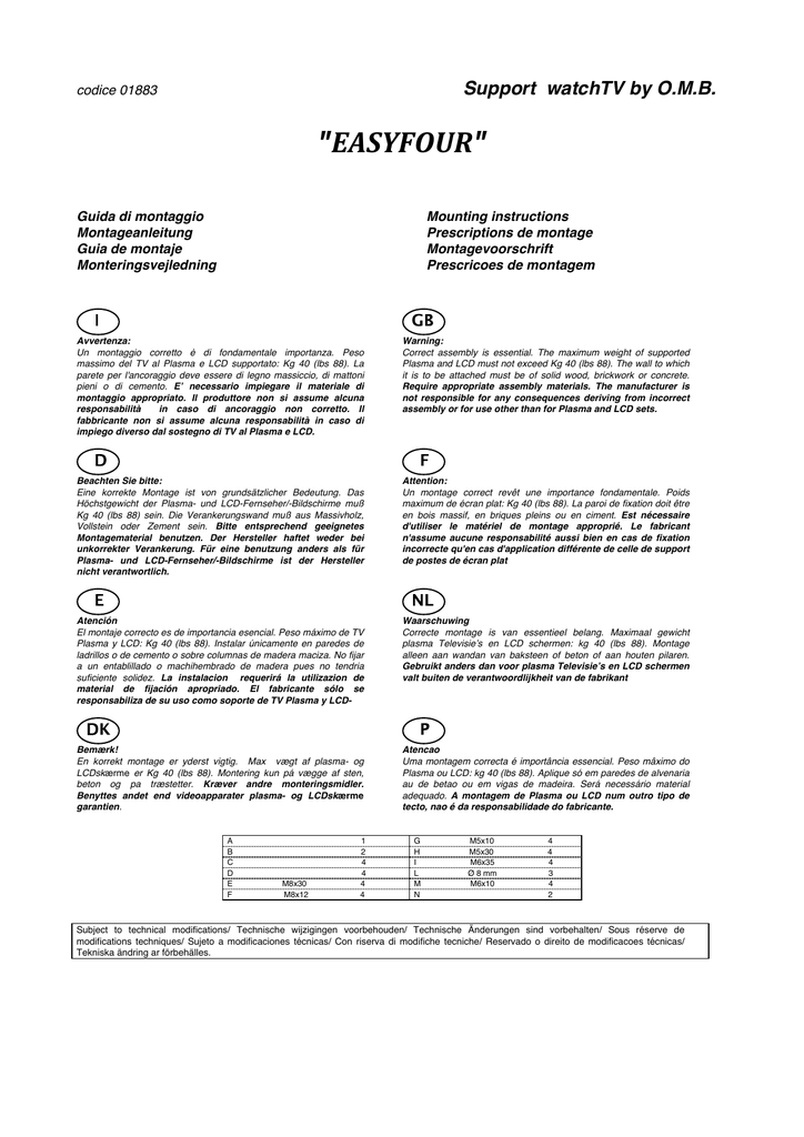 Support watchTV by O.M.B. codice 01883 "EASYFOUR" Guida di montaggio Montageanleitung Guia de montaje Monteringsvejledning Mounting instructions Prescriptions de montage Montagevoorschrift Prescricoes de montagem Avvertenza: Un montaggio corretto è di fondamentale importanza. Peso massimo del TV al Plasma e LCD supportato: Kg 40 (lbs 88). La parete per l'ancoraggio deve essere di legno massiccio, di mattoni pieni o di cemento. Eʼ necessario impiegare il materiale di montaggio appropriato. Il produttore non si assume alcuna responsabilità in caso di ancoraggio non corretto. Il fabbricante non si assume alcuna responsabilità in caso di impiego diverso dal sostegno di TV al Plasma e LCD. Warning: Correct assembly is essential. The maximum weight of supported Plasma and LCD must not exceed Kg 40 (lbs 88). The wall to which it is to be attached must be of solid wood, brickwork or concrete. Require appropriate assembly materials. The manufacturer is not responsible for any consequences deriving from incorrect assembly or for use other than for Plasma and LCD sets. Beachten Sie bitte: Eine korrekte Montage ist von grundsätzlicher Bedeutung. Das Höchstgewicht der Plasma- und LCD-Fernseher/-Bildschirme muß Kg 40 (lbs 88) sein. Die Verankerungswand muß aus Massivholz, Vollstein oder Zement sein. Bitte entsprechend geeignetes Montagematerial benutzen. Der Hersteller haftet weder bei unkorrekter Verankerung. Für eine benutzung anders als für Plasma- und LCD-Fernseher/-Bildschirme ist der Hersteller nicht verantwortlich. Attention: Un montage correct revêt une importance fondamentale. Poids maximum de écran plat: Kg 40 (lbs 88). La paroi de fixation doit être en bois massif, en briques pleins ou en ciment. Est nécessaire d'utiliser le matériel de montage approprié. Le fabricant n'assume aucune responsabilité aussi bien en cas de fixation incorrecte qu'en cas d'application différente de celle de support de postes de écran plat Atención El montaje correcto es de importancia esencial. Peso máximo de TV Plasma y LCD: Kg 40 (lbs 88). Instalar únicamente en paredes de ladrillos o de cemento o sobre columnas de madera maciza. No fijar a un entablillado o machihembrado de madera pues no tendria suficiente solidez. La instalacion requerirá la utilizazion de material de fijación apropriado. El fabricante sólo se responsabiliza de su uso como soporte de TV Plasma y LCD- Waarschuwing Correcte montage is van essentieel belang. Maximaal gewicht plasma Televisieʼs en LCD schermen: kg 40 (lbs 88). Montage alleen aan wandan van baksteen of beton of aan houten pilaren. Gebruikt anders dan voor plasma Televisieʼs en LCD schermen valt buiten de verantwoordlijkheit van de fabrikant Bemærk! En korrekt montage er yderst vigtig. Max vægt af plasma- og LCDskærme er Kg 40 (lbs 88). Montering kun pá vægge af sten, beton og pa træstetter. Kræver andre monteringsmidler. Benyttes andet end videoapparater plasma- og LCDskærme garantien. Atencao Uma montagem correcta é importância essencial. Peso mâximo do Plasma ou LCD: kg 40 (lbs 88). Aplique só em paredes de alvenaria au de betao ou em vigas de madeira. Será necessário material adequado. A montagem de Plasma ou LCD num outro tipo de tecto, nao é da responsabilidade do fabricante. A B C D E F M8x30 M8x12 1 2 4 4 4 4 G H I L M N M5x10 M5x30 M6x35 Ø 8 mm M6x10 4 4 4 3 4 2 Subject to technical modifications/ Technische wijzigingen voorbehouden/ Technische Änderungen sind vorbehalten/ Sous réserve de modifications techniques/ Sujeto a modificaciones técnicas/ Con riserva di modifiche tecniche/ Reservado o direito de modificacoes técnicas/ Tekniska ändring ar förbehälles.