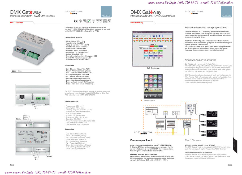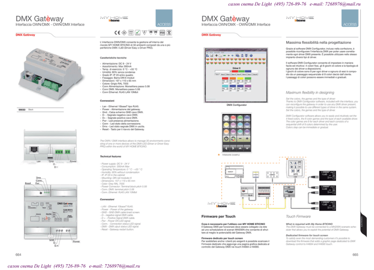 салон света De Light (495) 726-89-76 e-mail: [email protected] DMX Gatèway DMX Gatèway Interfaccia OWN/DMX - OWN/DMX Interface ACCESS DMX Gatèway Interfaccia OWN/DMX - OWN/DMX Interface DMX Gatèway Massima flessibilità nella progettazione L'interfaccia OWN/DMX consente la gestione all’interno del mondo MY HOME BTICINO di 30 ambienti composti da una o più periferiche DMX i-LèD (Driver Easy o Driver PRO). Grazie al software DMX Configurator, incluso nella confezione, è possibile riconfigurare l’interfaccia DMX per poter usare correttamente ogni driver DMX presente. È possibile utilizzare nello stesso impianto diversi tipi di driver. Caratteristiche tecniche - Il software DMX Configurator consente di impostare in maniera facile ed intuitiva i 4 colori fissi, gli 8 giochi di colore e la tipologia di ognuno dei driver a disposizione. I giochi di colore sono 8 per ogni driver e ognuno di essi è composto da un passaggio sequenziale di 8 colori decisi dall’utente. I passaggi di colori possono essere immediati o graduali. Alimentazione: DC 9 - 24 V Assorbimento: Max 300mA Temp. di esercizio: 0 °C - +55 °C Umidità: 80% senza condensa Grado IP: IP 20 entro quadro Fissaggio: Barra DIN 6 moduli Dimensioni: 107 x 110 x 65 mm Colore: Grigio RAL 7035 Conn Alimentazione: Morsettiera passo 5.08 Conn DMX: Morsettiera passo 5.08 Conn Ethernet: RJ45 LAN 10Mbit Maximum flexibility in designing Connessioni 99050 Black ACCESS - DMX Configurator Lan - Ethernet 10baseT tipo RJ45. Power - Alimentazione del gateway. Gnd - Calza schermo GND cavo DMX. D- - Segnale negativo cavo DMX. D+ - Segnale positivo cavo DMX. Pwr - Led presenza alimentazione. Conn - Led stato della connessione. Dmx - Led stato segnale DMX in uscita. Reset - Tasto per il riavvio del Gateway. Set the colors, the games and the type of driver: Thanks to DMX Configurator software, included with the interface, you can reconfigure the gateway in order to use any DMX driver present, making it possible to use different types of driver in the same system. Set the colors, the games and the type of driver. DMX Configurator software allows you to easily and intuitively set the 4 fixed colors, the 8 color games and the type of each available driver. The color games are 8 for each driver and each consists of a sequential shift of 8 colors determined by the user. Colors step can be immediate or gradual. The OWN / DMX interface allows to manage 30 environments consisting of one or more devices of the DMX-LED (Driver or Driver Easy PRO) within the world of MY HOME BTICINO. Technical features * FIRMWARE EXAMPLE - Power supply: DC 9 - 24 V - Consumption: 300mA Max - Operating Temperature: 0 ° C - +55 ° C - Humidity: 80% without condensation - IP: IP 20 in the cabinet - Mounting: DIN rail modules 6 - Dimensions: 107 x 110 x 65 mm - Color: Grey RAL 7035 - Power Connector: Terminal block pitch 5.08 - Conn. DMX: terminal pitch 5.08 - Conn. Ethernet: RJ45 LAN 10Mbit * - LAN - Ethernet 10baseT RJ45. - Power - Power of the gateway. - GND - GND DMX cable braid screen. - D-- negative signal DMX cable. - D + - Positive Signal DMX cable. - Pwr - Power ON LED signal. - Conn. - Connection status LED signal. - DMX - DMX utput status LED signal. - Reset - Gateway restart button. Firmware per Touch Touch Firmware Cosa è necessario per l’utilizzo con MY HOME BTICINO Il Gateway DMX per funzionare deve essere collegato via rete ad uno schedulatore di scenari MH200N che consente di sfruttare al meglio le potenzialità del Gateway DMX. What is required with My Home BTICINO The DMX Gateway must be connected to a MH200N scenario scheduler that allows you to exploit the potential of DMX Gateway. Firmware dedicato per touch screen Per soddisfare anche i clienti più esigenti è possibile scaricare il Firmware dedicato che aggiunge una pagina grafica dedicata al controllo del Gateway DMX nei touch H4684 e H4690. 664 салон света De Light (495) 726-89-76 e-mail: [email protected] Dedicated firmware for touch screen To satisfy even the most demanding customers it’s possible to download the firmware that adds a graphic page dedicated to DMX Gateway control to H4684 and H4690 touch. 665 ELECTRONICS Connessioni