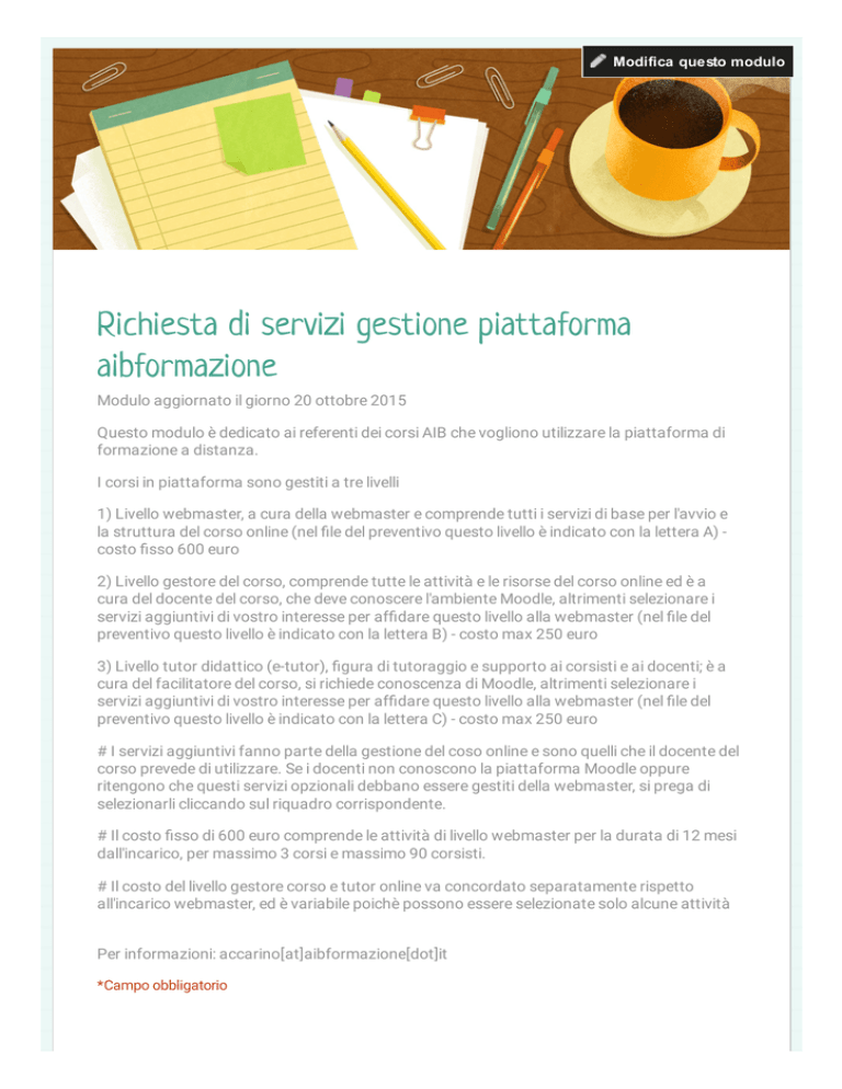 Modifica questo modulo Richiesta di servizi gestione piattaforma aibformazione Modulo aggiornato il giorno 20 ottobre 2015 Questo modulo è dedicato ai referenti dei corsi AIB che vogliono utilizzare la piattaforma di formazione a distanza. I corsi in piattaforma sono gestiti a tre livelli 1) Livello webmaster, a cura della webmaster e comprende tutti i servizi di base per l'avvio e la struttura del corso online (nel le del preventivo questo livello è indicato con la lettera A) costo sso 600 euro 2) Livello gestore del corso, comprende tutte le attività e le risorse del corso online ed è a cura del docente del corso, che deve conoscere l'ambiente Moodle, altrimenti selezionare i servizi aggiuntivi di vostro interesse per af dare questo livello alla webmaster (nel le del preventivo questo livello è indicato con la lettera B) - costo max 250 euro 3) Livello tutor didattico (e-tutor), gura di tutoraggio e supporto ai corsisti e ai docenti; è a cura del facilitatore del corso, si richiede conoscenza di Moodle, altrimenti selezionare i servizi aggiuntivi di vostro interesse per af dare questo livello alla webmaster (nel le del preventivo questo livello è indicato con la lettera C) - costo max 250 euro # I servizi aggiuntivi fanno parte della gestione del coso online e sono quelli che il docente del corso prevede di utilizzare. Se i docenti non conoscono la piattaforma Moodle oppure ritengono che questi servizi opzionali debbano essere gestiti della webmaster, si prega di selezionarli cliccando sul riquadro corrispondente. # Il costo sso di 600 euro comprende le attività di livello webmaster per la durata di 12 mesi dall'incarico, per massimo 3 corsi e massimo 90 corsisti. # Il costo del livello gestore corso e tutor online va concordato separatamente rispetto all'incarico webmaster, ed è variabile poichè possono essere selezionate solo alcune attività Per informazioni: accarino[at]aibformazione[dot]it *Campo obbligatorio Indicare titolo e durata del corso (periodo e ore online) * Indicare numero di partecipanti al corso online * Indicare nome e recapito referente del corso * LIVELLO WEBMASTER Servizi di base - Creazione corso online (Apertura istanza corso online - Progettazione interfaccia) - Gestione degli utenti (Primo contatto via e-mail con i corsisti, Iscrizione utenti, Veri ca del primo accesso - Supporto tecnico ai corsisti che hanno dif coltà di accesso (telefonico, e-mail, skype) - Gestione password e database iscritti) - Attivazione e gestione dei pro li (docente, studente, tutor, ospite) - Monitoraggio (Backup settimanale di corso e attività) - Reportistica (Report individuale per ogni corsista in cui viene registrata tutta la sua attività per l’intera durata del corso) - Tutoraggio (creazione guida di accesso e navigazione al corso online) CREAZIONE CORSO ONLINE Servizio aggiuntivo: Lezione in presenza / web conference sull’uso della piattaforma (2 ore) REPORTISTICA Servizio aggiuntivo: Analisi di partecipazione (gestione registro ore online e attività effettuata) LIVELLO GESTORE DEL CORSO GESTIONE IN ITINERE CORSO ONLINE Servizio aggiuntivo: interventi nell'interfaccia del corso CREAZIONE E GESTIONE ATTIVITA' E RISORSE DI BASE Servizio aggiuntivo: gestione dei blocchi Servizio aggiuntivo: gestione delle attività Chat, Compito, Database, Feedback, Forum, Glossario Scelta, Sondaggio) Servizio aggiuntivo: gestione delle risorse File (.pdf, .doc, .rtf, le audio, video, ecc.), Cartella, Link esterni, Pagina Web, Etichetta, Libro Servizio aggiuntivo: creazione e gestione risorse e attività avanzate LIVELLO E-TUTOR Servizio aggiuntivo: supporto alla navigazione e gestione del corso online a docenti e studenti via skype, telefono, e-mail Servizio aggiuntivo: creazione guida all’uso delle risorse Servizio aggiuntivo: creazione guida all’uso delle attività Servizio aggiuntivo: pubblicazione news in forum dedicato e in blocco “Notizie in evidenza” Servizio aggiuntivo: gestione del forum di Helpdesk Servizio aggiuntivo: editing e conversione di documenti adattabili al corso online Note Invia Non inviare mai le password tramite Moduli Google. Pow ered by Questi contenuti non sono creati né avallati da Google. Segnala una violazione - Termini di servizio - Ulteriori termini