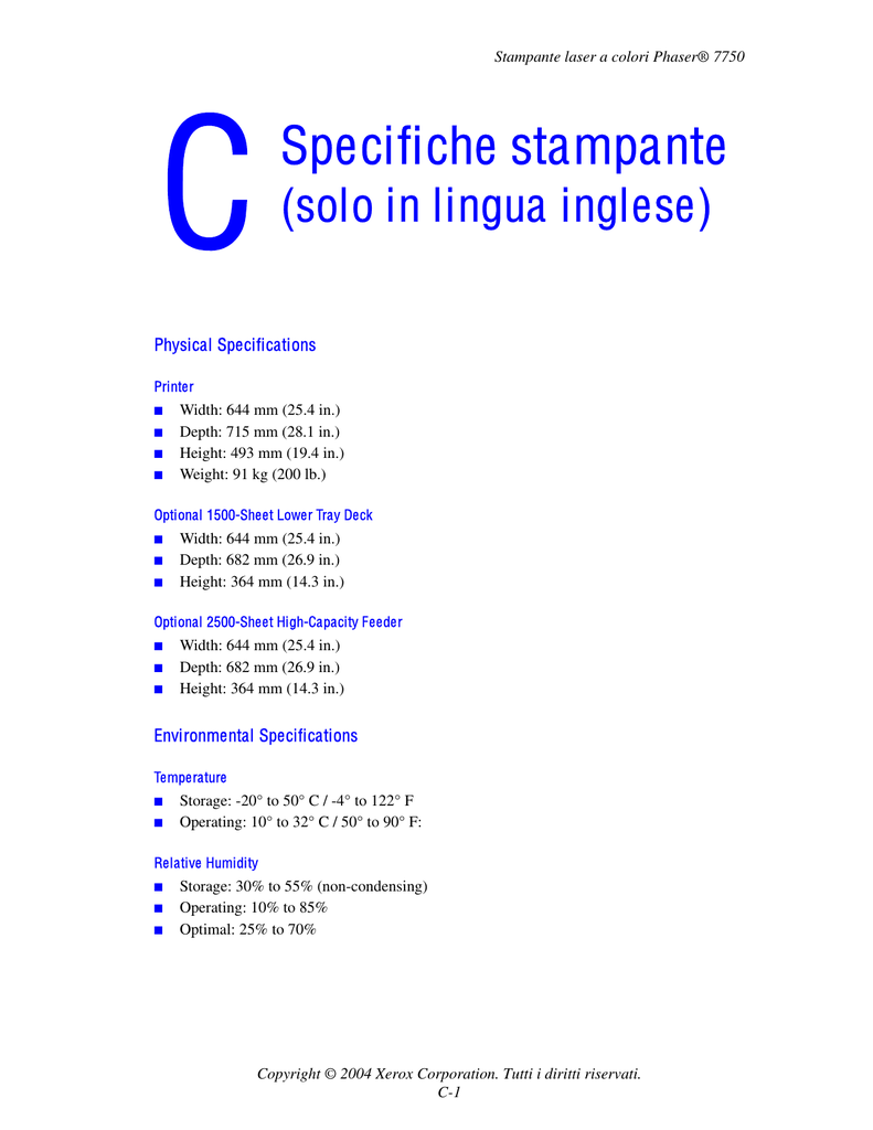 Stampante laser a colori Phaser® 7750 Specifiche stampante (solo in lingua inglese) Physical Specifications Printer ■ ■ ■ ■ Width: 644 mm (25.4 in.) Depth: 715 mm (28.1 in.) Height: 493 mm (19.4 in.) Weight: 91 kg (200 lb.) Optional 1500-Sheet Lower Tray Deck ■ ■ ■ Width: 644 mm (25.4 in.) Depth: 682 mm (26.9 in.) Height: 364 mm (14.3 in.) Optional 2500-Sheet High-Capacity Feeder ■ ■ ■ Width: 644 mm (25.4 in.) Depth: 682 mm (26.9 in.) Height: 364 mm (14.3 in.) Environmental Specifications Temperature ■ ■ Storage: -20° to 50° C / -4° to 122° F Operating: 10° to 32° C / 50° to 90° F: Relative Humidity ■ ■ ■ Storage: 30% to 55% (non-condensing) Operating: 10% to 85% Optimal: 25% to 70% Copyright © 2004 Xerox Corporation. Tutti i diritti riservati. C-1 Electrical Specifications Available in four (4) configurations: 7750B, 7750DN, 7750GX, 7750DXF ■ ■ ■ 110-127 VAC, 50/60 Hz 220-240 VAC, 50/60 Hz ENERGY STAR qualified printer Performance Specifications Resolution ■ ■ ■ 600 x 600 dpi 1200 x 600 dpi 1200 x 1200 dpi Print Speed ■ Up to 35 pages per minute (ppm) Controller Specifications 715 MHz processor Memory ■ ■ ■ ■ ■ 256 MB PC133 DRAM standard on the Phaser 7750B Color Laser Printer 384 MB PC133 DRAM standard on the Phaser 7750DN Color Laser Printer 512 MB PC133 DRAM standard on the Phaser 7750GX Color Laser Printer 512 MB PC133 DRAM standard on the Phaser 7750DXF Color Laser Printer Upgradable to a maximum of 1024 MB Page Description Languages (PDL) ■ ■ ■ PCL5c Adobe PostScript 3 Adobe PDF–Direct Residential Fonts ■ ■ 137 PostScript Type 1 81 PCL5c Interfaces ■ ■ Ethernet 10BaseT and 100BaseTx USB versions 1.0, 1.1, and 2.0 Stampante laser a colori Phaser® 7750 C-2