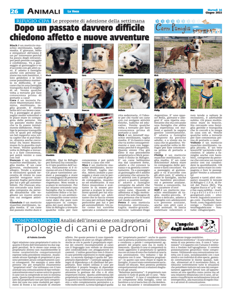 26 .ANIMALI ... Martedì 16 Giugno 2015 La Voce RIFUGIO CIPA Le proposte di adozione della settimana Dopo un passato davvero difficile chiedono affetto e nuove avventure Black è un meticcio maschio sterilizzato, taglia media. E' giovane, bello e simpatico! All'inizio è un po' introverso perchè ha paura degli estranei, poi però prende coraggio e confidenza. Va a passeggio al guinzaglio e va d'accordo con gli altri cani. E' adatto a famiglie anche con persone anziane ma non bambini, i loro gridolini e le loro corse potrebbero metterlo in difficoltà. E' un cane che in una famiglia tranquilla darà il meglio di sè. Venite qualche volta a trovarlo per fare conoscenza prima di portarlo a casa! Cora è un incrocio Pastore Maremmano femmina, sterilizzata, taglia grande. E’ molto bella ed è un bravo cane. Va a passeggio al guinzaglio molto volentieri e le piace stare in compagnia delle persone. Ha un passato molto duro che la fa essere inizialmente diffidente. Predilige le persone tranquille con le quali poi stringe un bel rapporto una volta capito che si può fidare, diventa anche coccolona! Da bravo Maremmano fa la guardia molto bene. Venite qualche volta in Rifugio a trovarla e a fare conoscenza, poi potrà venire a casa con voi! Duncan è un meticcio maschio sterilizzato, taglia media. E' un cane giovane, esuberante e allegro. Tende a scalare le recinzioni quindi necessita di vivere in casa perchè vengano scongiurate fughe pericolose per lui e per gli automobilisti. Per Duncan stiamo cercando una famiglia composta da persone dinamiche che vogliano un nuovo amico con cui svolgere attività. Gianduia è un meticcio maschio sterilizzato, taglia media. E’ un cane dal passato molto duro e Black Cora Petra Nick Riff Duncan Velluto Philip Max conoscenza e poi potrà venire a casa con voi! Max è un meticcio maschio sterilizzato, incrocio Pitbull, taglia media. Adora andare a passeggio e stare con le persone. E’ un cane di grande compagnia, maestoso ed esuberante. Il suo fisico muscoloso e scattante lo fa essere propenso a scalare le recinzioni quindi per lui stiamo cercando un adottante che lo faccia vivere in casa per evitare fughe pericolose per lui e per gli automobilisti. Un cane come lui sarebbe sprecato a condurre una vita sedentaria, è l’ideale per chi vuole un cane con cui svolgere attività fisiche, ludiche ed educative. Venite qualche volta a trovarlo per fare conoscenza prima di portarlo a casa! Nick è un Amstaff maschio sterilizzato, taglia media. E’ il classico cane che va scelto consapevolmente e non con leggerezza perché è stupendo. Questo errore l’ha già fatto il suo precedente proprietario e Nick poveretto è finito in Rifugio. E’ un cane bellissimo ma dal carattere forte, adatto a chi conosce la razza e sa gestirla correttamente. Va a passeggio al guinzaglio ed è adatto a persone che amano fare attività con il proprio amico a quattro zampe. E’ adatto a famiglie composte da adulti che lo vogliano tenere come unico cane. Quando si affeziona si lega moltissimo! Ha solo bisogno di una persona che lo tratti nel modo corretto! Petra è una meticcia femmina sterilizzata, taglia medio-grande. Incrocio Labrador-Dogo Argentino. E’ uno spasso! Bella, giovane e allegra! E’ una tipetta esuberante che sta cercando una famiglia che abbia già esperienza coi molossi e quindi la sappia gestire correttamente. E’ adatta a famiglie composte da persone adulte, e a vivere sia in casa che in giardino. Venite qualche volta in Rifugio per fare conoscenza prima di portarla a casa! Philip è un meticcio maschio sterilizzato, taglia media. E’ un cane dolcissimo! Adora stare in compagnia delle persone e farsi coccolare. Va a passeggio al guinzaglio e va d’accordo con gli altri cani. E’ adatto a tutte le famiglie, anche con bambini piccolissimi e persone anziane. Venite a conoscerlo, ha un carattere d’oro! Riff è un meticcio maschio sterilizzato di taglia medio-piccola. E' dolce e delicato, adatto a famiglie con adolescenti e/o persone anziane, anche con altri cani e altri animali. Si lascia toelettare volentieri e non tende a saltare le recinzioni, è adottabile subito. Gli piace moltissimo stare in braccio. Sta cercando una famiglia gentile e tranquilla che lo coccoli e lo tenga in casa con sè. Venite qualche volta a trovarlo per fare conoscenza prima di portarlo a casa! Velluto è un meticcio maschio sterilizzato, taglia piccola. E’ un vero tesoro!!E’ socievole e dolcissimo. E’ adatto a famiglie anche con bambini, composte da persone che cercano un nuovo amico con cui condividere la quotidianità. Gli piace tanto stare in compagnia e fare le passeggiate! Venite a conoscerlo! Questi e tanti altri simpatici musetti li trovate al Rifugio C.I.P.A. di Fenil del Turco (RO), Via Argine Zucca n° 3/E - tel. e fax 0425/476835 – mail: l e g a d e l c a n e r o v [email protected] – sito: www.legadelcanerovigo.com - Facebook: facebook.com/legadelcanerovigo – Twitter: twitter@legadelcane – Youtube: rifugiocipatv. Gianduia difficile. Qui in Rifugio per fortuna ha conosciuto il lato positivo dell’uomo, fisicamente si è rimesso ed ora è fiducioso. Gli piace tantissimo andare a passeggio e stare in compagnia di persone dai modi delicati e che lo rispettano. Non tende a scalare le recinzioni. Per lui stiamo cercando una famiglia che lo renda finalmente felice e lo faccia vivere in un ambiente tranquillo come unico cane dato che pare non apprezzare la compagnia dei suoi simili. Venite in Rifugio a trovarlo qualche volta per fare COMPORTAMENTO Analisi dell’interazione con il proprietario Tipologie di cani e padroni di Fabiola Zanella Ogni relazione cane-proprietario è unica in quanto è frutto dell’interazione tra due soggetti peculiari. Se lo stesso cane avesse un proprietario diverso non manifesterebbe le stesse caratteristiche comportamentali espresse nella precedente relazione. Analizzando alcune tipologie di proprietari si possono prevedere alcuni compo