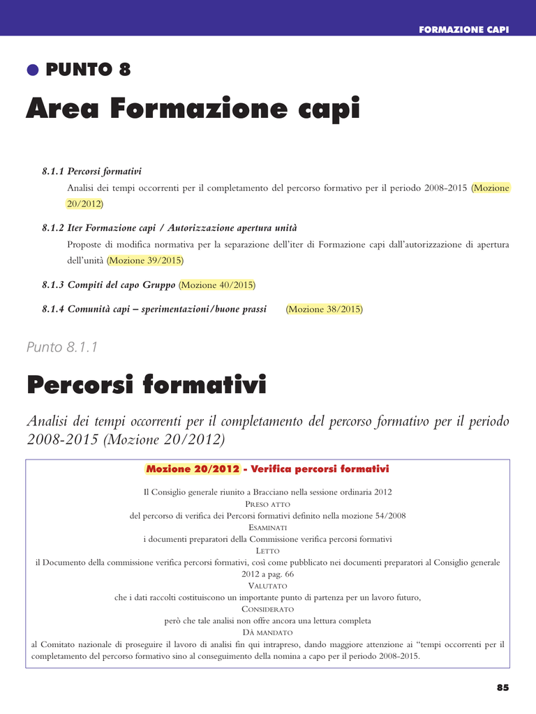 FORMAZIONE CAPI ● PUNTO 8 Area Formazione capi 8.1.1 Percorsi formativi Analisi dei tempi occorrenti per il completamento del percorso formativo per il periodo 2008-2015 (Mozione 20/2012) 8.1.2 Iter Formazione capi / Autorizzazione apertura unità Proposte di modifica normativa per la separazione dell’iter di Formazione capi dall’autorizzazione di apertura dell’unità (Mozione 39/2015) 8.1.3 Compiti del capo Gruppo (Mozione 40/2015) 8.1.4 Comunità capi – sperimentazioni/buone prassi (Mozione 38/2015) Punto 8.1.1 Percorsi formativi Analisi dei tempi occorrenti per il completamento del percorso formativo per il periodo 2008-2015 (Mozione 20/2012) Mozione 20/2012 - Verifica percorsi formativi Il Consiglio generale riunito a Bracciano nella sessione ordinaria 2012 PRESO ATTO del percorso di verifica dei Percorsi formativi definito nella mozione 54/2008 ESAMINATI i documenti preparatori della Commissione verifica percorsi formativi LETTO il Documento della commissione verifica percorsi formativi, così come pubblicato nei documenti preparatori al Consiglio generale 2012 a pag. 66 VALUTATO che i dati raccolti costituiscono un importante punto di partenza per un lavoro futuro, CONSIDERATO però che tale analisi non offre ancora una lettura completa DÀ MANDATO al Comitato nazionale di proseguire il lavoro di analisi fin qui intrapreso, dando maggiore attenzione ai “tempi occorrenti per il completamento del percorso formativo sino al conseguimento della nomina a capo per il periodo 2008-2015. 85 PUNTO 8 PERCORSO E RISULTATI DELLA VERIFICA DEI PERCORSI FORMATIVI “Bisogna rendere ogni cosa il più semplice possibile, ma non più semplice di ciò che sia possibile!” (Albert Einstein) PREMESSA Il cammino di verifica dei percorsi formativi si è ispirato a tre parole chiave: fedeltà, continuità, globalità. Fedeltà: a quanto indicato dalla mozione 54.2008 - integrata dalla 20.2012 - riguardo i criteri di verifica dei percorsi formativi. Continuità: rispetto le precedenti verifiche intermedie. Globalità: il percorso non prescinde dalle riflessioni già maturate in diversi ambiti associativi, dall’inizio del nuovo percorso formativo ad oggi (lavori moz. 41/13 sulla comunità capi, Atti degli NTT 2010 e 2013, commissione 39/15, …). In primo luogo ci si è concentrati sui criteri di verifica espressi dalle mozioni 54/08 e 20/12: efficacia; utilità; impatto, realizzando una serie di rilevamenti tra i capi e quadri associativi (“questionari sulla verifica percorsi formativi” inviati a giugno 2015), integrati da analisi storiche sui dati dei censimenti dal 2007 al 2015. Tali rilevamenti estendono quanto emerso nella verifica intermedia del 2011. Il risultato di questo lavoro è riportato nella seguente sintesi e nei documenti di dettaglio allegati. Articolazione del presente documento: • Sintesi dei lavori: criteri di verifica adottati, attività svolte, indicatori e strumenti • Risultati ottenuti (riassunto, i dettagli negli allegati) • Primi commenti ai risultati. SINTESI DEI LAVORI Criteri di verifica adottati, attività svolte, indicatori e strumenti Criteri di verifica della mozione 54/08: in ogni caso il Piano di Valutazione dovrà offrire riscontri circa i successivi criteri di verifica. In riferimento all’area EFFICACIA: • lo sviluppo delle capacità di progettare e attuare da parte dei capi itinerari personali di formazione continua; • un positivo livello di soddisfazione (es: area progetto del capo) dei partecipanti agli eventi formativi; • il riconoscimento della fruizione di formazione metodologica nei CFM più adeguata. In riferimento all’area UTILITÀ: • una maggiore tenuta nel tempo dei capi giovani; • la riduzione complessiva del turn-over dei capi; • la riduzione dei tempi della formazione (anni per ottenere la nomina a capo); • analisi tempi occorrenti per il completamento del percorso formativo sino al conseguimento della nomina a capo per il periodo 2008-2015. In riferimento all’area IMPATTO: • l’aumento dei partecipanti agli eventi formativi; 86 l’incremento degli educatori formati e continuità del servizio educativo e non; • l’aumento delle unità censite. Integrazione mozione 20.2012: dà mandato al Comitato nazionale di proseguire il lavoro di analisi fin qui intrapreso, dando maggiore attenzione ai “tempi occorrenti per il completamento del percorso formativo sino al conseguimento della nomina a capo” per il periodo 2008-2015. • Attività svolte Per la verifica dell’EFFICACIA sono stati somministrati una serie di questionari ai Responsabili di Zona (tutti), capi Gruppo (tutti) e ad un sottoinsieme dei capi che hanno partecipato agli eventi dell’iter, CFT (anno scout 2015), CFM e CFA (anno scout 2014) e a chi ha conseguito la nomina a capo nell’anno 2013. La scelta di sottoporre i questionari a capi che hanno frequentato gli eventi recentemente ha l’obiettivo di ottenere un riscontro più affidabile e fedele, meno influenzato dalla successiva esperienza/crescita nel vissuto associativo. Per le verifiche area UTILITÀ ed IMPATTO, è stata effettuata una analisi storico/statistica sui dati dei censimenti degli anni 2007 – 2015 cercando di analizzare tutti i criteri indicati nella mozione 54/08 a scapito dell’approfondimento rigoroso di dettaglio o elaborativo di ognuno di essi (rispondendo alle richieste di completezza della mozione 20/12). Sono stati inviati oltre 10.000 questionari, raccogliendo ed elaborando ca. 4.000 risposte nell’arco di due mesi. NOTA: la scelta dell’intervallo di analisi 2007-2015 è stato un compromesso dettato dalla disponibilità dei dati, vincolati dallo “stop” dei sistemi informatici dal mese di marzo 2015. Indicatori utilizzati Per la verifica dell’area EFFICACIA, gli aspetti principali che erano stati indicati (moz. 54/08) sono: EFFICACIA 1. lo sviluppo delle capacità di progettare e attuare da parte dei capi itinerari personali di formazione continua EFFICACI