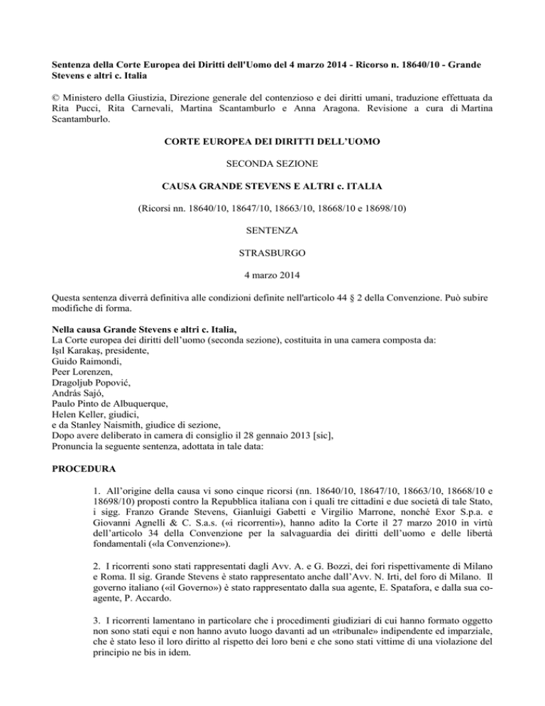 Sentenza della Corte Europea dei Diritti dell'Uomo del 4 marzo 2014 - Ricorso n. 18640/10 - Grande Stevens e altri c. Italia © Ministero della Giustizia, Direzione generale del contenzioso e dei diritti umani, traduzione effettuata da Rita Pucci, Rita Carnevali, Martina Scantamburlo e Anna Aragona. Revisione a cura di Martina Scantamburlo. CORTE EUROPEA DEI DIRITTI DELL’UOMO SECONDA SEZIONE CAUSA GRANDE STEVENS E ALTRI c. ITALIA (Ricorsi nn. 18640/10, 18647/10, 18663/10, 18668/10 e 18698/10) SENTENZA STRASBURGO 4 marzo 2014 Questa sentenza diverrà definitiva alle condizioni definite nell'articolo 44 § 2 della Convenzione. Può subire modifiche di forma. Nella causa Grande Stevens e altri c. Italia, La Corte europea dei diritti dell’uomo (seconda sezione), costituita in una camera composta da: Işıl Karakaş, presidente, Guido Raimondi, Peer Lorenzen, Dragoljub Popović, András Sajó, Paulo Pinto de Albuquerque, Helen Keller, giudici, e da Stanley Naismith, giudice di sezione, Dopo avere deliberato in camera di consiglio il 28 gennaio 2013 [sic], Pronuncia la seguente sentenza, adottata in tale data: PROCEDURA 1. All’origine della causa vi sono cinque ricorsi (nn. 18640/10, 18647/10, 18663/10, 18668/10 e 18698/10) proposti contro la Repubblica italiana con i quali tre cittadini e due società di tale Stato, i sigg. Franzo Grande Stevens, Gianluigi Gabetti e Virgilio Marrone, nonché Exor S.p.a. e Giovanni Agnelli & C. S.a.s. («i ricorrenti»), hanno adito la Corte il 27 marzo 2010 in virtù dell’articolo 34 della Convenzione per la salvaguardia dei diritti dell’uomo e delle libertà fondamentali («la Convenzione»). 2. I ricorrenti sono stati rappresentati dagli Avv. A. e G. Bozzi, dei fori rispettivamente di Milano e Roma. Il sig. Grande Stevens è stato rappresentato anche dall’Avv. N. Irti, del foro di Milano. Il governo italiano («il Governo») è stato rappresentato dalla sua agente, E. Spatafora, e dalla sua coagente, P. Accardo. 3. I ricorrenti lamentano in particolare che i procedimenti giudiziari di cui hanno formato oggetto non sono stati equi e non hanno avuto luogo davanti ad un «tribunale» indipendente ed imparziale, che è stato leso il loro diritto al rispetto dei loro beni e che sono stati vittime di una violazione del principio ne bis in idem. 4. Il 15 gennaio 2013, i ricorsi sono stati dichiarati parzialmente irricevibili e le doglianze relative all’articolo 6 della Convenzione, nonché agli articoli 1 del Protocollo n. 1 e 4 del Protocollo n. 7 sono state comunicate al Governo. Come consentito dall’articolo 29 § 1 della Convenzione, è stato inoltre deciso che la camera si sarebbe pronunciata contestualmente sulla ricevibilità e sul merito. IN FATTO I. LE CIRCOSTANZE DEL CASO DI SPECIE 5. L’elenco delle parti ricorrenti figura in allegato. A. Il contesto della causa 6. All’epoca dei fatti, il sig. Gianluigi Gabetti era il presidente delle due società ricorrenti e il sig. Virgilio Marrone era il procuratore della società Giovanni Agnelli & C. s.a.p.a. 7. Il 26 luglio 2002, la società anonima FIAT (Fabbrica Italiana Automobili Torino) sottoscrisse un prestito convertendo con otto banche. Il contratto scadeva il 20 settembre 2005 e prevedeva che, in caso di mancato rimborso del prestito da parte della FIAT, le banche avrebbero potuto compensare il loro credito sottoscrivendo un aumento del capitale societario. Così, le banche avrebbero acquisito il 28% del capitale sociale della FIAT, mentre la partecipazione della società anonima IFIL Investments (divenuta poi, il 20 febbraio 2009, Exor s.p.a., come sarà di seguito denominata) sarebbe passata dal 30,06% al 22% circa. 8. Il sig. Gabetti, desideroso di ottenere una consulenza legale per trovare il modo di permettere alla Exor di rimanere l’azionista di maggioranza della FIAT, si rivolse in quell’ottica ad un avvocato specializzato in diritto societario, l’Avv. Grande Stevens. Secondo quest’ultimo, una delle possibilità era rinegoziare un contratto di equity swap (ossia un contratto che consente di scambiare la performance di un’azione contro un tasso di interesse, senza dovere anticipare denaro) del 26 aprile 2005 riguardante circa 90 milioni di azioni FIAT che la Exor aveva concluso con una banca d’affari inglese, la Merril Lynch International Ltd, e la cui scadenza era fissata al 26 dicembre 2006. A parere dell’Avv. Grande Stevens, quella era una delle strade per evitare il lancio di un’offerta pubblica di acquisto («OPA») sulle azioni FIAT. 9. Senza menzionare la Merrill Lynch International Ltd per timore di violare i suoi doveri di riservatezza, il 12 agosto 2005 l’Avv. Grande Stevens chiese alla Commissione nazionale per le società e la Borsa (la «CONSOB», che nel sistema giuridico italiano ha, tra i suoi fini, quello di garantire la tutela degli investitori e l’efficacia, la trasparenza e lo sviluppo dei mercati borsistici), se, nell’ipotesi da lui prospettata, si sarebbe potuto evitare un’OPA. Al tempo stesso, l’Avv. Grande Stevens cominciò ad informarsi presso la Merrill Lynch International Ltd in merito alla possibilità di modificare il contratto di equity swap. 10. Il 23 agosto 2005, la CONSOB chiese alle società Exor e Giovanni Agnelli di diffondere un comunicato stampa che indicasse le iniziative assunte in vista della scadenza del prestito convertendo con le banche, i fatti nuovi riguardanti la società FIAT e i fatti utili a spiegare le fluttuazioni delle azioni FIAT sul mercato. 11. Il sig. Marrone spiega che quel giorno era in ferie. Aveva informato l’Avv. Grande Stevens della richiesta della CONSOB e gliene aveva trasmesso una copia. Il sig. Marrone sostiene di non avere partecipato alla redazione dei comunicati stampa descritti nei successivi paragrafi 13 e 14. 12. Il sig. Gabetti spiega che il 23 agosto 2005 era ricoverato negli Stati Uniti. Aveva ricevuto una bozza di comunicato stampa e aveva contattato telefonicamente l’Avv. G