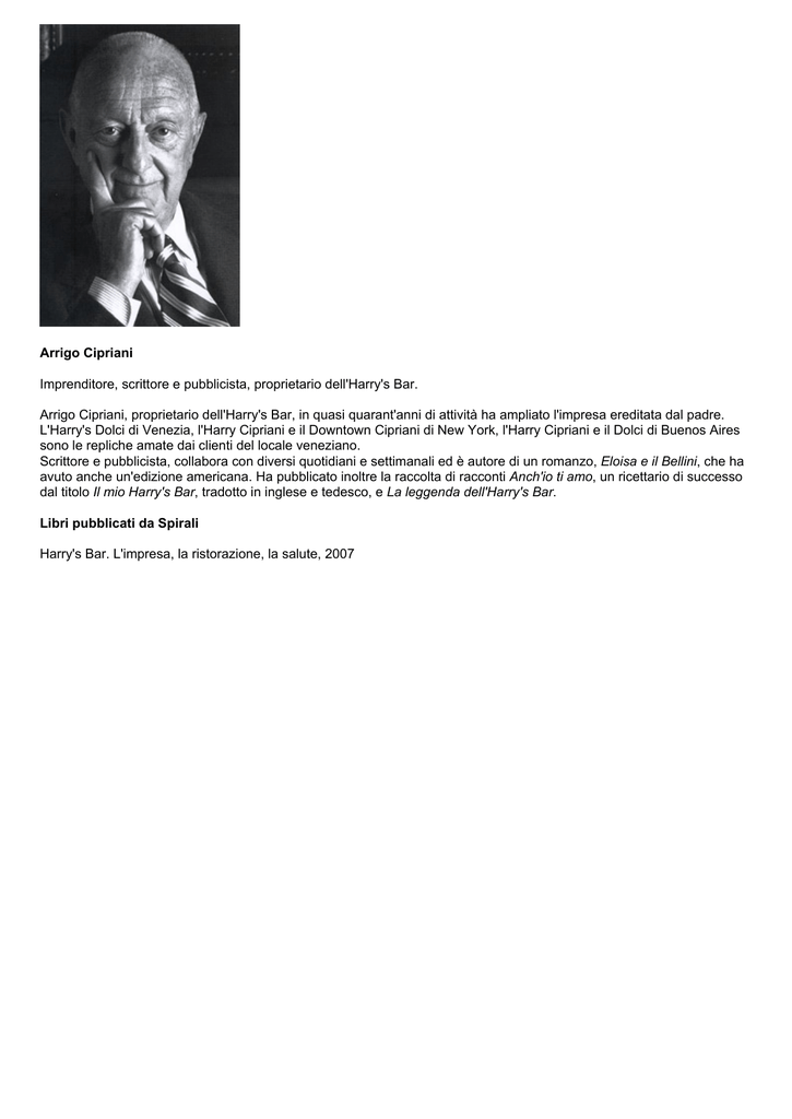 Arrigo Cipriani Imprenditore, scrittore e pubblicista, proprietario dell'Harry's Bar. Arrigo Cipriani, proprietario dell'Harry's Bar, in quasi quarant'anni di attività ha ampliato l'impresa ereditata dal padre. L'Harry's Dolci di Venezia, l'Harry Cipriani e il Downtown Cipriani di New York, l'Harry Cipriani e il Dolci di Buenos Aires sono le repliche amate dai clienti del locale veneziano. Scrittore e pubblicista, collabora con diversi quotidiani e settimanali ed è autore di un romanzo, Eloisa e il Bellini, che ha avuto anche un'edizione americana. Ha pubblicato inoltre la raccolta di racconti Anch'io ti amo, un ricettario di successo dal titolo Il mio Harry's Bar, tradotto in inglese e tedesco, e La leggenda dell'Harry's Bar. Libri pubblicati da Spirali Harry's Bar. L'impresa, la ristorazione, la salute, 2007