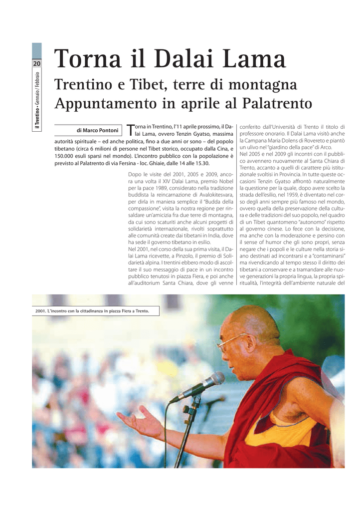 il Trentino • Gennaio / Febbraio 20 Torna il Dalai Lama Trentino e Tibet, terre di montagna Appuntamento in aprile al Palatrento T orna in Trentino, l’11 aprile prossimo, il Dalai Lama, ovvero Tenzin Gyatso, massima autorità spirituale – ed anche politica, fino a due anni or sono – del popolo tibetano (circa 6 milioni di persone nel Tibet storico, occupato dalla Cina, e 150.000 esuli sparsi nel mondo). L’incontro pubblico con la popolazione è previsto al Palatrento di via Fersina - loc. Ghiaie, dalle 14 alle 15.30. di Marco Pontoni Dopo le visite del 2001, 2005 e 2009, ancora una volta il XIV Dalai Lama, premio Nobel per la pace 1989, considerato nella tradizione buddista la reincarnazione di Avalokitesvara, per dirla in maniera semplice il “Budda della compassione”, visita la nostra regione per rinsaldare un’amicizia fra due terre di montagna, da cui sono scaturiti anche alcuni progetti di solidarietà internazionale, rivolti soprattutto alle comunità create dai tibetani in India, dove ha sede il governo tibetano in esilio. Nel 2001, nel corso della sua prima visita, il Dalai Lama ricevette, a Pinzolo, il premio di Solidarietà alpina. I trentini ebbero modo di ascoltare il suo messaggio di pace in un incontro pubblico tenutosi in piazza Fiera, e poi anche all’auditorium Santa Chiara, dove gli venne 2001. L’incontro con la cittadinanza in piazza Fiera a Trento. conferito dall’Università di Trento il titolo di professore onorario. Il Dalai Lama visitò anche la Campana Maria Dolens di Rovereto e piantò un ulivo nel “giardino della pace” di Arco. Nel 2005 e nel 2009 gli incontri con il pubblico avvennero nuovamente al Santa Chiara di Trento, accanto a quelli di carattere più istituzionale svoltisi in Provincia. In tutte queste occasioni Tenzin Gyatso affrontò naturalmente la questione per la quale, dopo avere scelto la strada dell’esilio, nel 1959, è diventato nel corso degli anni sempre più famoso nel mondo, ovvero quella della preservazione della cultura e delle tradizioni del suo popolo, nel quadro di un Tibet quantomeno “autonomo” rispetto al governo cinese. Lo fece con la decisione, ma anche con la moderazione e persino con il sense of humor che gli sono propri, senza negare che i popoli e le culture nella storia siano destinati ad incontrarsi e a “contaminarsi” ma rivendicando al tempo stesso il diritto dei tibetani a conservare e a tramandare alle nuove generazioni la propria lingua, la propria spiritualità, l’integrità dell’ambiente naturale del 21 il Trentino • Gennaio / Febbraio … il Trentino ha consolidato la sua amicizia con il popolo tibetano attraverso tutta una serie di progetti di solidarietà internazionale, avviati fin dal 2001… Tibet e così via. A riprova dello spirito “aperto” del XIV Dalai Lama, e del carattere innovatore del suo messaggio, vi è anche la decisione, assunta nel 2011, di rinunciare a rivestire ruoli politici, trasmettendo di fatto il potere temporale al primo ministro del Governo eletto dai tibetani della diaspora, attualmente Lobsang Sangay, che ha visitato a sua volta il Trentino nel febbraio 2012. Purtroppo, come le cronache anche recenti ci insegnano, la questione è ben lungi dall’essere risolta, anzi, si è se possibile inasprita. Non si fermano ancora, infatti, le autoimmolazioni di tibetani – monaci e anche laici – che per protestare contro l’occupazione del loro paese si danno fuoco, richiamando con questo gesto altri drammatici sacrifici, quelli dei monaci buddisti che 40 anni fa, nel Vietnam, testimoniavano così, con questo atto estremo e tragico, la loro opposizione alla guerra. Nel frattempo il Trentino ha consolidato la sua amicizia con il popolo tibetano attraverso tutta una serie di progetti di solidarietà internazionale, avviati fin dal 2001. I progetti sono in massima parte finanziati dalla Provincia autonoma e vengono realizzati in collaborazione con l’associazione Italia-Tibet e altre realtà trentine, come l’associazione Samten Choeling, e i partners tibetani. Sono progetti rivolti principalmente alle comunità tibetane in esilio in India, a Dharamsala, nella valle dello Spiti, nel Ladakh, nel Karnataka. I settori di intervento sono in primo luogo quelli dell’istruzione e della salute. In Trentino Alto Adige è presente anche una piccola comunità tibetana, composta da alcuni studenti universitari e da altri migranti, fra cui anche un lama medico (residente in Valsugana), impegnato nella salvaguardia della tradizione medica tibetana. III Qui sopra: alla Campana Maria Dolens di Rovereto con l’arcivescovo di Trento Luigi Bressan (2001). In basso: in Consiglio regionale con i presidenti Dellai e Durnwalder (2005) e con la piccola comunità tibetana che vive in regione (2009).
