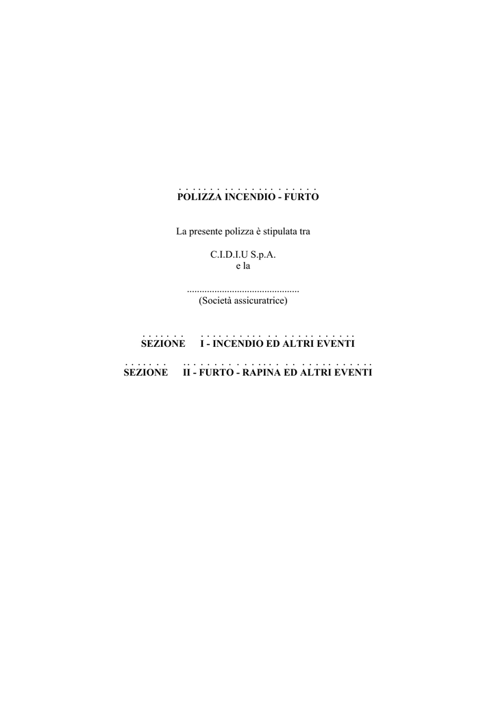 ..................... POLIZZA INCENDIO - FURTO La presente polizza è stipulata tra C.I.D.I.U S.p.A. e la ............................................. (Società assicuratrice) ....... ....................... SEZIONE I - INCENDIO ED ALTRI EVENTI ....... . ........................... SEZIONE II - FURTO - RAPINA ED ALTRI EVENTI DEFINIZIONI Nel testo della presente polizza di assicurazione le Parti attribuiscono, alle parole sotto riportate il significato di seguito indicato: PARTI ASSICURAZIONE POLIZZA SOCIETA’ CONTRAENTE CONTROLLATE ASSICURATO PREMIO IMPONIBILE PREMIO LORDO RISCHIO SINISTRO INDENNIZZO RISARCIMENTO FRANCHIGIA SCOPERTO BROKER Il Contraente e la Società Il complesso delle garanzie previste nella presente polizza II documento che, sottoscritto dalle Parti, comprova il contratto di assicurazione L'impresa di Assicurazione che stipula la polizza in nome proprio ovvero in qualità di Delegataria per conto delle Imprese Coassicuratrici (Art. 1911 del Codice Civile). II soggetto che stipula l'assicurazione. ovvero C.I.D.I.U S.p.a. e le sue controllate C.I.D.I.U. Servizi S.p.a. - Via Torino, 9 - 10093 Collegno (TO) Punto Ambiente S.r.l. - Via Torino, 9 - 10093 Collegno (TO) Il soggetto il cui interesse è protetto dall'assicurazione La somma dovuta dal Contraente alla Società quale corrispettivo dell'assicurazione, al netto delle sole imposte di assicurazione La somma dovuta dal Contraente alla Società quale corrispettivo dell'assicurazione, comprensivo delle imposte di assicurazione La probabilità che si verifichi il sinistro e l'entità dei danni che ne possono derivare Il verificarsi del fatto dannoso per il quale è prestata l'assicurazione La somma dovuta dalla Società in caso di sinistro La parte del danno indennizzabile che rimane a carico dell’ Assicurato La quota percentuale del danno determinabile che rimane a carico dell’ Assicurato L'intermediario di assicurazioni cui il Contraente ha affidato l'incarico di gestione della polizza. DESCRIZIONE DEL RISCHIO Il C.I.D.I.U. S.p.A. e le sue controllate svolgono attività amministrative e di servizio attinenti: − progettazione ed erogazione dei servizi di raccolta, trasporto e smaltimento di rifiuti solidi urbani e assimilabili, di raccolta differenziata, spezzamento strade, gestione di ecostazioni, gestione aree verdi; − gestione di discariche e di impianti di compostaggio; − ulteriori attività connesse. 2 NORME CHE REGOLANO L'ASSICURAZIONE IN GENERALE 1 - DICHIARAZIONI RELATIVE ALLE CIRCOSTANZE DEL RISCHIO Le dichiarazioni inesatte o le reticenze del Contraente relative a circostanze che influiscono sulla valutazione del rischio, possono comportare la perdita totale o parziale del diritto all'indennizzo, nonché la stessa cessazione dell'assicurazione (Artt.1892, 1893 e 1894 del Codice Civile). Tuttavia l'omissione, l'incompletezza o l'inesattezza delle dichiarazioni da parte del Contraente di circostanze eventualmente aggravanti il rischio, durante il corso della validità della presente polizza così come all'atto della sottoscrizione della stessa. non pregiudicano il diritto al completo indennizzo sempreché tali omissioni, incomplete o inesatte dichiarazioni non siano frutto di dolo del Contraente e siano avvenute in buona fede. 2 - ALTRE ASSICURAZIONI Si conviene tra le Parti che qualora si rivelasse che per gli stessi enti oggetto del presente contratto esistono o venissero in seguito stipulate altre polizze direttamente o da terzi che ne abbiano avuto interesse, gli eventuali danni denunciati dall'Assicurato a valere sulla presente polizza saranno liquidati ed indennizzati dalla Società direttamente all'Assicurato medesimo, a prescindere dall'esistenza di altri contratti assicurativi, fermo per la Società ogni altro diritto derivante a norma di legge (art. 1910 C.C.). Si esonera l'Assicurato dal darne preventiva comunicazione alla Società di eventuali polizze già esistenti e/o quelle che verranno in seguito stipulate sugli stessi enti oggetto del presente contratto; l'Assicurato ha facoltà di farlo in caso di sinistro, se ne è a conoscenza. 3 - PAGAMENTO DEL PREMIO Il Contraente é tenuto a pagare, presso la Direzione della Società o l'Agenzia alla quale é assegnata la polizza o al Broker, alle rispettive scadenze il premio stabilito nella polizza medesima. L'assicurazione ha effetto dalle ore 24 del giorno indicato in polizza, se il premio o la prima rata del premio sono corrisposti entro 60 giorni dalla data stessa; altrimenti ha effetto dalle ore 24 del giorno di pagamento. Se il Contraente non paga i premi o le rate di premio successive, l'assicurazione resta sospesa dalle ore 24 del 60° giorno dopo quello della scadenza e riprende vigore dalle ore 24 del giorno del pagamento, ferme le successive scadenze (art. 1901 C.C.). Ai sensi dell'art. 48 bis del DPR 602/1973 la Società da atto che : - l'Assicurazione conserva la propria validità anche durante il decorso delle eventuali verifiche effettuata dal Contraente ai sensi del Decreto Ministero economie e Finanze del 18 gennaio 2008 n° 40, ivi compreso il periodo di sospensione di 30 giorni di cui all'art. 3 del Decreto; - il pagamento effettuato dal Contraente direttamente all'Agente di Riscossione ai sensi dell'art. 72 bis del DPR 602/1973 costituisce adempimento ai fini dell'art. 1901 c.c. nei confronti della Società stessa." 4 - FORMA E VALIDITÀ DELLE COMUNICAZIONI Tutte le comunicazioni intercorrenti tra la Società ed il Contraente debbono essere fatte per mezzo di lettera raccomandata A.R. o telegramma. Le comunicazioni fra le Parti possono essere precedute da comunicazione per mezzo di telefax, cui dovrà seguire l'invio della comunicazione secondo quanto precedentemente stabilito. Le comunicazioni tra le Parti possono avvenire anche tramite il Broker incaricato: Marsh S.p.A. 5 - PROVA DELLA ASSICURAZIONE La polizza, le eventuali modifiche e/o integrazioni risultanti da Appendici successive debbono essere provate per iscritto me