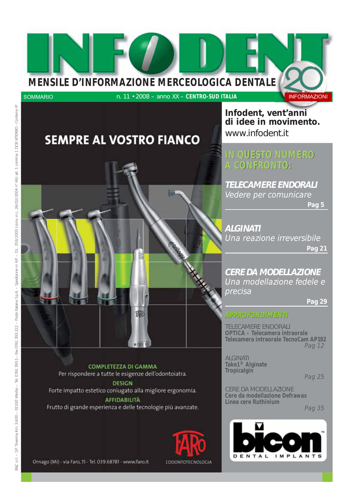 ® MENSILE D’INFORMAZIONE MERCEOLOGICA DENTALE B&C s.r.l. – S.P. Teverina Km. 3,600 – 01100 Viterbo – Tel. 0761.393.1– Fax 0761.393.222 – Poste Italiane S.p.A. – Spedizione in A.P. – D.L. 353/2003 (conv. in L. 26/02/2004 n° 46) art. 1 comma 1 DCB VITERBO - Contiene IP SOMMARIO n. 11 • 2008 – anno XX – CENTRO-SUD ITALIA INFORMAZIONI Infodent, vent’anni di idee in movimento. www.infodent.it IN QUESTO NUMERO A CONFRONTO: TELECAMERE ENDORALI Vedere per comunicare Pag 5 ALGINATI Una reazione irreversibile Pag 21 CERE DA MODELLAZIONE Una modellazione fedele e precisa Pag 29 APPROFONDIMENTI TELECAMERE ENDORALI OPTICA – Telecamera intraorale Telecamera intraorale TecnoCam AP192 Pag 12 ALGINATI Take1® Alginate Tropicalgin Pag 25 CERE DA MODELLAZIONE Cere da modellazione Defrawax Linea cere Ruthinium Pag 35 SOMMARIO ® MENSILE D’INFORMAZIONE MERCEOLOGICA DENTALE n. 11 Novembre 2008 – Anno XX – CENTRO-SUD ITALIA www.infodent.it ◗ A CONFRONTO: 5 7 TELECAMERE ENDORALI Vedere per comunicare ◗ DALLE AZIENDE: 36 Tabelle di comparazione ◗ APPROFONDIMENTI: 12 Direttore responsabile Riccardo Chiarapini Segreteria di redazione Stefano Toticchi Coordinamento Diana Carbonetti Direzione grafica Gisella Benedetti Consulenza scientifica e normativa Alberto Emiliani Collaboratore Cristina Rodighiero Impaginazione e grafica B&C s.r.l. – divisione grafica Marketing e Pubblicità Gianluca Passeri tel. 0761.393306 – 335.1213136 Baldo Pipitone tel. 06.97277679 – 336.773328 Mensile d’informazione merceologica dentale ANNO XX – n. 11 novembre 2008 Poste Italiane S.p.A. – Spedizione in A.P. – D.L. 353/2003 (conv. in L. 26/02/2004 n° 46) art. 1 comma 1 DCB VITERBO – Autorizzazione del Tribunale di Viterbo n. 341 del 7/12/88 Editore B&C s.r.l. Strada Teverina Km. 3,600 – 01100 VITERBO Telefono 0761.393.1 – Fax 0761.393.222 ◗ AGENDA: 13 18 Testata volontariamente sottoposta a certificazione di tiratura e diffusione in conformità al Regolamento C.S.S.T. Certificazione Stampa Specializzata Tecnica Per il periodo 1/1/2007 – 31/12/2007 Tiratura media: 18.444 Diffusione media: 18.075 Certificato CSST n. 2007–1.506 del 27.02.08 Società di Revisione: BDO Sala Scelsi Farina Tiratura del presente numero: 19.500 una copia euro 0,77 – contiene I.P. La redazione non restituisce il materiale utilizzato Congressi e Fiere in Italia e all’estero (Novembre/Dicembre/Gennaio) Calendario dei Corsi (Dicembre/Gennaio) ◗ A CONFRONTO: 21 ALGINATI 23 Tabelle di comparazione Una reazione irreversibile ◗ APPROFONDIMENTI: 25 • Take 1® Alginate • Tropicalgin ◗ NOTEBOOK: 26 Stampa – Graffietti Stampati snc S.S. Umbro Casentinese Km. 4,500 Montefiascone (VT) • OPTICA – Telecamera intraorale • Telecamera intraorale TecnoCam AP192 • Con Infodent la comunicazione a 361 gradi, uno in più del previsto • Rubrica “A confronto” ◗ A CONFRONTO: 29 CERE DA MODELLAZIONE 31 Tabelle di comparazione Una modellazione fedele e precisa ◗ APPROFONDIMENTI: 35 • Cere da modellazione Defrawax • Linea cere Ruthinium • Videothron e Dolphin Dentalsoft 360 • I-Max Touch • MESODAMIANI • MiniUniko surgery-motor • Impianti Duravit Inn • Caes Software • Autoclave Full Clave B16 B20 classe B • i-FIX di FMD: più di un semplice impianto ◗ IN VETRINA: 42 Ogni mese i prodotti in offerta proposti dagli operatori ◗ ANNUNCI ECONOMICI: 43 Annunci gratuiti di offerta e ricerca collaborazione, offerta e ricerca attrezzatura, offerta e ricerca attività ◗ INSERZIONISTI • 3 Direct pag. 19 • Abacus pag. 40 • Alpha Test pag. 39 • Archint pag. 13 • B&C pag. 11 • Bicon pag. I Cop. • Caes Software pag. 38 • Casa Schmidt pag. 4 • Class Implant pag. 26 • Defradental pag. 35 • Dental Manufacturing – Ruthinium pag. 35 • Dental SB pag. 12 • Dolphin Computer pag. 44 • EMS pag. 37 • Eurocompress pag. 42 • Eurodent/Vimar pag. III Cop. • Falappa pag. 18 • Faro pagg. I Cop./12 • Fodent pag. 27 • Ilic’ Dr. Riccardo pag. 28 • Impladent pag. 45 • Implantomat pag. 41 • Kerr Italia pag. 25 • Manfredi pag. 43 • Mariotti pagg. 25/42 • Mealli Laboratorio Odontotecnico pag. 46 • Mectron pagg. 13/15 • Medical Division pag. 19 • Messana pag. 16 • Metal Store pagg. 26/42 • Multysystem pagg. 35/42 • Orthopost pag. 20 • Orthopro Teknica pag. II Cop. • Orthosystem Roma pag. 45 • Physioline pag. 14 • Promed pag. 17 • Samdent pag. 15 • Suite Medicale – Fornilimplant pag. IV Cop. • TecnoMed pagg. 3/12 • Zhermack pag. 25 Informativa ai lettori – Questa rivista Le è stata inviata tramite abbonamento, l’indirizzo in nostro possesso verrà utilizzato per l’invio della rivista, per l’invio di altre riviste, per l’inoltro di proposte di abbonamento, per l’invio di informazioni tecniche e commerciali, nonché per la divulgazione di eventi formativi e promozionali e per la cessione degli stessi a terze aziende per le medesime finalità. In ogni momento potrete esercitare i diritti di cui all’art. 7 del D. Lgs 196/2003, e quindi conoscere, ottenere la cancellazione, la rettificazione, l’aggiornamento e l’integrazione dei Vostri dati, nonché opporVi al loro utilizzo per le finalità su indicate. Qualora venisse esercitato il diritto alla cancellazione lo stesso comporterebbe il mancato invio della presente rivista. Il titolare del trattamento è B&C srl con sede in Viterbo, Strada Teverina Km 3,600, nella persona del suo legale rappresentante. elenco completo dei confronti 2009 sul sito WWW.COMPARAZIONI.COM INFODENT 11/2008 - 5 A CONFRONTO TELECAMERE ENDORALI A CONFRONTO Vedere per comunicare La telecamera endorale è una delle più recenti metodologie di diagnostica per immagini in odontoiatria nata grazie allo sviluppo dell’elettronica e dell’informatica. La nascita della telecamera si basa sulla volontà di ampliare l’applicazione dell’endoscopio in campo dentale. Modificando la tecnologia vera