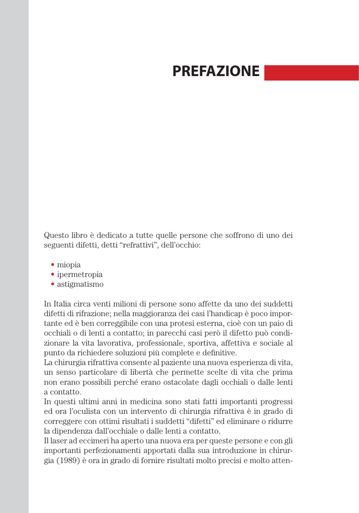 PREFAZIONE Questo libro è dedicato a tutte quelle persone che soffrono di uno dei seguenti difetti, detti “refrattivi”, dell’occhio: • miopia • ipermetropia • astigmatismo In Italia circa venti milioni di persone sono affette da uno dei suddetti difetti di rifrazione; nella maggioranza dei casi l’handicap è poco importante ed è ben correggibile con una protesi esterna, cioè con un paio di occhiali o di lenti a contatto; in parecchi casi però il difetto può condizionare la vita lavorativa, professionale, sportiva, affettiva e sociale al punto da richiedere soluzioni più complete e definitive. La chirurgia rifrattiva consente al paziente una nuova esperienza di vita, un senso particolare di libertà che permette scelte di vita che prima non erano possibili perché erano ostacolate dagli occhiali o dalle lenti a contatto. In questi ultimi anni in medicina sono stati fatti importanti progressi ed ora l’oculista con un intervento di chirurgia rifrattiva è in grado di correggere con ottimi risultati i suddetti “difetti” ed eliminare o ridurre la dipendenza dall’occhiale o dalle lenti a contatto. Il laser ad eccimeri ha aperto una nuova era per queste persone e con gli importanti perfezionamenti apportati dalla sua introduzione in chirurgia (1989) è ora in grado di fornire risultati molto precisi e molto atten- Miopia, Astigmatismo, Ipermetropia e Presbiopia, Correzione Laser E Chirurgica dibili; ma esso fornisce risultati ottimali solo quando ci sono nell’occhio condizioni idonee cioè quando il difetto non è forte, quando la cornea ha uno spessore sufficiente, quando la pupilla, in condizioni di poca luce, non si dilata troppo. Ci sono molti occhi cioè in cui il laser non può essere utilizzato. In tutti questi casi si può prendere in considerazione l’impianto di un cristallino artificiale. La decisione di trattare il difetto spetta solamente al paziente. Il paziente deve avere aspettative realistiche e la decisione deve essere basata su fatti e non su speranze o su idee sbagliate. Questo libro si propone di fornire una spiegazione elementare di ciascuno di questi difetti, di dare una descrizione semplice ma chiara delle possibilità di correzione e di mettere in evidenza i vantaggi ma anche i possibili rischi legati all’intervento. Raccomando perciò di leggerlo con molta attenzione. Lucio Buratto 2 PARTE A ANATOMIA DELL’APPARATO VISIVO Miopia, Astigmatismo, Ipermetropia e Presbiopia, Correzione Laser E Chirurgica 4 1 ANATOMIA DELL’APPARATO VISIVO (da La vista umana) utti gli organi di senso (sono disposti alla periferia dell’organismo e) mettono l’uomo in relazione col mondo esterno; tramite questi organi l’uomo è in grado di conoscere le proprietà fisiche degli oggetti e dell’ambiente nel quale vive. I sensi sono la principale, se non probabilmente l’unica sorgente per la elaborazione delle idee; sono quindi essenziali per gli atti della psiche. Inoltre sono delle vere e proprie sentinelle avanzate che proteggono indicando i pericoli da cui difendersi volontariamente o per reazione riflessa. Le informazioni che arrivano agli organi di senso vengono trasportate al cervello che le elabora trasformandole così in sensazioni; si hanno così sensazioni tattili, gustative, olfattive, uditive e visive. Il senso della vista reagisce alla luce e ci dà informazioni su forma, grandezza, distanza e colore degli oggetti luminosi o illuminati e non solo questo. Il fulcro del senso della vista è il globo o bulbo oculare, ma per avere le sensazioni visive sono necessari anche gli annessi oculari e le vie nervose; l’apparato visivo comprende quindi gli annessi, il bulbo oculare e le vie nervose. Gli annessi oculari sono: orbita, muscoli extraoculari, palpebre, apparato lacrimale, congiuntiva T Miopia, Astigmatismo, Ipermetropia e Presbiopia, Correzione Laser E Chirurgica Orbita Figura 1. Bulbo in sezione Si tratta di una struttura ossea a forma conica con l’apice rivolto posteriormente. Essa contiene il bulbo oculare, i muscoli extraoculari, il grasso orbitario ed altre strutture. L’orbita ha essenzialmente una funzione protettiva per il bulbo oculare; essa è legata anche ai tessuti molli presenti nell’orbita e al sopracciglio. (Figure 1 e 2) Muscoli extraoculari. Figura 2. Bulbo nell’orbita Figura 3. Bulbo con muscoli Sono sei muscoli di tipo striato che fanno muovere il bulbo oculare nelle varie direzioni di sguardo: sono il piccolo obliquo ed il grande obliquo, il retto superiore, il retto inferiore, il retto laterale ed il retto mediale. I muscoli di ciascun occhio lavorano in modo complementare in maniera da tenere sempre i due occhi in una posizione per cui immagini sostanzialmente uguali di oggetti cadono su punti retinici corrispondenti. Nell’orbita esiste anche un settimo muscolo, l’elevatore della palpebra, che, come dice il nome, fa elevare la palpebra superiore. (Figura 3) Palpebre. Esistono una palpebra superiore ed una inferiore; hanno la funzione di proteggere il bulbo oculare. A questa funzione partecipano attivamente anche le ciglia. Dall’esterno all’interno le palpebre sono formate da uno strato cutaneo, da uno strato muscolare e da uno fibroso (tarso); quest’ultimo è ricoperto dalla congiuntiva. I muscoli della palpebra sono il muscolo orbicolare che serve a serrare le palpebre, il muscolo elevatore che alza la palpebra superiore e il muscolo di Muller; quest’ultimo muscolo è formato da fibre lisce ed è presente in entrambe le palpebre di ciascun occhio, per quasi tutta la loro larghezza. Quello della palpebra superiore favorisce la sospensio6 ANATOMIA DELL’APPARATO VISIVO ne elastica della palpebra e serve a regolare l’ampiezza della rima palpebrale; quello della palpebra inferiore induce un abbassamento della stessa. (Figura 4) Apparato lacrimale. Percorso delle lacrime L’apparato lacrimale comprende la ghiandola lacrimale principale, le ghiandole lacrimali accessorie e le vie di deflusso. La ghia