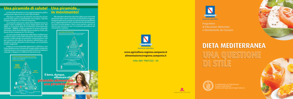 Una piramide di salute! Una piramide... La Piramide alimentare è una rappresentazione grafica in movimento! utilizzata per descrivere un certo tipo di dieta. Alla base si collocano gli alimenti che devono essere assunti tutti i giorni e, procedendo verso l’apice, i cibi che bisogna utilizzare con minore frequenza. La piramide alimentare della Dieta Mediterranea ha subito molte modifiche nel corso degli ultimi anni. Nel 2009, in occasione della III Conferenza Internazionale CIISCAM - INRAN, è stata proposta la nuova piramide alimentare della Dieta Mediterranea moderna rivolta alla fascia di età compresa tra 18 e 65 anni. La nuova piramide alimentare della Dieta mediterranea moderna tiene conto dell’evoluzione dei tempi e della società, evidenziando innanzitutto comportamenti utili per condurre uno stile di vita salutare: attività fisica, convivialità a tavola, abitudine a bere acqua, uso di prodotti locali e stagionali. Inoltre, la nuova piramide alimentare si riferisce a una Dieta Mediterranea rivisitata all’insegna della modernità e del benessere, senza trascurare però le diverse tradizioni culturali e religiose e le differenti identità locali. Alle abitudini alimentari descritte dalla nuova piramide alimentare deve essere associata un’attività fisica regolare, fondamentale tanto quanto una alimentazione equilibrata per il raggiungimento ed il mantenimento del benessere sia fisico sia psicologico. Non si può parlare, quindi, di stile di vita corretto se non c’è la pratica quotidiana del movimento corporeo. Assessorato Agricoltura Programma di Educazione Alimentare e Orientamento dei Consumi DIETA MEDITERRANEA Assessorato Agricoltura UNA QUESTIONE DI STILE www.agricoltura.regione.campania.it [email protected] Info: 081 7967322 - 24 È bene, dunque, affiancare alla piramide alimentare una piramide motoria. In collaborazione con il Dipartimento di Scienza degli Alimenti dell’Università degli Studi di Napoli Federico II [email protected] |0823 543296 Presentazione La Campania è una delle più importanti regioni del Bacino del Mediterraneo. Con una popolazione di quasi sei milioni di persone, di cui oltre il 25% al di sotto dei 20 anni di età e 1 milione in età scolare siamo la regione più giovane d’Italia. Patria della Dieta Mediterranea, riconosciuta dall’UNESCO patrimonio culturale immateriale dell’umanità, la Campania è da sempre apprezzata per la bellezza del territorio e per lo straordinario patrimonio enogastronomico, architettonico e culturale. In questo contesto l’agricoltura, nuova frontiera del cibo genuino, gioca un ruolo fondamentale per la promozione, la tutela, la conservazione e la valorizzazione del paesaggio rurale. Oltre l’80% del territorio regionale, infatti, è rappresentato dalle aree rurali (aree agricole, a pascolo, forestali) che sono in grado di assicurare sicurezza alimentare, manutenzione e sicurezza del territorio, cura del paesaggio, tutela della biodiversità e conservazione del patrimonio storico, ambientale e culturale. E la Dieta Mediterranea? È soprattutto recupero della buona tavola, della cultura del cibo, di uno stile di vita sano che, proprio nei nostri territori, è stato studiato; un ritorno alle tradizioni rurali che non può non coinvolgere direttamente le nuove generazioni. Il nostro intento, pertanto, è quello di coinvolgere i cittadini per avvicinarli al mondo rurale, interessando soprattutto i più giovani. Lo facciamo con un approccio ludico, interattivo e più attraente, evidenziando il legame che unisce ambiente, territorio, alimentazione e salute attraverso un articolato programma di Educazione Alimentare e Orientamento dei Consumi che vede in prima linea, ancora una volta, le Fattorie Didattiche. On. Daniela Nugnes Assessore all’Agricoltura della Regione Campania La Dieta Mediterranea è un modello nutrizionale ispirato ai regimi alimentari tradizionali dei Paesi del bacino del Mediterraneo (Italia, Spagna, Grecia e paesi del Nord Africa). Frutta e verdura di stagione, da assumere a volontà, pane, pasta, cereali come fonti principali di energia, olio extravergine di oliva, da consumare con moderazione, pesce, latte, formaggi e carni, da utilizzare saltuariamente, sono gli ingredienti base della Dieta Mediterranea, dichiarata nel 2010 dall’UNESCO Patrimonio culturale e immateriale dell’umanità. La Dieta Mediterranea rappresenta il regime alimentare più sano ed equilibrato. Essa associa varietà alimentare e completezza nutrizionale, garantendo gusto e benessere. Tuttavia, Dieta Mediterranea non è soltanto sinonimo di regime alimentare ma anche di: • Stile di vita, fondato sull’adozione di comportamenti alimentari corretti, sul rispetto del territorio e della biodiversità, sul consumo di prodotti locali, stagionali e freschi, sulla valorizzazione e tutela delle attività tradizionali e dei mestieri collegati alla pesca e all’agricoltura. • Stile di vita attivo, basato sul movimento e l’attività fisica. ELISIR DI LUNGA VITA La valorizzazione della Dieta Mediterranea risale ai primi anni del dopoguerra ed è merito di Ancel Benjamin Keys, nutrizionista statunitense della scuola di Alimentazione dell’Università del Minnesota, che negli anni ‘50 riconobbe l’influenza positiva dell’alimentazione sulla prevenzione delle patologie cardiovascolari. Keys, sbarcato a Salerno durante la seconda guerra mondiale, prese dimora a Pioppi, paese nel Parco nazionale del Cilento, e avviò il celebre “studio dei sette Paesi“ finalizzato a confrontare lo stile di vita di campioni di popolazione di Stati Uniti, Italia, Finlandia, Grecia, Yugoslavia, Paesi Bassi e Giappone. I risultati della sua ricerca dimostrarono che le popolazioni del bacino del Mediterraneo presentavano una longevità e un’indennità da malattie cardiovascolari e degenerative molto elevate rispetto alle popolazioni del Nord Europa e degli Stati Uniti. Egli attribuì queste caratteristiche al tipo di alimentazione 