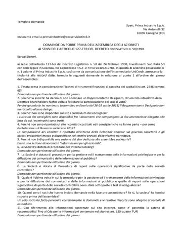 Template Domande Spett. Prima Industrie S.p.A. Via Antonelli 32 10097 Collegno (TO) Inviata via email a [email protected] DOMANDE DA PORRE PRIMA DELL'ASSEMBLEA DEGLI AZIONISTI AI SENSI DELL'ARTICOLO 127‐TER DEL DECRETO DEGISLATIVO N. 58/1998 Egregi Signori, ai sensi dell'articolo 127‐ter del Decreto Legislativo n. 58 del 24 febbraio 1998, Investimenti Sud Italia Srl con sede legale in Cosenza, via Capoderose 4 C.F. e P.IVA 02407210786, in qualità di azionista possessore di n. 1 azione di Prima Industrie S.p.A. cosí come da comunicazione dell'intermediario UniCredit attestante la titolaritá alla record date, formula le seguenti domande in relazione al punto 1 all'ordine del giorno dell'assemblea: 1. E'stata presa in considerazione l'ipotesi di strumenti finanziari di raccolta dei capitali (ex art. 2346 comma 6)? Domanda non pertinente all’ordine del giorno. 2. Perche' la societa' ha deciso di non nominare un Rappresentante Designato, strumento introdotto dalla Direttiva Shareholders Rights volta a facilitare la partecipazione dei soci al voto? Perché quando lo ha nominato (assemblea ordinaria del 28‐29 aprile 2011) il Rappresentante Designato non ha raccolto alcuna delega. 3. Perche' non sono disponibili sul sito i curriculum del consiglieri? I curricula dei consiglieri sono disponibili fra i documenti che compongono la documentazione allegata alla lista da cui i nominativi sono tratti. 4. Perché non sono riportati sul sito i comitati costituiti ed i consiglieri che ne fanno parte – per come da Relazione sul Governo societario 2012? La composizione dei comitati è riportata all’interno della Relazione annuale sul governo societario e gli assetti proprietari messa a disposizione nei termini previsti dalla vigente normativa. 5. Perché non é disponibile una sezione del sito dedicata alle assemblee societarie? Esiste una sezione denominata “Informazioni per gli azionisti”. 6. La Societa'e'dotata di procedure per Internal Dealing? Domanda non pertinente all’ordine del giorno. 7. La Societá é dotata di procedure per la gestione ed il trattamento delle informazioni privilegiate e per la diffusione dei comunicati e delle informazioni al pubblico? Domanda non pertinente all’ordine del giorno. 8. La Societá é dotata di Procedura di report sulle operazioni significative da parte delle società controllate? Domanda non pertinente all’ordine del giorno. 9. Quale é l'ultima volta in cui le procedure per la gestione ed il trattamento delle informazioni privilegiate e per la diffusione dei comunicati e delle informazioni al pubblico e quelle di report sulle operazioni significative da parte delle societá controllate sono state sottoposte a test di adeguatezza? Domanda non pertinente all’ordine del giorno. 10. Quanti sono i soci che hanno inviato domande nella fase pre‐assembleare? Se si, la societa' ha fornito risposte prima dell'assemblea? Un solo socio ha fatto pervenire correttamente le domande e le relative risposte sono allegate al verbale di assemblea. 11. Con riferimento alle informazioni contenute sul sito internet, come e' garantita la catena di responsabilita' fino al Cda per le informazioni contenute nel sito (ex art. 125‐quater TUF) Domanda non pertinente all’ordine del giorno. 12. Quali sono i livelli di certificazione della correttezza delle informazioni sul sito? Domanda non pertinente all’ordine del giorno. 13. I comunicati stampa sono approvati dal CdA? chi e' responsabile del contenuto? Domanda non pertinente all’ordine del giorno. 14. Quali sono le risorse adibite dalla Societa' per la gestione dei rapporti con gli azionisti al di lá del canale email/fax/telefono all'Investo relator? Domanda non pertinente all’ordine del giorno. 15. Ha la Societa' valutato l'opportunita' di sostenere la formazione di un'associazione piccoli azionisti o un club degli azionisti volto alla condivisione delle informazioni con e tra i soci retail? Domanda non pertinente all’ordine del giorno. 16. Perche' la Societá non ha ritenuto opportuno redigere un bilancio di sostenibilitá? Perché il rapporto costi/benefici non è ritenuto economicamente vantaggioso per la Società. 17. Quali sono i meccanismi esistenti nella struttura societaria che sostengo l'equilibrio tra i generi e le pari opportunita'di accesso a ruoli direzionali? Domanda non pertinente all’ordine del giorno. 18. Quale e' il budget di spesa assegnato al comitato di controllo interno e/o all'internal auditor per l'espletamento delle loro funzioni? Domanda non pertinente all’ordine del giorno 19. L'ultimo aggiornamento del Modello Organizzativo previsto dal D.Lgs 231/2001 é stato affidato a consulente esterno? Domanda non pertinente all’ordine del giorno 20. Quante riunioni dell'Organismo di Vigilanza si sono tenute nel corso dell'esercizio? Domanda non pertinente all’ordine del giorno 21. Il Collegio sindacale o i singoli sindaci si sono avvalsi di ausiliari cosí come previsto dall'art. 2403‐bis Cod Civ? No 22. Quante operazioni con parti correlate non sono state soggette alle procedure previste dal regolamento Consob perche'inferiori ai limiti previsti dal regolamento stesso? Domanda non pertinente all’ordine del giorno 23. Quante richieste di informazioni ex art. 115 D.Lgs 58/1998 da parte di Consob sono state ricevute dalla Societá ed dal Collegio Sindacale nel corso dell'esercizio? Nessuna Distinti saluti Cosenza 19/4/2013 Investimenti Sud Italia L'Amministratore Unico 1 www.marcobava.it TORINO .2013 DOMANDE DEL SOCIO MARCO BAVA PER L’ASSEMBLEA RISPOSTA IN ASSEMBLEA PRIMA IND Art. 127-ter (D. Lgs n. 58/1998) (Diritto di porre domande prima dell'assemblea) 1. I soci possono porre domande sulle materie all'ordine del giorno anche prima dell'assemblea. Alle domande pervenute prima dell'assemblea è data risposta al più tardi durante la stessa. La società può fornire una risposta unitaria alle domande aventi lo stesso contenuto. 2. Non è dovuta una risposta quando le info
