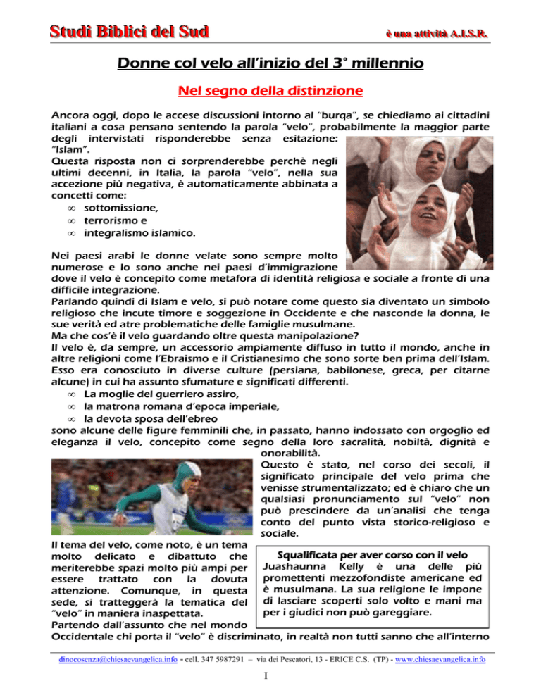 Studi Biblici del Sud èè uunnaa aattttiivviittàà A A..II..SS..R R.. Donne col velo all’inizio del 3° millennio Nel segno della distinzione Ancora oggi, dopo le accese discussioni intorno al “burqa”, se chiediamo ai cittadini italiani a cosa pensano sentendo la parola “velo”, probabilmente la maggior parte degli intervistati risponderebbe senza esitazione: “Islam”. Questa risposta non ci sorprenderebbe perchè negli ultimi decenni, in Italia, la parola “velo”, nella sua accezione più negativa, è automaticamente abbinata a concetti come: • sottomissione, • terrorismo e • integralismo islamico. Nei paesi arabi le donne velate sono sempre molto numerose e lo sono anche nei paesi d’immigrazione dove il velo è concepito come metafora di identità religiosa e sociale a fronte di una difficile integrazione. Parlando quindi di Islam e velo, si può notare come questo sia diventato un simbolo religioso che incute timore e soggezione in Occidente e che nasconde la donna, le sue verità ed atre problematiche delle famiglie musulmane. Ma che cos’è il velo guardando oltre questa manipolazione? Il velo è, da sempre, un accessorio ampiamente diffuso in tutto il mondo, anche in altre religioni come l’Ebraismo e il Cristianesimo che sono sorte ben prima dell’Islam. Esso era conosciuto in diverse culture (persiana, babilonese, greca, per citarne alcune) in cui ha assunto sfumature e significati differenti. • La moglie del guerriero assiro, • la matrona romana d’epoca imperiale, • la devota sposa dell’ebreo sono alcune delle figure femminili che, in passato, hanno indossato con orgoglio ed eleganza il velo, concepito come segno della loro sacralità, nobiltà, dignità e onorabilità. Questo è stato, nel corso dei secoli, il significato principale del velo prima che venisse strumentalizzato; ed è chiaro che un qualsiasi pronunciamento sul “velo” non può prescindere da un’analisi che tenga conto del punto vista storico-religioso e sociale. Il tema del velo, come noto, è un tema Squalificata per aver corso con il velo molto delicato e dibattuto che meriterebbe spazi molto più ampi per Juashaunna Kelly è una delle più essere trattato con la dovuta promettenti mezzofondiste americane ed attenzione. Comunque, in questa è musulmana. La sua religione le impone sede, si tratteggerà la tematica del di lasciare scoperti solo volto e mani ma per i giudici non può gareggiare. “velo” in maniera inaspettata. Partendo dall’assunto che nel mondo Occidentale chi porta il “velo” è discriminato, in realtà non tutti sanno che all’interno [email protected] - cell. 347 5987291 – via dei Pescatori, 13 - ERICE C.S. (TP) - www.chiesaevangelica.info I Studi Biblici del Sud èè uunnaa aattttiivviittàà A A..II..SS..R R.. di alcune comunità cristiane il velo costituisce un motivo di discriminazione al contrario. Si, nel senso che vengono discriminate le donne che non mettono il “velo” durante gli incontri religiosi; e si prendono le distanze da intere comunità (chiese) che non lo rendono obbligatorio per i loro fedeli. Le ragioni, tra virgolette, bibliche fanno eco ad un brano contenuto in una epistola dell’apostolo Paolo. Vediamolo insieme. 1Corinzi 11:3 Ma io voglio che sappiate che il capo d'ogni uomo è Cristo, che il capo della donna è l'uomo, e che il capo di Cristo è Dio. 1Corinzi 11:4 Ogni uomo che prega o profetizza a capo coperto, fa disonore al suo capo; 1Corinzi 11:5 ma ogni donna che prega o profetizza senz'avere il capo coperto da un velo, fa disonore al suo capo, perché è lo stesso che se fosse rasa. 1Corinzi 11:6 Perché se la donna non si mette il velo, si faccia anche tagliare i capelli! Ma se è cosa vergognosa per una donna il farsi tagliare i capelli o radere il capo, si metta un velo. 1Corinzi 11:7 Poiché, quanto all'uomo, egli non deve velarsi il capo, essendo immagine e gloria di Dio; ma la donna è la gloria dell'uomo; 1Corinzi 11:8 perché l'uomo non viene dalla donna, ma la donna dall'uomo; 1Corinzi 11:9 e l'uomo non fu creato a motivo della donna, ma la donna a motivo dell'uomo. 1Corinzi 11:10 Perciò la donna deve, a motivo degli angeli, aver sul capo un segno dell'autorità da cui dipende. 1Corinzi 11:11 D'altronde, nel Signore, né la donna è senza l'uomo, né l'uomo senza la donna. 1Corinzi 11:12 Poiché, siccome la donna viene dall'uomo, così anche l'uomo esiste per mezzo della donna, e ogni cosa è da Dio. 1Corinzi 11:13 Giudicatene voi stessi: È egli conveniente che una donna preghi Iddio senz'esser velata? 1Corinzi 11:14 La natura stessa non v'insegna ella che se l'uomo porta la chioma, ciò è per lui un disonore? 1Corinzi 11:15 Mentre se una donna porta la chioma, ciò è per lei un onore; perché la chioma le è data a guisa di velo. 1Corinzi 11:16 Se poi ad alcuno piace d'esser contenzioso, noi non abbiamo tale usanza; e neppure le chiese di Dio. [email protected] - cell. 347 5987291 – via dei Pescatori, 13 - ERICE C.S. (TP) - www.chiesaevangelica.info II Studi Biblici del Sud èè uunnaa aattttiivviittàà A A..II..SS..R R.. Dall’equivoco alla verità Frequentando le comunità cristiane mi è capitato di osservare che le credenti, pur di ottemperare a questa disposizione di Paolo, si sono trovate a sistemare sul loro capo da delicati cappellini (in allineate corali) a fazzolettini attaccati ai capelli con un piccolo ferretto (forse per far fronte ad una colpevole dimenticanza), ma certamente il copricapo più diffuso, in simile ambiente, è sicuramente la “veletta” (trapuntata, generalmente bianca o altro colore chiaro). Fra l’altro non di rado lasciata scivolare sulle spalle, specialmente se si tengono bambini in braccio che vengono attratti dall’insolito ornamento. Realmente tale “veletta” viene usata solo nell’ambito delle riunioni in chiesa (culto, preghiera) e qualcuno la userà anche nei momenti di preghiera in casa, ma assolutamente accantonata nella quotidianità della